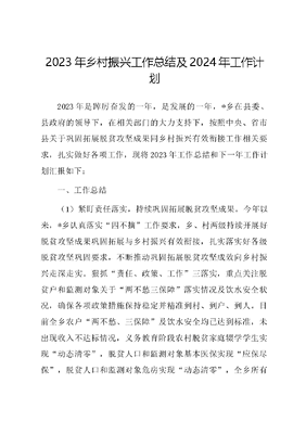2023年乡村振兴工作总结及2024年工作计划2023年是踔厉奋发的一年,是发展的一年,*乡在县委、县政府的领导下,在相关部门的大力支持下,按照中央、省市县关于巩固拓展脱贫攻坚成果同乡村振兴有效衔接工作相关要求,扎实做好各项工作,现将2023年工作总结和下一年工作计划汇报如下:一、工作总结(1)紧盯责任落实,持续巩固拓展脱贫攻坚成果。今年以来,*乡认真落实四不摘工作要求,乡、村两级持续开展好脱贫攻坚成果巩固拓展与乡村振兴有效衔接,扎实落实好各级脱贫攻坚巩固要求,不断推动巩固拓展脱贫攻坚成效向乡村振兴走深走实。狠抓责任、政策、工作三落实,重点关注脱贫户和监测对象关于两不愁三保障落实情况及饮水安全状况,确保各项政策措施保持稳定并精准到村、到户、到人。目前全乡农户两不愁、三保障及饮水安全均已达到标准,未出现收入不达标情况,义务教育阶段农村脱贫家庭辍学学生实现动态清零,脱贫人口和监测对象基本医保实现应保尽保,脱贫人口和监测对象危房实现动态清零,全乡所有房屋安全稳固有保障,全乡饮水安全未发现隐患、未发现供水不足、水质较差等问题,全乡全面落实并维持主要帮扶政策的稳定性和延续性,让教育、医疗、住房、饮水、兜底保障等民生保障普惠政策稳中向好发展。(2)关注底线问题,常态化抓实抓好监测帮扶。全乡严格落实国家和省、市、县关于防止返贫动态监测和帮扶政策,按照早发现、早干预、早帮扶的总要求,做到应纳尽纳、应扶尽扶、应退尽退。详细部署2023年防止返贫动态监测工作,细化工作职责,对全乡脱贫户、监测对象和常住人口进行常态化全面排查,2023年以来共开展过*次防止返贫动态监测工作,*次集中排查。截至目前,共有脱贫户*户*人,有三类监测对象*户*人,脱贫不稳定户*户*人,边缘易致贫户*户*人,突发严重困难户*户*人;其中:已消除风险*户*人;新识别突发严重困难户*户*人,消除风险突发严重困难户*户*人,消除风险脱贫不稳定户*户*人。(3)聚焦农户收入,开展收入排查重点工作。2023年按上级要求制定《*乡关于开展实施2023年防止返贫监测帮扶集中排查工作方案》,共开展过*次收入排查工作,通过*个村(社区)挂村领导、包村部门及各工作队下沉到一线参与排查工作的方式,在2022年度防返贫动态监测信息采集录入工作基础上,认真做好分析研判,进一步组织开展全乡脱贫户、现有监测对象、及符合条件的五类人员进行拉网式全面排查工作,做到不漏一户、不落一人,确保入户采集信息真实、准确、可靠。截至目前,全乡所有脱贫户、现有监测对象及新识别监测对象的一至三季度入户采集工作已完成,共采集收入*户*人。(4)持续加大脱贫劳动力转移输出。我乡不断加强脱贫劳动力转移就业力度,并持续加大乡村公益岗位开发力度。各村(社区)坚持每月开展一次脱贫劳动力务工监测,截至目前,全乡共有*人次脱贫劳动力外出务工,同比去年增*%。目前,县、乡两级共开发公益岗位*人并由乡社保中心组织好全乡劳动力情况摸排,建立好各村(社区)劳动力四个清单,按计划组织开展好我乡劳动技能培训,确保乡内不能外出务工劳动力能掌握一技之长,稳定增收。(5)落实好过渡期小额贴息贷款政策。作为能有效解决脱贫户及监测户产业发展资金需求的普惠政策。我乡认真落实脱贫小额贴息贷款政策。2023年3月至今,我乡按照《关于做好*县2023年度脱贫人口小额信贷工作及加强资金管理的通知》(*乡振发〔2023〕*号)要求,实施小额信贷,贷款第一批指标共计*万元,预计涉及脱贫户及监测对象共计*户,目前已发放*户,共计*万元,已完成任目标的*%。(6)落实好防贫保险政策。为建立完善防贫长效机制,防止我乡户籍人口因病、因灾致贫或返贫,巩固提升脱贫攻坚成果,我乡按照《*县防贫保险实施方案》的要求,认真落实防贫保险政策。2023年度防贫保险收缴工作已于2022年*月*日完成,共涉及*个村(社区)参保人员*人,参保率*.*%。(7)用好产业奖补好政策,拓宽群众发展致富路。以激发脱贫户内生动力为根本,全面开展2023年富民增收产业奖补工作,促进特色产业提质增效。乡党委、政府高度重视产业奖补政策落实工作,坚持把落实产业奖补政策做为有效拓宽脱贫群众稳定增收的重要抓手,及时组织召开*乡2023年产业奖补工作安排部署会,详细解读2023年产业奖补政策,高标准、高质量推进产业奖补政策落实工作,聚焦脱贫群众精准发力,发动村两委、驻村工作队,通过入户走访、会议宣讲等多种途径、多种形式,广泛宣传产业奖补政策,提高群众对政策的知晓度,确保符合条件的奖补对象一户不漏,帮助群众摆脱不敢发展、不想发展、不会发展的思想桎梏,激发脱贫户的内生动力,增强群众致富增收信心。全乡*个村(社区)通过及时制定一户一方案和各村(社区)分析研判,及时