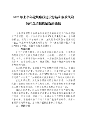 2023年上半年党风廉政建设总结和廉政风险防控总结报送情况的通报为全面掌握队伍各级单位落实党风廉政建设工作和各项重点工作情况,进一步分析研判全市XX队伍廉政形势,总结经验做法,谋划下半年廉政工作,支队纪委对队伍各级报送的2023年上半年党风廉政建设总结和廉政风险防控工作总结"进行了审阅,现将有关情况通报如下:一、存在问题(一)行文格式错误。从队伍各级报送的总结看,全部存在不同程度的行文格式不规范问题,大标题、一级标题、二级标题、字体、符号等不统一的情况。个别基层队伍甚至出现通篇宋体字,文中出现红色字,段落顶格,段落与段落间空格等极易规避的问题。(二)照抄照搬。在查阅各单位报送的总结中发现,个别基层队伍抄袭情况严重,有的是从外单位、外警种网站下载,其内容脱离牡丹江支队实际。其中XXX报送的党风廉政建设工作总结中出现了如何明确纪委监督权力的有关总结内容。(三)文不对题。从队伍各级报送的总结内容看,个别基层队伍不能很好的归纳本单位纪检工作,不能紧扣纪委部署的重点工作开展各项活动,将纪检工作与其它工作混为一谈。(四)总结片面。队伍各级报送的总结普遍存在内容空洞、总结片面的现象,不能围绕纪检重点工作和本单位实际情况进行总结,空话连篇,字数过少。未将纪检工作贯穿于部队各项工作中来,不能将纪检工作与忠诚教育有机结合,没有本基层队伍地域特色,总结缺少创新元素和工作亮点。二、原因分析(一)思想认识缺乏责任性。从报送情况中不难看出,少数基层基层队伍主要领导不重视廉政建设工作,对报送的总结把关不严,不管不问。重业务工作,轻廉政建设,错误的认为廉政工作无关大局,走过场、图形式的思想较为明显。没有充分认识新形势下廉政建设的长期性、复杂性、艰巨性,对廉政工作缺乏足够责任意识。(二)职责分工缺乏规范性。从多次材料报送,督察检查中发现,个别基层队伍廉政工作无具体负责人,分工混乱,纠结于廉政工作是归基层队伍负责,还是负责的问题上,基层队伍之间推诿扯皮现象严重,有的单位甚至将廉政工作直接推给文职雇员负责。在此次总结报送工作中,有的单位报送两次总结,有的迟报漏报缺少统筹协调,廉政工作缺乏规范性。(三)廉政工作缺乏落实性。通过总结报送情况可以看出,一部分基层队伍的廉政工作只停留在表面上,廉政工作流于形式的现象明显,对纪委部署的各项工作不落实,有的甚至不清楚2023年廉政工作内容。机关开展的轰轰烈烈,基层冷冷清清,不能认识到支队成为总队廉政建设试点单位的来之不易,缺乏集体荣誉意识、大局意识,三、工作要求(一)提高思想认识。队伍各级主要领导要深刻认识到当前廉政工作面临的严峻形势及复杂任务,牢固树立责任意识,要将廉政工作融入到各项工作中,真正组织本单位人员通过党委会、座谈会等形式研究制定符合本单位实际和地域特色的廉政工作建设方案,确保将廉政工作抓出实效、抓出亮点。支队在此重申:对纪检名项工作完成不好的,影响支队廉政试点工作整体进程的单位,将依据《党风廉政建设责任制实施办法》和《2023党风廉政建设工作责任状》,严肃追究基层队伍主要领导责任。(二)梳理廉政工作。队伍各级要进一步明确本单位廉政工作负责人,加强廉政工作的统筹协调,负责人员必须为正式干部,绝不允许将廉政工作推给文职雇员全权负责。切实将当前正在开展和今年已完结的各项纪检工作,进行一次全面自检自查,纪委计划8月份专项检查各单位廉政工作开展情况。(三)修改完善总结。队伍各级要对照上述提出的问题进行自查,认真完善本。半年工作总结要围绕班子建设、作风建单位2023年上半年党风廉政建设总结"设、廉政文化建设、信访工作和廉政各项重点工作等内容撰写。队伍各级主要领导要切实把好关,确保总结质量。