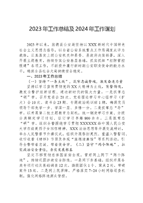 2023年工作总结及2024年工作谋划2023年以来,旌德县公安局坚持以XXX新时代中国特色社会主义思想为指导,以全省公安系统重点工作月调度点评为载体,认真落实上级公安机关和县委、县政府决策部署,深入开展主题教育,持续夯实公安基层基础,抓实抓细打防管控服建各项工作,不断提升履行新时期公安职责使命的能力水平,确保全县社会大局持续安全稳定。一、2023年工作总结(一)坚持一条主线,筑牢忠诚警魂,激发奋进力量坚持以学习宣传贯彻党的XX大精神为主线,育警铸魂,激发全警护航新征程、建功新时代的强大力量。一是抓常态领学。召开党委会21次、党委理论学习中心组学习(扩大)会10次、读书会23期、专题政治轮训班1期,确保党员领导干部先学一步、学深一层、多悟一分。二是抓常态导学。以开展第二批主题教育为契机,统一制发学习方案、分级分类制定学习计划、征订学习书籍800余本。三是抓常态研学。组织全警围绕学习贯彻XXXXXX给中国人民公安大学在读英烈子女回信精神、XXX法治思想等开展交流研讨,举办人民警察节升旗仪式,组织开展祭扫英烈、重温入警誓词、收听收看《榜样》节目及参观旌德清廉馆等系列活动,引导全警带着忠诚、带着使命学。(二)坚守两个阵地,扛实政治安全责任,夯实发展根基坚定不移贯彻总体国家安全观,管好网上网下两个阵地,持续巩固涉政安全防线。一是网下夯基础。组织开展各类专项行动及基础调查12次。捣毁团伙1个、窝点2处,带破案件13起。二是网上筑屏障。严格落实7×24小时网络巡查机制,强化网络阵地源头管控。(三)推进三大建设,坚持固本兴新,助推工作高质量发展1.加强智慧公安建设。一是打造视频监控防控体系。雪亮工程二期暨天网四期项目汇聚3000余个视频监控,强化系统运用,提供案件线索300余条,服务群众800余人次。二是完善一张图指挥系统。加速智能设更代和配备,最大限度实现警力、警情、警车等要素可视化呈现、扁平化指挥调度。三是常态开展关城门实战演练。为有效防范沿街店铺侵财案件发生,打造沿街店铺可防性案件主动防御机制。2.推进法治公安建设。一是紧盯主体责任,拧紧四审责任链条。形成一把手亲自抓、分管领导专职抓、法制部门牵头抓、基层所队具体抓的层级责任链条,推动执法事项由事后被动处置向事前业务指导、事中流程把控转变。二是紧盯问题症结,推动执法全流程监督。深度融合接处警系统、执法办案系统,实行 日巡查、周通报、月考评制度,截至目前。三是紧盯结果运用,提升执法办案质效。强化执法办案积分制结果运用,落实奖惩措施,开展刑事、行政两个序列开展最优、最差案卷评比,落实执法之星月评比和末位单位 黄牌警示、红牌否优制度,通过执法数据日晾晒、周整改、月推进,提升警情处置和案件办结效率。3.努力打造为民公安。一是优化窗口服务。对照省委一改两位要求,持续推进跨省通办、全程网办和延时、错时、容缺办等便民利企服务,办结各类行政审批服务业务14847件,其中签发审核第二代居民身份证9291件,户政类审批131件,公章准刻制备案3900件,民用爆炸物品购买、运输许可证签发1213件,边境通行证70件,居住证127件,为其他政府部门提供数据或信息核查115件。二是做实指尖警务。以网上警民议事厅微信群为平台,落实便民服务、提醒告知等七大工作机制,发布各类安全防范宣传4万余条,开展便民服务2000余次,解决群众具体诉求200余件。三是护航企业发展。严格落实 一企一警联系机制和助力经济高质量发展30条措施,通过组建警企微信群、优化园区经侦服务站、设立经济犯罪案件接报案中心,进一步畅通警企沟通渠道,解决企业困难。破获涉企诈骗案件,为企业挽回损失X余万元。(四)稳固四条防线,打造高效主动警务,提升平安指数1.强化社会面防控。一是常态化开展巡逻防控。持续深化社会面防控四项机制和1、3、5分钟快速反应机制,落实屯警街面和动中备勤要求,通过科技+警力+群防力量立体化巡逻防控,切实提高街面见警率和管事率。二是强化视频巡查防控。指挥大厅专设视频巡查岗的基础上,以派出所勤务指挥室建设为契机,组织警力对重点路段、时段视频监控开展一日三巡查,做到警情第一时间发现、第一时间处置、第一时间反馈,实现工作闭环的同时,提高打击防范质效。三是扎实开展夏季治安打击整治专项行动。夏季行动以来,共组织开展统一宣防行动9次,投入警力2475人次,发动社会力量361人次,盘查人员2296人次、车辆6520台次,检查行业场所1960家次,发放宣传单页1.1万余份,行动期间刑事案件发案数同比下降20.73%,破案数同比上升7.8%,有效警情环比下降30.55%,社会大局持续稳定。2. 强化重点要素管控。一是开展矛盾纠纷大