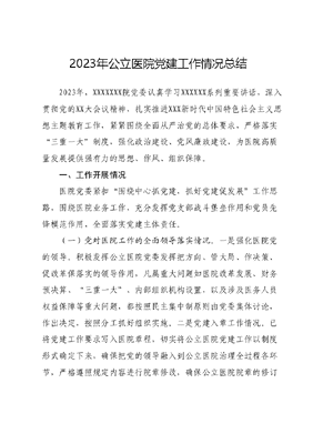 2023年公立医院党建工作情况总结2023年,XXXXXXX院党委认真学习XXXXXX系列重要讲话,深入贯彻党的XX大会议精神,扎实推进XXX新时代中国特色社会主义思想主题教育工作,紧紧围绕全面从严治党的总体要求,严格落实三重一大制度,强化政治建设、党风廉政建设,为医院高质量发展提供强有力的思想、作风、组织保障。一、工作开展情况医院党委紧扣围绕中心抓党建,抓好党建促发展工作思路,围绕医院业务工作,充分发挥党支部战斗堡垒作用和党员先锋模范作用,全面落实党建主体责任。(一)党对医院工作的全面领导落实情况。一是强化医院党的领导。积极发挥公立医院党委发挥把方向、管大局、作决策、促改革保落实的领导作用,凡属重大问题如医院改革发展、财务预决算、三重一大、内部组织机构设置,以及涉及医务人员权益保障等重大问题,都按照民主集中制原则由党委集体讨论,作出决定,按照分工抓好组织实施。二是党建入章工作情况。已将党建工作要求写入医院章程,切实将公立医院党建工作以制度形式确定下来,确保把党的领导融入到公立医院治理全过程各环节,严格遵照规定内容进行院章修改,确保公立医院院章的修订符合中办《意见》和省《实施意见》精神。(二)抓实队伍建设,加强主体责任落实情况。在工作中坚持党要管党、从严治党的原则,做到履行主体责任不甩手,严格落实一岗双责,注重领导班子队伍建设,对班子成员合理分工,明确一岗双责,把党建工作与业务工作同研究、同部署、同考核,使党建工作真正做到与各个科室相结合,形成整体合力,带动医院全面发展。严格执行三重一大决策制度,不断提高决策科学化水平和决策执行力,确保医院转型升级不走错路,不走弯路。(二)思想政治工作情况。一是各党支部严格落实按照三会一课制度,组织党员干部深入学习贯彻XXXXXX有关重要讲话和批示指示精神,不折不扣执行上级决策部署,以实际行动践行初心使命、彰显四个意识,落实两个维护。二是组织职工积极参与学习强国、灯塔-在线自主学习,自觉用XXX新时代中国特色社会主义思想武装头脑、指导实践、推动工作。主题教育工作启动后,XXXXX党委第一时间组织学习领会主题教育要求,研究制定实施方案,成立领导小组和领导小组办公室,2023年XX月XX日召开学习贯彻XXX新时代中国特色社会主义思想主题教育工作会议传达全区主题教育工作会议精神,全面安排部署医院主题教育工作。(三)党风廉政建设、医德医风工作情况。XX月XX日召开了党风廉政建设会议,与领导班子成员签订《落实全面从严治党主体责任责任书》、《党风廉政建设责任书》,并开展警示教育,要求全体职工坚守做人底线,明纪律、知敬畏、存戒惧、做表率,把政治纪律和政治规矩挺在前面,增强自律能力。XX月XXX日,召开了医药卫生领域腐败问题和不正之风专项整治行动动员会,聚焦政策落实、采购基建、医疗服务、医保基金等专项整治重点,深入开展专项整治,查处系统腐败问题,改进行业作风净化政治生态,健全完善廉政风险防控和权力运行监督制约机制切实提高廉洁从业意识。(四)基层党组织建设情况。一是认真贯彻执行基层组织工作制度,不断加强基层党组织建设。根据各支部党员工作岗位实际,注重基层党建工作与实际工作的有效结合,抓实党员发展,严格组织程序,加强学习培训,抓好考察培养,把好党员质量关促进党员的教育管理和基层组织建设,充实战斗队伍活力。二是医院党委注重党建工作与实际工作的有效结合,根据各支部党员工作岗位实际,抓实活动实践,压实学习教育成效,以党员为主导,经常性到社区、学校开展健康知识宣传、大型义诊等志愿服务活动。医院高度重视第一书记派驻工作,将其作为密切联系群众,为广大人民群众谋福祉的大事来抓。XX月XX日,医院党委到第一书记派驻村XXX镇XXX村,走访慰问困难群众,为他们送去XX、XXX等慰问品,并给村集体送去XX万元帮扶款。XX月XXX日,组织专家来到第一书记派驻村XXX镇XXX村,开展健康义诊活动,让老百姓在家门口就能享受专业、优质的医疗服务。在开展创建全国文明城市活动中,组织党员干部带头到XXXX小区进行志愿服务活动,并根据社区实际向其捐赠工具。二、存在问题:(一)党支部作用发挥不充分。基层党组织是是落实党的路线方针政策和各项任务的战斗堡垒。就医院党组织设置的现实状况来看,各党支部的支部书记和支委多是兼职。这很多临床业务科室的主任或业务骨干担当了各党支部书记、委员职务,往往忙于日常大量繁重的医务工作,抓党建工作的时间和精力都有限,给医院支部党建功能的发挥带来一定的难度。(二)党建工作方法缺乏创新。受场地、经费、人员等因素影响,开展特色亮点创新型党组织生活的频次不高,效果不突出党员活动阵地建设还不规范,以党建促发展的思路不多,解放思想的程度还需进一步加大。(三)理论学习的深入性存在差距。