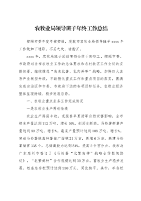 农牧业局领导班子年终工作总结按照市委年度考核安排,现就市农牧业局领导班子xxxx年工作做如下述职。不妥之处,请指正。xxxx年,农牧局班子团结带领全体干部职工,按照市委、市政府对全市农牧业工作的总体要求和农村牧区工作会议的安排部署,继续推进南菜北薯、乳肉并举战略,加快四大主导产业转型升级,不断强化重点工作和重点项目的落实,圆满完成自治区和市委、市政府下达的各项目标任务,农牧业经济整体呈现持续、稳步发展态势。一、农牧业重点业务工作完成情况一是农牧业生产再创佳绩农业生产再获丰收。克服春旱夏涝等自然灾害影响,全市粮食产量达到112万吨,增长10%,创历史新高。马铃薯鲜薯产量达到80万吨,增长%。蔬菜产量预计达到108万吨,增长%。完成马铃薯脱毒种薯推广面积21万亩,新增6万亩。新建马铃薯储窖335个,总储藏能力达到54%,提高2个百分点。我市与广东惠州市签订了《马铃薯北繁南种战略合作框架协议》,北繁南种合作规模达到30万亩。畜牧业生产稳步发展。牲畜总存栏预计达到330万头,同比持平。其中:羊存栏270万只、出栏390万只,同比分别增加4万只和7万只。羊规模化程度达到75%,提高5个百分点。新增1个自治区级种羊场,自治区级种羊场达到7个,市级以上种羊场达到20个,引进、选留基础母羊万只,引进优质种公羊3157只,优质肉羊改良率达到70%,提高10个百分点;完成标准化规模奶牛小区