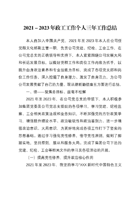 2021-2023年政工工作个人三年工作总结本人自加入中国共产党,2021年至2023年本人在公司任党群文化部副主管一职,负责公司党建、纪检、工会工作,在公司党总支的正确领导和支持下,本人紧紧围绕公司发展大局和长远发展目标,以做好党群工作和岗位工作内容为抓手,以提升自身政治素养和专业技能为目标,完成了各项党支部和岗位工作任务,深入挖掘了自身潜力、激发了自身活力,为公司公司发展贡献了自己的力量。现从德能勤绩廉五方面进行总结。一、德——聚焦总目标、丝毫不松懈2021年至2023年,在公司党总支的带领下,本人积极参加集团党委及公司党总支组织的各项学习,学习党建、纪检监察、工会相关政策法规和业务知识,不断加强党的方针政策学习,增强提升理论水平、政治敏锐性和政治鉴别力。进一步增强政治意识、大局意识,为更好地完成各项工作打下了坚实的思想基础。通过学习强化党性修养,恪守党性原则,做到了脚踏实地,坚持原则,服从和服务大局。完成了集团公司下达的党建、纪检、工会等相关文件的学习及各项活动的开展。(一)提高党性修养,提升政治核心作用2021年至2023年,我坚持学习XXX新时代中国特色主义思想不放松,反复研读党的XX大精神。在公司党总支委员会的带领下,重点学习了《党的XX大报告》、《XXX新时代中国特色社会主义思想学习纲要》、《XXX著作选读》、《XXX新时代中国特色社会主义思想的世界观和方法论专题摘编》、《XXX关于调查研究论述摘编》、《XXX新时代中国特色社会主义思想的世界观和方法论专题摘编》,提高了思想认识;学习先进人物、典型事例,加强了自身修养。在协助党总支组织学习的同时,与广大党员分享心得体会,认真听取了其他党员及领导干部学习心得体会,提升了自身发现问题、分析问题、总结经验的能力,培养了自身学以致用的能力。按照公司党总支工作安排部署,起草了年度党建工作计划精神文明创建工作计划和党支部学习计划,完成党史学习教育、XXX新时代中国特色社会主义思想主题教育等活动方案、宣传报道以及工作方案的起草工作。同时配合领导扎实开展了我为群众办实事活动,面对面倾听生产一线职工存在的困难、问题,以及党员、群众的意见、需求等,全力协助领导解决项目一线职工急难盼愁问题。(二)提升思想觉悟,提高活动组织能力2021年至2023年,我协助党支部组织开展了参观毛泽明故居、党史陈列馆、烈士陵园、廉政教育基地等红色教育活动;组织党员干部观看《跨过鸭绿江》《长津胡》、《1921》、《红船》、《歌声的翅膀》等影片;协助支部书记积极组织开展交投心向党巾帼展风采、消除隐患齐聚力共筑安全迎五一、交投心向党清明祭英烈铭史勇担当、党旗映天山交投心向党、民族团结一家亲喜迎双节共奋进、强作风、守纪律、正作风等系列活动;疫情期间协助X片区党工委主动投身疫情防控工作,协助组织并参加了疫情捐款和见义勇为基金筹备工作。这些活动的组织和参与,进一步提高了自身的思想觉悟和组织能力,增强了自身的社会责任感和使命感。二、能——以知促行,以行促知2021-2023年在党群文化部文化部从事党建暨党风廉政建设、纪检、工会、共青团、支部建设等工作期间,本人认真履职,通过不断学习,更新自身知识结构,提高自身的政治和专业能力,充分运用所学,提高分析判断能力,注意收集各种信息,把握政府政策取向、力度和重点,为公司发展服务。近三年的工作中本人配合领导开展了一系列专项检查及专题活动,工作中本人经常草拟一些请示、报告、专项治理工作相关材料,党政专题会议讲话、实施方案。长期的文字基础工作,使我练就了较为扎实的文字功底,写作能力得到综合性地提高。为我做好今后工作提供了强有力的保障。同时工作期间得到了公司各级领导的大力培养和帮助,逐渐成长为一名敢工作、善工作、想工作、会工作,勇挑重担的干部。本人也多次荣获集团级、公司级优秀党务工作者荣誉称号。三、勤——尽职尽责,甘于奉献2021年至2023年,我坚持以勤求绩、以勤立信、以勤做人。在工作中,我尽心尽责、勤奋不怠,用积极的工作态度和事业心,推动完成公司党群工作和自身岗位工作任务。作为第一党支部宣传委员,我积极配合支部书记,从严抓好三会一课、组织生活会、民主评议党员、谈心谈话等党内政治生活制度落实,扎实开展好七一建党节系列活动,完善学《党章》、党员领导干部讲党课、主题党日以及党员过政治生日等政治仪式。同时对外宣传好公司各项工作领域的创新实践、特色做法等,展现公司积极向上的良好形象。充分发挥了自身的创造性和主观能动性,实现了公司整体价值和职工个人价值相统一。四、绩——稳中求进,主动精准2021年至2023年在公司领导的带领下,我坚持精益求精开拓创新的理念,完成公司年度工作目标任务,为推进公司政治建设、经济建设、文化建设,履行好企业社会责