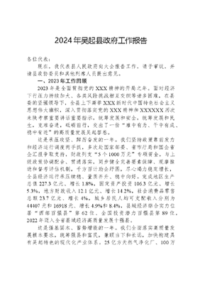 2024年吴起县政府工作报告各位代表:现在,我代表县人民政府向大会报告工作,请予审议,并请县政协委员和其他列席人员提出意见。一、2023年工作回顾2023年是全面贯彻党的XXX精神的开局之年。面对经济下行压力持续加大、各类风险挑战相互交织等诸多困难,在县委的坚强领导下,全县上下高举XXX新时代中国特色社会主义思想伟大旗帜,深入贯彻落实党的XXX精神和XXXXXX历次来陕考察重要讲话重要指示,统筹发展和安全,统筹发展和民生,克难奋进,砥砺前行,交出了一份难中有为、干中有成、稳中有进的高质量发展吴起答卷。这是承压攻坚、踔厉奋发的一年。我们坚持政策靠前发力和经济运行调度两手抓,多次赴国家部委、省市厅局和国企省企汇报争取支持,财政列支5个1000万元专项资金,与上级政策协调配合、贯通落实,同步健全完善要素保障、观摩推进和督考评估机制,千方百计助企纾困,尽心竭力稳定增长,全县经济运行承压续稳、量质齐升、稳中向好。完成地区生产总值227.3亿元、增长1.8%,固定资产投资106.3亿元、增长5.3%,地方财政收入12.1亿元、增长14.2%,社会消费品零售总额23.7亿元、增长4%,城乡居民人均可支配收入分别为44407元和16918元、增长4.9%和8.4%,县域经济综合实力位居西部百强县第62位、全国投资潜力百强县第89位,2022年迈入全省县域经济高质量发展十强县。这是强基固本、蓄势增能的一年。我们全面落实高质量发展根本要求,统筹强县和富民,兼顾当下和长远,加快构建具有吴起特色的现代化产业体系。25亿方天然气净化厂、100万方天然气调峰储备站、20万吨混合轻烃分离等能化项目落地建设,完成油气精细化工产值213亿元、位居全市第二,能源化工产业园通过省级认定。3+3+X现代农业产业规模发展、势头喜人,签约引进万头优质肉牛产业示范基地建设项目,完成一产产值9.1亿元、增长5.9%,增速全市第一,成功创建周长省级现代产业园。西安吴起商会挂牌成立,成功举办再回吴起投资创业大会,招商引资工作创历年最好成绩。数字赋能产业发展、城市建设、应急管理、社会治理成效显著,全县发展呈现出动能蓄积、活力迸涌、质效提升的良好态势。这是民生殷实、幸福跃升的一年。我们始终想人民之所想行人民之所嘱,探索富民之路,寻求富民之策,尽心尽力解好急难愁盼题,用心用情办好烦心揪心事,全县民生支出28.2亿元、占财政一般预算支出82.8%,十件民生实事20个项目全部开工建设、建成投用18个,职教中心、县医院 五大中心建成投用,城乡道路建设、饮水工程提升、物业改革等扎实推进,人民群众幸福感、获得感、满意度进一步增强。这是锤炼作风、激情干事的一年。我们坚持把开展主题教育与三个年活动一体谋划、一体推进,全面落实四下基层和一线工作法要求,特别是县委大力实施实干兴县战略,坚持在实干中锤炼干部、甄别干部、使用干部,调整配备干部10批565人次,优化部门党组织设置,驰而不息正风肃纪反腐,全县上下在党的旗帜下团结成一块坚硬的钢铁,心往一处想、劲往一处使,用脚步丈量土地、用实干践行责任、用拼搏成就梦想,把握了大势、经历了大考、打赢了大仗、干成了大事,荣获国家级荣誉11项、省级荣誉42项、市级荣誉12项。一年来,我们主要做了以下工作:一是坚持能源强基、延链补链,工业经济突破发展。县四套班子领导高频次到驻吴油气开发企业调研座谈、纾困文可居文库——海量学习资料,手机电脑均可下载www.wenkeju.com解难,生产原油508万吨,新打天然气井171口、产气1.63亿方,开工建设新能源项目6个80万千瓦、并网10万千瓦、发电8亿度。初步编制完成能源化工产业园控制性详细规划,工业园区腾笼换鸟、退园转产取得突破性进展,成功引进莫贝克、晶源科技、特锐豪等企业入园发展,填补了我县专精特新企业和装备制造业空白,荣获全省2022年度重点建设县域工业集中区争先进位先进单位。二是坚持联农带农、普惠致富,乡村振兴全面推进。出台了富民惠民十条措施,列支1.78亿元支持乡村振兴和农业产业发展,召开农业农村工作现场观摩会2次,隆重表彰农业农村先进典型,乡村全面振兴取得实质性进展、阶段性成果。31.2万亩粮食作物喜获丰收,12万亩山地苹果挂果7万亩、产量5万吨,建成投产规模肉牛养殖场28个、肉牛养殖户460户,新建改造日光温室、大棚拱棚1680亩,改造提升经济林园3000亩,生产粮食9.7万吨、瓜菜12.4万吨、食用菌500万棒,存栏生猪16.5万头、羊子15.1万只、肉牛0.8万头,延安市吴起县苹果专家工作站挂牌成立,被授予陕西省吴起楸子种质资源保护基地,获批全省有机产品认证示范区创建资格。认定家庭农场347个,评星定级新型经营主体1