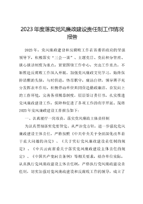 2023年度落实党风廉政建设责任制工作情况报告2023年,党风廉政建设和反腐败工作在省委省政府的坚强领导下,积极落实三会一课、主题党日、党员积分管理、谈心谈话制度为重点,紧紧围绕工作中心,突出工作重点,不断推进反腐败工作深入开展。加强党风廉政文化学习,始终保持清醒的头脑,与时俱进,恪尽职守,廉洁自律,领导班子充分发挥表率作用,积极带动单位共同营造勤政廉洁、奋发向上的工作环境,完善各项规章制度,层层签订责任书,扎实推进党风廉政建设工作,保障和促进了各项工作的有序开展。现将2023年党风廉政建设工作报告如下:一、认真履行一岗双责,落实党风廉政主体责任制为认真贯彻落实党要管党、从严治党方针,进一步强化党风廉政建设主体责任,严格按照《中共中央关于全面深化改革若干重大问题的决定》、《关于实行党风廉政建设责任制的规定》、《中共云南省委关于落实党风廉政建设主体责任的规定》、《中国共产党问责条例》等相关要求,结合单位实际,认真执行党风廉政建设主体责任制,严格执行党风廉政建设责任制,切实加强对党风廉政建设和反腐败工作的领导,成立了2023年党风廉政建设领导小组,并明确了领导小组成员工作职责及分工,制定了《2023年度党风廉政建设工作计划》。在注重党风廉政建设组织领导的同时,高度重视党风廉政日常工作的开展。党风廉政建设工作做到同业务工作同部署、同落实、同检查、同考核。为认真履行一岗双责,加强对各组室、个人党风廉政建设责任制工作的督促、检查、指导,签订了《2023年党风廉政建设责任书》《共产党员维护国家安全和不信仰宗教承诺书》及细化目标任务,使整个工作有分管领导、有工作人员、有目标、有标准,人人肩上有担子,个个身上有责任,营造了齐抓共管的工作环境,确保了党风廉政建设工作顺利开展。三、工作开展情况(一)明确责任,细化目标。强化责任,认真履行职责,不断深入推进党风廉政建设和反腐败工作。根据上级党委相关要求,结合农科院实际情况,细化了任务,明确了责任。单位负责人认真履行第一责任人职责,管好自己、带好队伍、当好表率,认真履行一岗双责,做到党风廉政建设与业务同研究、同部署、同检查。认真执行《工作制度》,并按照党风廉政建设责任书的要求,做好各项工作。(二)落实党风廉政建设责任制。一是加强学习,提高党性修养,不断增强自我净化能力。结合三会一课、主题党日活动等集中培训活动,围绕中国特色社会主义理论体系特别是XXX新时代中国特色社会主义思想、党章和党性党风党纪、党的路线方针政策和形势任务、业务技能等,适时开展党的组织生活。2023年,分管领导召集进行党风廉政建设谈话4次,向分管领导汇报党风廉政建设和反腐败工作开展情况7次。二是加强教育,增强反腐倡廉意识,提高拒腐防变能力。结合单位每周一例会学习日活动,认真组织学习贯彻XXXXXX重要讲话和全面从严治党重要论述、XXXXXX考察云南重要讲话和重要指示批示精神、学习贯彻党的XX大精神、《XXX新时代中国特色社会主义思想学习纲要》、《中国共产党党内重要法规汇编》、《中国共产党廉洁自律准则》、《中国共产党纪律处分条例》等党纪党规。认真学习清廉云南建设学习教育丛书《监察法知与行》、《云南少数民族廉洁文化知与践》和《典型案例知与警》,积极发挥以法释义、以案为鉴、以文化人的作用,进一步增强广大党员、干部依法履职、秉公用权、廉洁从政的政治自觉、思想自觉和行动自觉。党员在云岭先锋APP上开展《党支部工作条例(试行)》、《中国共产党党员教育管理工作条例》、《中国共产党党和国家机关基层组织工作条例》、《中国共产党基层组织选举工作条例》的学习。落实理论学习,按照上级部门下发学习要求,截止2023年11月共组织职工集中学习49次。(三)扎实开展反腐倡廉工作。深入开展反腐倡廉教育,进一步抓好领导干部廉洁自律工作。反腐倡廉建设,教育是基础,坚持把反腐倡廉教育融入两学一做学习教育常态化制度化活动之中,加强中国特色社会主义理论体系和党性党风党纪教育,引导广大党员干部做到讲党性、重品行、做表率。加强廉洁从政和国家法律法规教育,开展警示教育和岗位廉政教育。2023年,组织干部职工观看了《永远吹冲锋号》《问剑破局》等警示教育宣传片,提高了党员干部拒腐防变的意识和能力。深入推进廉政建设,营造浓厚的反腐倡廉社会氛围。认真落实领导干部廉洁自律各项规定,严禁领导干部利用职务上的便利谋取不正当利益。使干部职工能经常接受党风廉政教育,提高员工自我防范意识。完善机制,落实责任。坚持谁主管,谁负责的原则,细化责任分解,严格责任履行,落实一岗双责,落实班子成员廉政建设责任制,实行一级抓一级,一级对一级负责,一级考核一级工作目标机制,增强党员干部的责任意识。(四)注重制度建设,加大从源头上预防和治理腐败的工作力度。制度建设是提高党风廉政