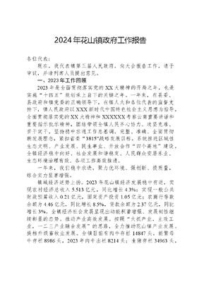 2024年花山镇政府工作报告各位代表:现在,我代表镇第三届人民政府,向大会报告工作,请予审议,并请列席人员提出意见。一、2023年工作回顾2023年是全面贯彻落实党的XX大精神的开局之年,也是实施十四五规划承上启下的关键之年。一年来,在县委、县政府和镇党委的正确领导下,在镇人大和各位代表的监督支持下,镇人民政府以XXX新时代中国特色社会主义思想为指导,全面贯彻落实党的XX大精神和XXXXXX考察云南重要讲话和重要指示批示精神,团结带领全镇人民齐心协力、攻坚克难、苦干实干,坚持稳中求进工作总基调,完整、准确、全面贯彻新发展理念,紧扣省委3815战略发展目标,系统推进区域性生态文明、产业发展、民生事业、开放合作四个高地建设,全镇经济稳中向好、社会发展和谐稳定、人民群众安居乐业、生态环境治理有效、各项工作高效推进。一年来,我们稳中求进,聚力优环境、强创新、提质量,综合实力显著增强。镇域经济逆势上扬。2023年花山镇经济发展稳中有进,实现农村经济总收入5.513亿元,同比增长4.3%;实现一般公共财政预算收入0.21亿元,固定资产投资1.05亿元;农商行存款余额为4.46亿元,同比增长8.5%,贷款余额为2.37亿元,同比增长3%。全镇经济社会发展呈现出动能积蓄增强、发展韧性继续彰显的态势。推动产业高效发展。按照大抓产业,主攻工业,一二三产业融合发展的思路,全力推动花山镇产业发展。提档升级畜牧业发展。全镇目前有肉牛存栏14847头,能繁母牛存栏8986头,2023年肉牛出栏8214头;生猪存栏34963头,黑山羊存栏7436头,家禽存栏165642羽,全年实现畜牧业产值累计达2.14亿元。打造特色农业。2023年冬农大豆种植2560亩,产值890万元,冬农玉米种植1056亩,产值100万元;甘蔗种植1160亩,产值360万元;晚熟芒果、沃柑、橘子等种植2000亩,产值1600万元;茶叶产量1018.6吨,产值3972万元;萝卜种植550亩,香椿种植400亩,辣椒种植500亩,产值累计700万元;全镇种植蚕桑3721亩,新植桑园318亩,提升改造1500亩,收购鲜茧364吨,产值2218.6万元;种植咖啡1600亩,咖啡豆产量300吨,产值800万元;完成烤烟种植750亩,产量2000担,产值325万元;种植滇黄精、滇重楼、魔芋等1000亩,产值3000万元;种植姬松茸27棚,产量250吨,产值200万元。推动工业提质增效。花山镇有竹筷厂1家,竹片粗加工厂3家,竹炭厂1家,全年加工竹子8000吨,产值1000万元。其中云南胜丰环保炭业有限公司2023年引进资金200万元,对整条生产链进行改造升级,实现从日产3吨竹炭到7吨升级,实现年产量增长1400吨,实现年收入由200万元到500万元增长。推动农文旅融合发展。依托良好的自然生态禀赋,坚持宜融则融、能融尽融,因地制宜探索生态+农文旅模式,依托项目投资100万元,深入推动芦山村背爹箐茶旅融合项目建设,依托中央衔接资金项目投资280万元,打造哀牢山1号古茶园,实现旅游人数由2022年的600余人到2023年的3000余人的增长。项目建设成效显著。围绕十四五规划和2035年远景目标,推动建设村集体经济项目,巩固脱贫攻坚成果,推动乡村振兴。2023年完成哀牢山古茶园建设、芦山村背爹箐小组民族团结进步示范村建设、农业产业气象监测网建设、农村供水工程维修养护、营盘村哪赖小组绿美村庄建设、集群卧式活动板烤房等项目,共计投资450万元;花山到大街四改三公路建设项目、马鹿塘坝塘建设项目已经动工建设,集镇饮水工程项目已经完成专家评审。营商环境持续向好2023年经营主体倍增425家,超额完成上级下达任务;将招商引资第一要事和抓整改、强作风、促发展专项行动相结合,引进龙诏茶叶云南有限公司,从事茶叶生产、加工、销售,推动全镇茶产业发展。五经普单位清查工作高质量完成。完成单位、个体户清查2110家,核查上报1442家。一年来,我们实干苦干,全力防返贫、固成果、强帮扶,乡村振兴稳步向前。坚持精准动态监测,细化举措压实责任。目前全镇脱贫户1544户5180人,监测户215户680人,其中:脱贫不稳定户47户141人、边缘易致贫户113户380人、突发严重困难户55户159人,经过政策帮扶,已消除返贫风险96户347人,未消除风险119户333人。全年开展常态化监测12次,共新识别监测对象6户14人,均为突发严重困难户,风险消除7户25人,家庭成员自然增加33人,自然减少131人,成员转移9人。稳固两不愁三保障,盯紧重点任务标准。教育方面,持续加强生源地贷款政策、国家助学金、奖学金和雨露计划的宣传,全年雨露计划申报159人,共计补助34.2万元。基本医疗方面,家庭医生签约101