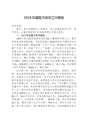 2024年建瓯市政府工作报告各位代表:现在,我代表建瓯市人民政府,向大会报告政府工作,请予审议,并请市政协委员和其他列席人员提出意见。一、2023年主要工作和成效2023年是全面贯彻落实党的XX大精神的开局之年,面对严峻复杂的发展形势,市政府坚持以XXX新时代中国特色社会主义思想为指导,围绕省委三争行动,聚焦南平市委五增目标,深入实施五个一战略,全力打造文化生态融合发展示范区,经济社会发展总体平稳。预计全年完成地区生产总值增长4.8%;固定资产投资增长6%;一般公共预算总收入17.5亿元,增长17.9%;地方一般公共预算收入12.3亿元,增长9.8%;规模工业增加值增长6.5%;社会消费品零售总额增长7.6%;城镇居民人均可支配收入43895元,增长5%;农村居民人均可支配收入24662元,增长7%。过去的一年,我们以抓铁有痕的攻坚势头,补短板、提品质,推动城市建设取得阶段成效。开展建州文化宣传年活动,征集朱子文化遗存35项,朱子系列故事等15个项目列入南平非物质文化遗产名录;有序推进历史文化名城保护提升,完成五经博士府、朱文公祠主体修复,举办千年建州·中秋国庆嘉年华活动,铁井栏-紫芝街历史文化街区假期客流量达74万人次;城市品质全面提升,谋划城市发展支撑项目227个、总投资389.8亿元,完成江滨中路等6个项目征迁任务,涉及815户、26.4万平方米,开出房票5.6亿元;实施品质提升攻坚项目69个,完成道路白改黑、强弱电下地、污水管网建设28公里,建州大桥(三江口大桥)钢拱合龙,政和门大桥(水南二桥)竣工通车,建州博物馆全面开放;启动保障性安居工程959套,改造完成鑫侨花园等9个老旧小区;有效化解问题楼盘,新叶外滩重启动工,兰庭荟恒大·溪山公馆顺利交房,放生池棚改项目回迁安置选房966套;被列为省理学名城城市更新建设样板,通过中国根雕之都复评。过去的一年,我们以只争朝夕的责任担当,育集群、强链条,推动产业转型实现整体提升。笋竹产业量质同升,出台《加快推动竹产业高质量发展行动方案》等系列政策,开工建设3个竹材初级加工园区,打造16个竹材物理分解点;成立省笋竹集团,美新科技、美和家居、七贡食品等重点项目加快推进,君韵竹木等13个笋竹产业项目竣工投产,获全省首张竹木地板产品碳足迹认证;承办首届武夷竹产业高质量发展峰会,入选省2024年度竹产业一二三产业融合发展重点县,获评中国笋竹之都。酒产业势头强劲,建立高粱增产增效示范片1500亩,福酒产业园开工建设,中华福酱文博园、双龙戏珠白酒扩建项目有序推进;举办第二届福酒高质量发展大会,发布《建瓯产区酿酒微生态特征报告》,福酱入选9·8厦洽会指定礼宾用酒,酒业实现税收再翻番,获评中国山海酱酒之城。茶产业深度融合,设立北苑贡茶文化研究院,举办首届北苑贡茶文化节,《北苑御焙遗址文物保护规划》通过国家文物局批复,制定北苑贡茶(乌龙茶)等系列团体标准7项;谋划14个、总投资15亿元北苑复兴项目,打造9个全竹茶空间,完成全球首款点茶机研发,全国首个茶文化民宿集群大地指纹项目开工建设;新增SC认证茶企20家、宋代研膏茶工艺复原等专利2项,东峰矮脚乌龙获农业农村部品种登记,上榜省首届品牌价值百强。物流产业稳步增长,编制《物流产业发展规划(2023-2035年)》,好运联联东南区域总部项目开工建设,中通冷链、韵达快运南平分拨中心落户建瓯,徐墩、南雅等7个乡镇开展客货邮融合发展试点,新增国家3A级物流企业3家。食旅产业加快布局,举办第三届中国(建瓯)美食文化旅游节,建州笋宴建州朱府家宴入选地标美食名宴。过去的一年,我们以敢为人先的勇气魄力,增投入、抓进度,推动重大项目取得关键突破。招商引资全面提效,落实民营经济强省战略,强化一把手招商、圣象系招商,签约亿元以上项目28个、总投资77亿元。项目建设全面提速,44个省、南平市重点项目完成投资58.1亿元,超年度计划,建溪防洪工程东游段等15个项目开工建设,建嘉饲料等9个项目竣工,城乡供水一体化等项目加快推进;新增一把手项目39个,入库专项债项目70个,争取专项债资金27.1亿元,上级补助资金23.5亿元,均居南平首位。园区基础设施全面提档,桐源村完成整村搬迁,腾笼换鸟盘活土地332亩,食品精深加工园区、丰乐园区新增招商台地632亩,丰乐园区被纳入南平两徐国家级竹经济产业园打造范畴,在省级开发区综合水平管理服务考核中居全省第5位。过去的一年,我们以事不避难的实干拼闯,固根本、促振兴,推动三农工作获得实质进展。深入学习千万工程经验,推广现代农业五新技术55项,打造省级一村一品专业村3个,建瓯锥栗入选省首批福农优品百品榜,稻渔科技小院获评第五批省科技小院
