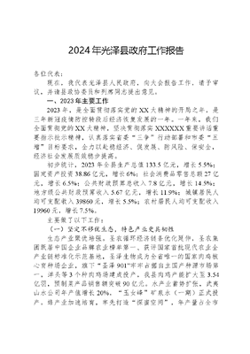 2024年光泽县政府工作报告各位代表:现在,我代表光泽县人民政府,向大会报告工作,请予审议,并请县政协委员和列席同志提出意见。一、2023年主要工作2023年,是全面贯彻落实党的XX大精神的开局之年,是三年新冠疫情防控转段后经济恢复发展的一年。一年来,我们全面贯彻党的XX大精神,坚决贯彻落实XXXXXX重要讲话重要指示批示精神,认真落实省委三争行动部署和市委五增目标要求,全力以赴稳经济、促发展、防风险、保安全,经济社会发展质效稳步提高。初步统计,2023年全县生产总值133.5亿元,增长5.5%;固定资产投资38.86亿元,增长6%;社会消费品零售总额27亿元,增长6.5%;公共财政预算总收入7.8亿元,增长14.5%;地方级公共财政预算收入5.67亿元,增长11.9%;城镇居民人均可支配收入39860元,增长5.5%;农村居民人均可支配收入19960元,增长7.5%。主要做了以下工作:(一)坚定不移优生态,特色产业更具韧性生态产业聚优培强。圣农循环经济链条优化延伸,圣农集团跃居中国企业品牌农业榜单第一、获评国家首批现代农业全产业链标准化示范基地,圣泽生物成为全省唯一的国家肉鸡核心育种场企业,旗下圣泽901牢牢占据自主国产种源市场第一,洋头等3个种肉鸡场建成投产,我县肉鸡产能扩大至3.54亿羽,预制菜产品销售额突破90亿元。水产业蓄势扩张,武夷山水公司年产值增长20%,玉女峰矿泉水(一期)正式投产。蜂产业加速培育,率先打造探蜜空间,年产量占全市比重约30%。茶产业加快成长,干坑1662红茶区域公用品牌影响力不断增强,全产业链产值增长9%。环带建设成效明显。积极打造环武夷山国家公园保护发展带光泽风景道,武夷山国家公园西大门、玲珑水文化平台等示范项目建成投用,环闽江源最美骑行车环道示范段基本形成,有效推进3条特色风景道和1个文旅综合服务片串珠成链一环四通道加快构建,山头村至江西冷水镇、国道G322线白改黑等出省通道项目有序推进,花山界省界服务区、闽赣司机之家建成投用。文旅业态不断拓展,推出环带沿线游览打卡点31个,圣农信赖之旅旅游路线全面推向市场,干坑林场获评省级森林康养基地,旅游总人数和总收入分别增长39%、45%。绿色本底愈发厚实。深化污染防治攻坚,和顺园区污水处理厂投入运行,工业园区大气环境综合整治提升项目开工建设,空气优良天数比例保持稳定,地表水水环境质量状况排名全省前列,绿水维护补偿机制、农村生活污水提升治理模式在全市推广。加大生态保护修复,完成松材线虫病防治采伐任务,实施森林生态银行·四个一合作示范、国土绿化等4.1万亩,华桥乡获评省级森林乡镇。(二)坚定不移拼经济,发展动能更加强劲有效投资稳步增长。项目建设扩面提质,新增开工入统项目87个,总投资31亿元;33个在建省市重点项目完成投资32.78亿元,占年度计划105.16%。资金争取成绩喜人,获批增发国债项目8个、5.28亿元,项目个数和资金总量均排名全市第一,占全市的22%;争取其他政策资金12.25亿元、增长6.97%,增速居全市第一。用地保障全面发力,完成土地征收314亩、供地684亩,批而未供和闲置土地处置649亩,自然资源管理监测系统评价全省第三。企业培育蓄能增势。全力以赴育主体,入围国家重点实验室、国家级学会创新驱动服务站、省级重点龙头企业、科技小巨人企业各1家、绿色工厂和专精特新企业各2家。培育规上工业企业8家,全县实有市场主体增长14.6%。千方百计提信心,出台巩固拓展经济向好44条、促进工业增长12条、免申即享35条等政策,减税、退缓税占总税收比重近20%。多措并举促消费,制定扩大消费7条措施,新入库规上服务业、限上商贸业企业21家,拉动消费比增7%。招商引资质效双升。签约超5000万元招商项目28个、总投资39亿元,其中2亿元以上项目4个。连续三个季度招商工作考评位居全市前三。突出产业招商,落地智慧冷链物流园、海圣饲料二期等延链补链项目14个。深耕乡贤资源,成功牵线竹炭产业园等项目19个。升级联动服务,双圆医疗器械配件、新型建筑材料等项目实现拿地即交证。(三)坚定不移谋新路,改革创新更见成效重点改革多点突破。联动改革不断深化,推广秒批秒办一件事集成套餐服务等事项302项,远程帮办服务点实现乡镇全覆盖。国企改革三年行动顺利完成,资产总额较改革前增长13.78%,营业收入比增30%。科特派制度持续巩固,选任科技特派员131名、组建服务团队和示范基地22个。一体化大融合行政执法平台建设稳步推进,国防动员体制改革基本完成,DRG医保支付方式改革提前实现全覆盖。创新潜能加速释放。探索撂荒地整治新模式,全力解决撂荒地复耕复种难题,累计完成撂荒地复垦8558亩,机制做法获《半月谈》《福