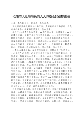 拟任市人社局局长向人大党委会的供职报告主任、各位副主任、秘书长、各位委员:这次组织安排我到市人社局工作,是对我的信任和重托、也是对我的考验,我深感责任重大、使命光荣。本人于xx年7月参加工作,xx年7月入党,法律硕士,xx大学博士在读。主要工作经历分四个阶段:……(任职经历略)。回顾工作经历,我从一名书记员一步步走向县处级工作岗位,深深感到这是组织的培养、领导的关心和同志们支持的结果。参加工作以来,无论在什么样的岗位上,我始终怀着一颗感恩的心,保持着一股拼劲和韧劲,用心干事、尽心工作。一是全力服务大局。在法院工作期间,牢固树立公正司法、一心为民的思想,把维护公平正义作为自己的不懈追求,求真务实,脚踏实地办好每一个案件;在城投工作期间,始终围绕市委市政府工作重点,强化市场思维,负责办理棚户区改造、淠河水系治理、xx国道改造等项目融资近xx多亿元,全力服务城市建设发展;在xx区工作期间,分管招商引资、生态环保、安全生产、国土资源、城市建设、投融资、财政等工作,坚持咬定目标,一抓到底见成效。xx被国开行确立为乡村振兴中部地区试点,一次性获批项目贷款xx亿元。服务工业强区战略,组建裕科投等三支基金,引进了xxx等创新企业。到组织部工作后,自觉秉承公道正派的组工干部作风,扎实做好人才、干部监督、公务员综合管理、非公党建等工作,服务保障了市县(区)人大、政府、政协换届等中心工作。二是坚持依法办事。始终坚持法律思维,采取行政协调等综合措施,协调推进工作,妥善化解矛盾纠纷。在法院工作时,坚持以法律为准绳、以事实为依据,坚决维护好群众的合法权益;在城投工作时,坚持规范融资,合法合规支付工程款;在xx区工作时,坚持依法行政,强化红线意识,加强土地、环保执法,审慎处理各项工作。三是强化宗旨意识。在法院工作时,坚持办案的法律效果与社会效果相统一,切实保障群众合法权益;在城投工作时,践行为民服务宗旨,妥善化解了征迁安置中的信访问题,让市民早日安心、安家;在xx区工作时,紧盯征迁安置、社会治理、乡村振兴建设等民生保障领域,带头接访下访、处理群众信访事项,稳妥处理了涉及债务近亿元、群众近百人、历时近十年的原新城铁公司债务纠纷事项。四是做到廉洁自律。落实党风廉政建设一岗双责,始终严于用权、慎于用权,坚持按程序决策、按制度工作、按规定办事,落实亲清政商关系的各项要求,不搞权钱交易的人情往来。始终严以律己、防微杜渐,注重从小事小节上加强自我要求,自觉坚守思想道德防线、廉洁从政底线、党纪国法红线,堂堂正正做人、干干净净做事。参加工作以来,分管工作先后荣获全市工业发展先进县区招商引资先进县区安全生产先进县区水治理先进县区等多项称号,财政专项扶贫资金绩效评价考核连续5年在全省获得优秀等次,县域经济高质量发展考核首次进入全省表彰序列;个人获得最高法院学术论文三等奖一次,被评为全省脱贫攻坚先进个人一次、全省政法系统优秀党务工作者一次,荣立法院系统二等功一次、三等功六次,获全市法院系统先进工作者称号五次。回顾多年来的经历,虽然取得了一点成绩,但深感与组织的要求和群众的期盼还有差距。今后,我将牢记使命、守正创新,勤政为民、奋勇争先。如果我的任命能够顺利通过,我将在前任局长打下的坚实基础上,努力做好以下几点:一是强化学习,提升能力。我将把学习作为第一要务,加强政治理论学习,完整、准确、全面贯彻新发展理念,提高政治素质,增强政治判断力、领悟力和执行力。刻苦钻研人社工作的法律法规政策,提高依法行政的能力。坚持系统思维,增强应对复杂局面和解决实际问题的能力,真正成为人社工作的行家里手。二是抓好班子,建强队伍。我会与各位班子成员精诚团结,带头做到相互尊重、相互包容,大事讲原则,小事讲风格,自觉维护局班子的整体形象。坚持民主集中制,充分调动每位班子成员的积极性和主动性,用担当、信任和真诚带领人社一班人,爱岗敬业、勤奋工作,始终保持昂扬向上的拼劲和韧劲,努力建设一支善学习、本领强、勤服务的工作团队。三是勤勉履职,廉洁自律。牢固树立以人民为中心的发展思想,服从命令、听从指挥,坚决把市委市政府的决策部署落到实处。坚持讲党性、讲原则,秉持正确的权力观、政绩观和价值观,筑牢思想和法律防线,坚守廉洁和道德底线,切实做到能担事、干成事、不出事。四是依法行政,接受监督。始终坚持法治思维,运用法治方式解决问题、深化改革、推进工作。牢固树立监督就是关心的理念,自觉接受人大的监督,坚决执行人大及其常委会作出的决议和决定,主动向人大常委会报告工作,高度重视人大的审议意见,主动加强与人大代表的联系和沟通,不断提高人社工作质效。主任、各位副主任、秘书长、各位委员,如果人大常委会通过对我的任命,我将锐意进取、扎实工作,推动人社工作高质量发展;如果人大常委会未能通过对我的任命,我也会
