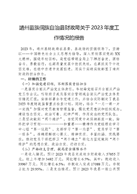 靖州苗族侗族自治县财政局关于2023年度工作情况的报告2023年,靖州县财政局在县委、县政府的坚强领导下,坚持以……中国特色社会主义思想为指导,深入贯彻落实党的XX大精神,围绕年初目标,局党组带领全局上下踔厉奋发、团结奋斗、勇毅前行,在高质量发展中抢抓先机,在真抓实干中攻坚克难,在稳中求进中发展前进,用实干实绩实效彰显了靖州财政的担当作为。一、所做的工作(一)加强党建引领,不断落实责任担当一是落实全面从严治党主体责任。年初局党组召开全面从严治党工作会议,听取班子成员落实分管领域全面从严治党主体责任情况汇报,安排部署全年党建工作,并结合实际制定了我县2023年度财政监督重点检查计划。同时,结合一月一课一片一实践加强对党员教育管理监督,强化党员意识和组织观念,建设信念坚定、政治可靠、纪律严明、作用突出的党员队伍。二是坚决做到两个维护,自觉同党中央保持高度一致。始终把学习贯彻………………和重要……精神作为党组理论学习中心组第一议题、支部学习第一内容、党员学习第一任务,准确理解核心要义、精神实质、丰富内涵、实践要求,推动党员干部把捍卫两个确立转化为坚定做到两个维护的思想自觉、政治自觉、行动自觉。(二)严格收支管理,提高资金保障水平一是收入情况。预计2023年我县完成地方财政收入57055万元,较上年增加3482万元,同比增长6.5%。其中:税收收入39967万元,同比增长6.5%;非税收入完成17088万元,非税占比为29.95%。二是支出情况。预计2023年我县一般公共预算支出完成322667万元,较上年增加32782万元,同比增长11.31%。政府性基金预算支出完成80324万元,较上年增加21万元,同比增长35.71%。预计一般公共预算中民生类支出为267223万元,占一般公共预算支出总量的85.48%。预计人均公共服务支出达到8800元,同比增长28.19%。(三)兜牢民生底线,持续增进人民福祉一是坚持教育优先,全面落实教育经费两个只增不减要求。2023年一般公共预算安排教育支出57693万元,较上年增加912万元,增长1.61%。二是扎实做好民生保障,不断提升人民群众幸福感、获得感、安全感。2023年,我县农村低保保障标准由2022年的4620元/年提高至5040元/年,农村特困人员供养保障标准由2022年的6360元/年提高至6600元/年,城市特困供养标准提高到10200元/年。三是加强惠民惠农补贴管理,确保政策落到实处。由县财政牵头,从县纪委、审计、农业农村、林业、民政、住建、乡村振兴和移民等部门共抽调20名业务人员组成4支检查组,对全县2015年以来惠民惠农补贴发放进行了全面检查。截至目前43个问题已整改到位39个,正在整改中的问题4个,整改进度90.7%,对违规多领取的补贴资金2.8万元予以追缴。(四)统筹涉农资金,加快推进乡村振兴依托县十四五规划,聚焦巩固拓展脱贫攻坚成果同乡村振兴有效衔接,把农业农村作为财政支出的重点保障领域,会同县乡村振兴局组织行业部门、乡镇(便民服务中心)科学编制涉农资金实施方案,统筹整合使用财政涉农资金10004.37万元,为我县加快推进乡村振兴打下坚实基础。(五)落实安全责任,增强安全防范意识今年以来,结合安全生产宣传五进、安全生产月、119消防安全月等主题宣传活动,充分利用宣传展板和各类会议开展安全生产、防灾减灾宣传教育,推送防灾减灾、应急科普、安全指南等文章,普及安全生产、防灾减灾知识,组织开展消防演练1次,利用党组会、局务会开展安全生产知识培训等4次覆盖全局所有干部职工,切实强化全员安全意识。(六)强化财政监督,树立廉洁自律风气一是扎实开展财经纪律重点问题整治,根据财政部和省财政厅工作要求,结合我县实际,制定了工作方案,成立工作专班,及时召开动员部署会议,重点聚焦减税降费、基层三保、违规返还财政收入等9个方面的问题,在全局开展了财经纪律重点问题专项整治自查自纠工作,对自查发现问题定期跟踪督促整改落实,确保取得实效。二是完善内部审计工作制度,起草并印发《靖州县财政局内部审计工作制度(试行)》,推动健全内部审计工作机制,积极开展我局2023年内部审计工作,进一步强化内部风险防控。(七)提高评审质量,当好钱袋子把关人充分发挥财政工作职能,坚持不唯增、不唯减、只唯实的评审理念,严格按照《靖州苗族侗族自治县政府投资项目管理规定》实行评审三审制。截至目前,已完成审核预算项目共139个,送审金额6.95亿元,审定金额5.96亿元,审减金额0.99亿元,审减率14.27%;已完成审核结算项目49个,送审金额6169万元,审定金额5798万元,审减金额371万元,审减率6.01%。二、2023年亮点、特色工作(一)狠抓财源建设工作,财税收入有了新增长一