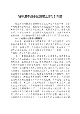 省级生态县市区创建工作分析报告生态文明建设是中国特色社会主义事业五位一体总体布局的重要组成部分。根据省委加强生态文明建设,建设美丽X的总体要求,我市坚持生态打底,更新发展理念,倡导低碳生活,创新生态制度,生态强市建设亮点纷呈,为夯实美丽X底部基础,持续推进中国西部生态强市建设打下了坚实的基础。一、X建设生态强市进展情况近年来,我市围绕生态环境保护,努力建设美丽X,通过实施差异化考核、开展县市区党政主要负责人离任生态环境审计评估、铁腕治理大气环境和小流域水环境、坚决淘汰三高产能等举措,全市生态强市建设呈现出一更新、二提升、三倡导、四特色的全新特点。(一)更新发展观念,科学发展、加快发展、有感发展成为广大干群的共识和行动。市委六届五次全会提出以绿色发展、循环发展、低碳发展为路径,将X建设成为天蓝、地绿、水净、人和的西部经济文化生态强市。市委六届六次全会强调实施两化互动和城乡统筹、创新驱动、开放合作、文化引领、民生优先、绿色低碳六大发展战略。市委六届七次全会要求围绕西部生态强市建设,构建生态文明建设体制机制。我市先后出台了《X生态市建设规划(201X—2030)》、《加快绿色低碳发展的实施意见》等多项政策文件,有力促进了全市生态建设工作。X区以实施跨越发展、建设富乐X为目标,狠抓生态文明建设。X县围绕建设生态经济强县,用新的理念深化对生态文明建设的认识。X县坚持走绿色低碳发展之路,加快建设全省山区经济生态强县。全市各级各部门绿色低碳发展理念不断树立,广大干群环境保护意识不断增强,群众参与生态建设的积极性不断提升,生态惠民的X实践和科学发展、加快发展、有感发展的施政导向已成为全市干部群众的广泛共识和自觉行动。(二)发展低碳经济,全市经济发展质量和三产结构水平明显提升。一是调快调特,大力发展生态农业。支持无公害农产品、绿色食品和地理标志保护农产品认定认证,三品一标产品达到2X个。加强畜禽养殖标准化建设,建成2X3个标准化养殖小区,废弃物处理率达到X0%。二是调快调强,积极打造新兴产业。去年,全市关闭小煤矿X个,淘汰落后产能企业X户,实现煤炭全行业退出。今年,对3X家企业开展清洁生产审核,X燃气集团热电公司如期关停,X发电厂2×300MW机组脱硫改造完成。截至X月底,全市新申报认证科技型中小企业1X户,其中新注册企业X00户,科技型中小企业累计达3X户。立足产业现状,将4+3高端成长型产业作为支撑X未来发展的重要方向,通过规划完善、人才聚集、政策支持、招商引资和推进机制等措施扎实推进。三是调快调优,加快培育现代服务业。努力提升服务业的生态元素,完善城市商业设施宜居宜业功能,城南万达、华润万家等城市综合体建设顺利,毅德商贸城、剑南食品城建成投用,投资310亿元全力打造科技物流产业园。加强旅游景区生态环境保护建设,推动王朗、虎牙深度融入大九寨旅游经济圈,重点推介X羌城、李白故居等精品景区,全市4A级以上景区达到X家。前三季度,全市地区生产总值实现11X0.34亿元,同比增长X.X%,增速比上半年提高0.3个百分点,其中:一产增加值增长4.2%,二产增加值增长X.X%,三产增加值增长X.X%,三次产业结构由去年同期的1X.4:4X.0:34.X调整为1X.X:4X.X:3X.X,第三产业提高1个百分点,比重稳步上升,三产结构不断优化。(三)倡导绿色低碳,人民生活品质和人居环境得到持续改善。一是倡导低碳出行。优先发展公共交通,城区公交车继续执行1元票价,建成公交专用车道2条,新开建东津路、剑南路东段、绵兴路3条公交专用通道,公交车出行更加快捷畅通,运行效率提高30%。今年规划新建城市森林健康绿道1X公里,对西山公园、富乐山公园等休闲游园设施进行改造提升。第七届环X湖自行车公开赛成功举行,充分展现了X科技城生态环境和低碳运动的独特魅力。二是倡导环境保护。王朗国家级自然保护区二期、小枧生态湿地公园首期300亩主体基本建成,小寨子沟自然保护区晋升国家级自然保护区,X凤凰山省级森林公园获批,三江湖国家湿地公园总体规划通过国家林业局专家组同意。全市共完成道路景观公路,水系景观带及生态林建设X2公顷,绿色村镇X0公顷,生态保护区面积占国土面积的1X%,初步彰显出X城区、郊区、乡村绿化三位一体的生态格局。20X年荣获联合国环境规划基金会杰出绿色生态城市称号。三是倡导绿色生活。建立健全秸秆禁烧和综合利用长效机制,实现了核心区不点一把火,不冒一处烟,全市空气质量优良天数持续增加,10月在全省X个环保重点城市中,X以3.X3的最低城市环境空气质量六指标综合指数,荣获最清新。坚持用生态理念推进城镇建设,城乡绿化、污水处理等基础设施建设。今年,被列为全国餐厨废弃物资源化利用和无害化处理试点市。(四)创新生态制度,生