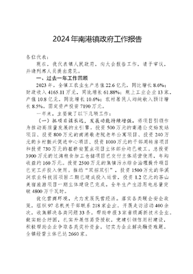 2024年南港镇政府工作报告各位代表:现在,我代表镇人民政府,向大会报告工作,请予审议,并请列席人员提出意见。一、过去一年工作回顾2023年,全镇工农业生产总值22.6亿元,同比增长8.6%;财政收入4165.11万元,同比增长61.88%;规上工业企业13家,产值10.8亿元,同比增长10.6%;农村居民人均纯收入预计增长8.5%,固定资产投资7190万元。一年来,主要做了以下几项工作:(一)抓项目谋长远,发展动能持续增强。将项目引领作为推动高质量发展的主引擎。投资500万元的南港公交始发站项目、投资800万元的南港敬老院老年公寓项目、投资240万元的乡村振兴促进中心项目、投资1000万元的干部周转房项目和投资730万元的崔桥安置点项目主体部分均已竣工。总投资3900万元的过湾粮食加工仓储项目已交付主体运营使用,年均收益约160万元。投资2500万元的集镇污水综合治理提升项目已完工并投入使用。推动双招双引,投资1500万元的华溪涧农业科技园项目二期已建成投入运营,投资1.2亿元的茶山美宿旅游项目一期主体建设已完成。全年生产生活用电总量突破4800万千瓦时。优化营商环境,大力发展民营经济。落实各类暖企安企政策,组织97名机关干部联系218家企业,开展走访活动400余次,收集解决各类问题33条,帮助申报3家省级高新技术企业。做实助企纾困,扎实开展信易贷授权,党建引领信用村建设,积极帮助企业争取各类奖补资金,切实为企业解决融资难题。全镇经营主体已达2660家。(二)抓产业夯基础,乡村振兴全面推进。突出粮食安全第一责任。实现粮食种植面积5.8万亩,产量3.27万吨,农业生产总值4.7亿元。守牢保护红线,新增耕地50亩,整治恢复违法占用耕地110亩。新建1200亩高标准农田、实施2000亩小田变大田和8个小型农田水利设施项目。提升2.5万亩绿色食品原料基地,高质量完成机插秧、秋收秋种。做大做强粮食生产加工销售支柱产业。完成产值14.2亿元,其中直通长三角地区销售额5亿元。以粮食生产加工销售,富硒稻米杂粮产销,特色种养农产品供给为主导的产业集聚已经形成。壮大特色产业发展成果。投入280万元新建沙埂茶文化展示中心,新建小兰花茶生产厂房1处,茶叶生产线1条,提升改扩建一批茶园,茶产业发展得到进一步提升。加快农文旅融合进程,举办乡村旅游节2场,开展线上线下旅游推介20余次,有效增添了南港农文旅人气。过湾农耕文旅,集镇沙埂公义农特产品、茶文化旅游,郭店石头康养休闲游线路已经形成。(三)抓提升促和美,镇村环境更加靓丽。打响人居环境整治攻坚战役,开展爱国卫生运动,倡导文明健康、绿色环保生活方式,引导群众逐步养成良好卫生习惯。推进农村三大革命,完成卫生厕所改造450户,实施污水管网延伸工程10公里、修复工程1.8公里。建设9个美丽宜居自然村庄,申报1个省级和美乡村精品示范村。开展文明创建,全县农村人居环境整治提升暨集镇整治工作观摩会在我镇召开。推进生态环境问题整改回头看,整治销号突出问题10个。投入380余万元实施沙埂曹家冲地质环境综合治理项目。压实河长制、林长制责任,开展巡河1884次,巡林948次。紧抓秸秆禁烧和森林防火工作,常态化开展巡查,全年未发生重大火情。国家储备林项目、南港河综合治理项目、西衖街道旅游配套项目等一批重大项目相继启动,绿色振兴、生态南港的风韵进一步展现。(四)抓公平重保障,民生福祉持续增进。始终以改善民生福祉为主线和目标,让高质量发展成果更多更好地惠及南港人民。巩固拓展脱贫攻坚成果,牢牢守住不发生规模性返贫底线,严格落实四个不摘要求,做实产业、就业、教育、医疗等帮扶措施,抓好问题排查整改。持续完善社会保障体系,发放各类民政保障资金1765.42万元,城乡居民医保参保37766人,养老保险参保17204人。不断改善基础设施条件,投资240万元,建成2个山区自来水饮水工程项目;投资1000多万元,新建、改造农村公路27.23公里。推进文化惠民工程,增加全民健身场地供给,完成送戏下村19场,送电影下村217场,举办乡村四季村晚6场,广场舞比赛1场,乡村运动会1场。持续落实双减政策,全力提高教学质量。不断提升卫生服务水平,新建街道、花园两个卫生室。深入开展国防动员和双拥共建,强化退役军人服务保障。加强和改进信访工作,解决一批积案难件,群众来信来访和矛盾纠纷得到妥善化解。深入落实安全生产严防严管严控举措,全年未发生安全事故。强力防范电信网络诈骗,统筹抓好防汛抗旱、交通安全、消防安全、食品安全、暑期防溺水、反邪教、八五普法宣传、保密等工作。扎实推进无事找书记党建引领基层社会治理新举措,积极开展最美家庭、最美庭院、最美婆媳评选表彰活动,稳妥推进殡葬改革,着力营造文明乡风。迅速行动,周密部