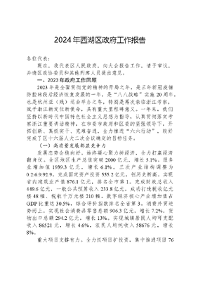 2024年西湖区政府工作报告各位代表:现在,我代表区人民政府,向大会报告工作,请予审议,并请区政协委员和其他列席人员提出意见。一、2023年政府工作回顾2023年是全面贯彻党的精神的开局之年,是三年新冠疫情防控转段后经济恢复发展的一年,是八八战略实施20周年,也是杭州亚(残)运会举办之年,特别是再次亲临浙江考察,赋予浙江新定位新使命,具有重大里程碑意义。一年来,我们坚持以新时代中国特色社会主义思想为指导,认真贯彻落实考察浙江重要讲话精神,在市委市政府和区委的坚强领导下,开拓创新、真抓实干、克难奋进,全力推进六六行动,较好完成了区十六届人大二次会议确定的目标任务。(一)高质量发展彰显竞争力发展态势企稳向好。始终凝心聚力拼经济,全力打赢经济翻身仗。全区地区生产总值突破2000亿元,增长5.1%。服务业增加值1939.3亿元,增长6.1%。三次产业结构调整为0.2:6.9:92.9。完成固定资产投资555.2亿元,创历史新高。实现省内建筑业产值876.1亿元,排名全市第1。完成财政总收入449.6亿元,一般公共预算收入233.8亿元,成功打造税收亿元楼48幢、税收千万元楼210幢。数字经济核心产业增加值占GDP比重达30.5%,综合评价指数排名全省第3。消费外贸逆势而上,实现社会消费品零售总额906.3亿元,增长7.2%,货物出口总额294.2亿元,增长13%。实现城镇居民人均可支配收入86521元,增长4.6%,农民人均纯收入58676元,增长8%。重大项目支撑有力。全力抓项目扩投资,集中推进项目76个,总投资688亿元,有序推进3个省千项万亿重大项目、5个省152项目、55个省市重点项目。举办首场产业土地推介会,实现做地3060亩,出地898亩。大力实施招商引资百日攻坚行动,深化分级分层决策机制,五条赛道六张清单渐入佳境,成功招引泰熙生物、艾罗能源等优质项目,累计落地亿元以上项目149个、10亿元以上项目16个。产业平台勇挑大梁。紫金港科技城工业上楼拿地即开工双双取得新突破,11个提升改造项目全部开工,新增产业空间41万平方米,获评省级高新技术产业园区。云栖小镇承办全省特色小镇现场会,发布打造全国特色小镇第一镇行动计划。艺创小镇落地全国首个网络影视艺术指导中心,挂牌中国文联文艺两新集聚区实践基地,获评省版权示范基地。龙坞茶镇茶博会会议会展中心二期顺利结顶。西溪谷承办全球数字科技峰会,启真概念验证中心投入运营,蚂蚁全球总部二期成功落地。(二)高能级创新彰显驱动力创新生态优化升级。出台成果转化首选地、环大学创新圈两个行动方案,环紫金港创新生态圈入选首批省级创新深化试点。落地高质量高校经济项目190个,实现技术交易额376亿元,排名全省第2。区成果转化科创中心、空天地海创新联合体正式成立,1897科创谷、国科大海思科创园精彩亮相。全职引进两院院士3人,新入选省顶尖人才计划5人、国家级海外高层次人才计划23人,均排名全市第1。全社会R&D经费支出占比达4.36%。315科技创新体系建设工程获评5星。科创平台蓄能增势。全省唯一的国家实验室落地揭牌,智元研究院成功创建省级新型研发机构,国科大杭高院主校区顺利开工,中国空间技术研究院杭州中心启动建设,117N实验室体系基本形成。西湖智算公共服务中心授牌成立。阿里云通义千问大模型2.0成功问世,蚂蚁科技工业级金融大模型正式发布。74项科技成果获省科学技术奖。科技成果转化指数、科技进步创新指数均排名全省前3。蝉联省科技创新鼎。市场主体活力迸发。北交所浙江基地成为全省首个区域性股权市场创新试点,新增上市及挂牌企业14家。新增国家级专精特新小巨人企业6家、国家高新技术企业251家、省科技小巨人企业3家、省科技型中小企业861家、省专精特新企业120家。独角兽(准独角兽)企业突破58家。获评省级企业研究院6家,认定省级企业研发中心26家、市级企业研发中心39家。认定总部企业42家,其中五星级总部2家。阿里云、迪安诊断荣获省政府质量奖,实现零的突破。(三)高效能改革彰显牵引力营商环境有力有感。举办营商环境优化提升千人大会,创新聘请营商环境体验官20人,营商环境无感监测指数排名全省前2。发布第一批8个领域147项轻微违法首违不罚事项清单。商会调解中心、数字知产警官、检察e站、财政红领赋能模式等特色项目有序推进。数字生活街区、市场化多元解纷机制改革获评全省营商环境最佳实践案例。增值改革见行见效。区企业综合服务中心实体化运行,开发上线全国首个AI企服数智平台,双千、科技八点半等品牌持续擦亮。创新推出政务服务六办六进,完善15分钟办事服务圈。出台平台经济、总部经济、飞天企业、科技创新等一揽子政策,累计兑现惠企资金超40亿元,落实减负降本47亿元。重点