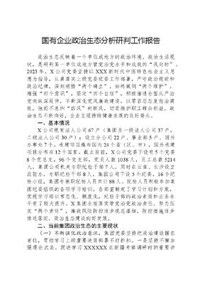 国有企业政治生态分析研判工作报告政治生态反映着一个单位或地方的政治环境、政治生活现状,是研判某一单位或地方管党治党水平和成效的风向标。2023年,X公司党委坚持以XXX新时代中国特色社会主义思想为指导,认真落实上级党委纪委工作部署,严守政治规矩和政治纪律,深刻领悟两个确立,始终做到两个维护,增强四个意识,坚定四个自信,积极推进全面从严治党向纵深延伸,不断深化党风廉政建设,以零容忍态度惩治腐败,弛而不息纠四风树新风,切实维护职工群众利益,政治生态不断向好,企业呈现持续健康发展的良好势头。一、基本情况X公司现有法人公司67户(集团及一级法人公司37户,二级法人公司30户);设立分公司22户、事业部5户、国外办事处7个。承建项目遍布国内24个省(区、市),国外承建项目分布在12个国家。截止目前,X公司党委下设有5个党委8个党总支,96个党支部,党员人数1038人,员工总数5214人。集团公司机关专职纪检干部7人,同时在云南、长沙设立派驻办,专职纪检干部8人,集团公司下设5个纪委,16个纪检小组,集团专兼职纪检人员共计88人。纪检人员积极参加集团纪委组织的各项学习培训,各部室制定了学习计划和方案,实现学习培训常态化、制度化,纪检干部的政治素质和业务水平有了较大提升。X集团全面落实管党治党政治责任,努力压实两个责任,廉政风险防控逐步规范落细,防控措施逐步推进落实,政治生态建设向好发展。二、当前集团政治生态的主要现状(一)不断强化政治意识。集团党委坚持把政治建设摆在首位,贯彻学习上级重要决策部署不打折扣。一是坚持不懈加强理论武装。跟进学习XXXXXX在新疆考察调研时的重要讲话精神,深入贯彻领会,不断提高政治判断力、政治领悟力、政治执行力。2023年以来,X集团党委共召开党委会19次,开展第一议题学习19次,学习内容77项。截止2月底,X集团党委理论学习中心组共计学习7次。二是认真履行全面从严治党责任。坚持不懈推进管党治党向纵深延伸,制定《X集团关于落实全面从严治党委主体责任和纪委监督责任的实施意见》,把全面从严治党,加强党的建设与经营建设工作同部署、同落实、同检查、同考核。三是锲而不舍推动决策部署落实。把贯彻落实上级党委、纪委决策部署作为践行两个维护的根本检验,把贯彻落实上级决策部署作为日常监督的基本内容,监督围绕集团党委中心工作和重点任务,查落实、督整改、促成效,扎实推动各项决策部署落地见效,以实际行动体现了对党忠诚。(二)作风建设不断加强。持续深化态度再认真一点、责任心再强一点、效率再高一点、工作再细一点、落实再快一分作风建设,大力倡导抓工作落地、落细、落实的三落作风,提升经营管理如履薄冰、如坐针毡、如临深渊的三如意识,大力弘扬多为成功找办法,少为失败找理由;今天工作不努力,明天努力找工作;今天再晚都是早,明天再早都是晚的三种作风,积极引导全集团要团队,不要团伙的理念和相互补台好戏连台、互相拆台一起垮台的团队意识。成立X集团效能办公室,落实作风建设每月通报机制,凝聚干事创业合力。截止3月1日,下发作风建设通报7期,对在集团安排部署重点工作中担当不足、责任心不强、标准不严、效率不高的21个单位、8名一级单位领导、6名分公司高管、2名项目经理进行通报批评。加强警示教育力度。集团党委2次开展全集团范围的干部警示教育大会,全体党员干部共参会达2155人次,对照身边反面典型深化以案促改、以案促治工作,教育引导各级党员领导干部受警醒、知敬畏,切实增强集团广大干部廉洁自律意识,持续净化政治生态。(三)党内监督日益完善。严格执行民主集中制。加强党委的统一领导,不搞无原则团结,1月24日,集团党委组织召开《X集团学习教育专题民主生活会》通过积极的批评和自我批评,统一思想,形成工作合力。严管厚爱,监督提醒到位。针对黄X、李X、何X三名集团高管工作中思想认识不到位、工作作风不扎实、工作审核把关不严格的问题在集团范围内进行通报批评、并向集团党委作书面检查,有效发挥集团党委对班子成员严管厚爱,及时提醒的监督作用。有效发挥谈话提醒、约谈函询在党内监督中的作用。年初以来,集团党委书记与所属8个一级单位主要领导进行谈话,要求各级党委切实履行全面从严治党第一责任人责任,扎实推进全面从严治党各项工作落实,严肃党内生活,推动党的组织生活制度化、经常化、规范化,严守政治纪律和政治规矩,为净化政治生态营造好的气候环境。集团纪委本着对干部高度负责的态度,坚持每月与各一级单位主要领导、部分高管进行约谈,截止2月底累计约谈20人次。要求各一级单位领导严格落实全面从严治党主体责任,认真落实一岗双责,带头履职。(四)选人用人机制不断完善。一是创新选人用人模式机制,扩宽选人用人渠道,让真正想干事、能干事、干成事的人有