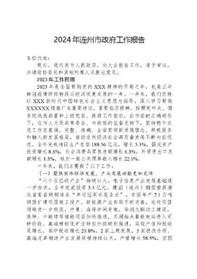 2024年连州市政府工作报告各位代表:现在,我代表市人民政府,向大会报告工作,请予审议,并请政协委员和其他列席人员提出意见。2023年工作回顾2023年是全面贯彻党的XXX精神的开局之年,也是三年新冠疫情防控转段后经济恢复发展的一年。一年来,我们坚持以XXX新时代中国特色社会主义思想为指导,深入学习贯彻XXXXXX视察广东重要讲话、重要指示精神,按照党中央、国务院决策部署和上级党委、政府工作要求,在市委的正确领导下,在市人大及其常委会、市政协的监督支持下,坚持稳中求进工作总基调,完整、准确、全面贯彻新发展理念,积极服务和融入新发展格局,推动连州经济社会高质量发展不断向前迈进。全年完成地区生产总值188.56亿元,增长5.3%,固定资产投资增长8.6%,社会消费品零售总额增长6.3%,外贸进出口总额增长1.3%,地方一般公共预算收入增长22.9%。一年来,我们主要做了以下工作:(一)聚焦实体经济发展,产业发展动能更加充沛六个百亿级产业持续壮大。电子信息产业发展基础进一步夯实,全年完成投资3.4亿元,建滔(连州)铜箔荣获清远首家省级制造业单项冠军示范企业,东强年产2.1万吨铜箔扩建项目竣工投产。新能源产业布局不断完善,光伏项目用地进一步规范,中曼、海得并网发电,华润九期动工建设,连坤、中能建等储能项目加快推进,天湖抽水蓄能电站进入可研阶段。高端精细化矿业转型升级顺利推进,实现产值和税收双增长,其中税收增长25.8%,2家上规发展,5家技改升级。高端皮革制造产业发展规模持续壮大,产值增长58.5%,宏图一期投产上规,酷彩、逸驰试投产。高端食品药品产业发展势头强劲,五大特色农产品﹝1﹞综合产值增长22.9%,玉竹、黄精、溪黄草等中药材产值4亿元。文旅产业蓬勃发展,瑶安民族风情旅游小镇、东陂西塘、保安福山等文旅项目动工建设,获评中国最美休闲度假旅游城市,全年接待游客人次增长率、旅游综合总收入增长率排名清远第1。重点项目持续推进。全市27个重点项目完成投资22.12亿元,完成年度计划122.84%,其中15个省、清远市重点项目完成投资16.37亿元,完成年度计划158.93%,完成率排名清远第1。争取上级资金17.89亿元,盘活闲置低效工业用地212亩,完成供地1634亩,有效保障项目推进。东陂城乡融合发展省级中心镇试点项目动工建设,宏日盛光伏完成年度投资计划245%,琪瑞新材料提前投产。招商引资成效持续彰显。依托连通四海 共赢九州国际招商推介平台,积极对接央企、大型国企、优质民企。全年引进项目32个、总投资金额100.08亿元,其中3亿元以上项目12个。坚持大招商、招大商,市领导带队赴大湾区、沿海省市考察招商,同粤名电力、广物集团、广晟控股等完成签约。成功举办2023招商引资推介会,集中签约12个优质项目。落实招商引资项目全流程管理,26个项目动工建设,14个项目竣工投产。(二)聚焦实施百千万工程﹝2﹞,城乡区域协调发展动力更加强劲全面推进城乡提质。连州成为清远唯一入选省百千万工程首批典型县,东陂入选首批典型镇,西岸东村、丰阳朱岗等8个村入选首批典型村。省自然资源厅、省铁路建设投资集团、交通银行广东分行、黄埔区结对帮扶连州。与中山大学签约,成为省百校联百县兴千村行动首批试点校县。匹配结对百千万工程突击队项目28个。实施驻镇帮镇扶村项目209个,落实帮扶资金2.8亿元。完成老旧小区改造36个。建成白云制水厂。完成城南污水处理厂主体建设。连州镇入围省镇域经济综合发展力百强。粤湘廊道·南岭明珠乡村振兴示范带被清远评为优秀等次。美丽圩镇七个一﹝3﹞建设初见成效,瑶安纳入清远美丽圩镇示范样板,美丽乡镇入口通道100%覆盖。一镇一房地产乐居计划进展顺利。东陂西塘入选首届全国古村古镇保护利用十佳案例。星子新村、保安种田等4个村入选第六批中国传统村落。建成美丽乡村特色村19个。持续改善农村人居环境,干净整洁村达标率100%。完成四好农村路﹝4﹞提档升级91公里,危桥改造6座。新增5G基站216个,全市行政村5G网络覆盖率100%。全面推进农业产业发展。实现农业总产值54.2亿元,增长7.5%。严格落实耕地保护和粮食安全责任制,建成高标准农田1.9万亩,复耕复种撂荒耕地2500亩,新增水田1200亩,粮食总产量10.97万吨。有效落实菜篮子责任制。持续推进连州菜心溯源体系和标准化建设,完成连州菜心种植13万亩。加强产销对接,开展连州菜心万里行系列活动,推动销售半径南融北拓。连州菜心实现产值14.32亿元,增长19.3%。水晶梨产量7万吨,产值12亿元,增长20%。东陂镇入选首批国家农业产业强镇,东陂腊味产值3.5亿元,增长59.1%。东陂农旅多功能产业园建成投产,腊味生产突破季节性限制。