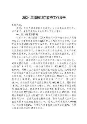 2024年浦东新区政府工作报告各位代表:现在,我代表浦东新区人民政府,向大会报告政府工作,请予审议。请政协委员和其他列席人员提出意见。一、2023年工作回顾过去一年,我们坚持以XXX新时代中国特色社会主义思想为指导,全面贯彻落实党的XXX和二十届历次全会精神,认真学习贯彻XXXXXX重要讲话精神,贯彻落实市第十二次党代会和十二届市委历次全会精神,按照市委、市政府决策部署,在区委的坚强领导下,坚持稳中求进工作总基调,坚定不移贯彻新发展理念,深化高水平改革开放,推动高质量发展,总体完成了区七届人大三次会议确定的年度目标任务。一年来,浦东经济社会运行总体平稳,保持了持续向好、健康发展的态势。一是经济运行进中提质。全年地区生产总值达到16715.15亿元,一般公共预算收入1300.81亿元、同比增长9.1%,规模以上工业总产值达到13660.81亿元,战略性新兴产业制造业产值占工业总产值比重达到50%以上,集成电路、生物医药、人工智能三大先导产业规模达到7300亿元。二是发展活力持续增强。新设各类市场主体5.3万户、同比增长23.1%。全社会固定资产投资总额达到3452.48亿元、同比增长14.1%,其中民间投资同比增长37.4%。社会消费品零售总额达到4090.71亿元,商品销售总额达到57814.38亿元,外贸进出口总额达到25759.04亿元。新认定高新技术企业1703家、有效期内高新技术企业达到4922家,每万人口高价值发明专利拥有量达到75件。三是民生福祉持续改善。全年民生投入占新区一般公共预算支出的比重达到47%,居民人均可支配收入90985元、同比增长8.2%,环境空气质量指数优良率达到89%,人均公园绿地面积达到13.3平方米。一年来,我们主要做了以下工作:(一)改革开放持续攻坚突破,引领区建设全面深化。扎实推动《中共中央国务院关于支持浦东新区高水平改革开放打造社会主义现代化建设引领区的意见》落地落实,区实施方案450项具体任务中423项已完成或基本完成。开放水平不断提高。开展上海自贸试验区设立十周年系列活动,全面总结改革创新经验。上海自贸试验区设立以来,在贸易、投资、金融、航运、人才等方面对接国际通行规则,推出了一大批基础性、开创性改革开放举措,形成了许多标志性、引领性制度创新成果,在国家层面复制推广的302项自贸试验区制度创新成果中,源自上海自贸试验区首创或同步先行先试的事项占比近一半。推进落实《关于在有条件的自由贸易试验区和自由贸易港试点对接国际高标准推进制度型开放的若干措施》市级实施方案和区级工作安排。《全面对接国际高标准经贸规则推进中国(上海)自由贸易试验区高水平制度型开放总体方案》获批,在加快服务贸易扩大开放、提升货物贸易自由化便利化水平、率先实施高标准数字贸易规则、加强知识产权保护等7个方面推出80条开放措施。全国首个丝路电商合作先行区获批创建,明确在浦东打造中心功能区。积极推动保税区、陆家嘴、金桥、张江、世博等片区功能拓展,持续打造主题特色鲜明的开放前沿阵地。改革力度持续加大。稳步推进浦东新区综合改革试点,推出全国首个航运期货品种、首单国际原油跨境数字人民币结算交易、首个在海关特殊监管区域建设的诚信示范区、外籍高层次人才永久居留推荐直通车等一批改革试点。巩固深化一业一证改革,全国首创行业综合许可变更注销免申即办,市场准营承诺即入制改革实施范围扩大至22个行业。拓展政务智能办服务模式,一网通办进一步提质增效,政务数字人小浦投入试运行,金融、法律、税务等专业服务加快嵌入。改革苗圃变森林行动成效明显,生物医药入境特殊物品联合监管检疫等改革试点向条件管理转化。深化区文可居文库——海量学习资料,手机电脑下载www.wenkeju.com属国资国企改革,全面推进十大专项行动,加快三能机制改革落地见效。立法保障日益完善。经过市区两级人大的全力推动,在生态环境保护、融资租赁等领域出台3部浦东新区法规、累计达到18部,在免办强制性产品认证、无人驾驶装备等领域出台9部管理措施、累计达到22部,有力支撑了改革创新和经济社会发展。深化市区联动、部门协同机制,43件浦东新区法规项目纳入全市立法五年规划,制定发布管理措施五年规划。畅通立法意见征求渠道,首批设立18个区政府基层立法联系点,首次聘任3位境外法律专家担任区立法专家。开展4部浦东新区法规和4部管理措施成效评估,进一步推动立法项目落地见效。(二)聚力稳增长强功能,高质量发展扎实推进。认真落实全市出台的产业发展、投资促进等各项政策举措,制定实施强动能增活力优服务行动方案,推出稳外贸、促消费、支持大宗商品和会展高质量发展等一系列措施,举办五五购物节、汽车嘉年华、浦东夜滨江市集等活动,开展共赢浦东系列投资促进