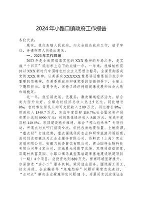 2024年小路口镇政府工作报告各位代表:现在,我代表镇人民政府,向大会报告政府工作,请予审议,并请列席人员提出意见。一、2023年工作回顾2023年是全面贯彻落实党的XXX精神的开局之年,是实施十四五规划承上启下的关键一年。一年来,我镇始终坚持以XXX新时代中国特色社会主义思想为指导,全面贯彻落实党的XXX精神,认真落实XXXXXX重要讲话重要指示批示和重要回信精神,在县委县政府和镇党委的坚强领导下,全镇上下履职担当,奋勇争先,保持了经济持续健康发展和社会大局和谐稳定。这一年,我们谋发展、优服务,激发镇域经济活力。综合实力回升向好。全镇农村经济总收入达2.5亿元,同比增长8%;农村常住居民人均可支配收入2.09万元,同比增长8%;财政收入1549.7万元,完成年度目标110.7%;社会固定资产投资累计达到6900万元;村级集体经济收入548万元,完成年度目标140.5%。项目建设稳步推进。结合祁心创未来专项行动,开展点对点叩门招商9次,依托自身地理位置、土地资源、重点村打造优势,重点围绕休闲农业和研学旅游开展招商。成功引进安徽汉为汇企业服务有限公司、品鲜农(上海)实业发展有限公司、安徽刀板香餐饮有限公司、黄山国科生物科技有限公司等4家公司,实施晨光村数字农场、双莲村菇菇部落、双莲村共富菜园、小路口镇鸟巢型雾培蔬果基地建设联建项目(一期)4个项目,总投资达到830万元。营商环境显著提升。加深推进店小二服务机制,做好驻企服务,围绕招工用工、技术升级、企业融资等急难愁盼问题开展常态化走访,点对点解决企业疑难诉求问题11个。开展历史沉淀保证金专项清理活动,排查沉淀金额13.85万元。进村入户开展送岗活动,加大就业宣传力度,帮助解决个人创业贷款20万元,实现23人稳岗就业。这一年,我们固成效、促振兴,夯实乡村发展根基。脱贫成果持续巩固。常态化开展防止返贫监测帮扶,防贫保政策惠及脱贫户341户654人,投保覆盖率达100%。安排14名脱贫人员担任生态护林员。落实全镇产业到户项目241户19.5万元,外出务工就业交通补贴87人4.71万元,居家就业补贴2人6000元,教育资助32人2.69万元,雨露计划4人6000元。农业产业硕果累累。食用菌种植产业发展突出,香菇、木耳、羊肚菌年产量120万棒,年产食用菌100万斤,产值近千万元,以晨光、春风为中心,辐射大丰、石谷、胜利、双莲等村的食用菌产业带正在形成。葡萄、猕猴桃、湖羊和蛋鸡等特色产业持续发力,60亩共富菜园完成种植,45户农户参与订单生产,构建了城乡农产品直供模式。农文旅体融合发展。围绕讲好一棵树,种好一片菇,培育乡村推介官2名,完成五小园微景观改造23处、10处美丽庭院打造。线上邀请电商直播助力特色农产品销售,接待研学旅游5批次300余人,乡村品牌成效初显,特色农产品得到推广。这一年,我们强基础、重实干,彰显和美乡村魅力。基础设施日益完善。对上争取项目资金359万元,完成春风村石一组高标农田护岸、叶村桥饮水工程、胜利村农村道路安保工程、宋坑饮水工程等14个项目,不断补齐乡村基础设施短板。人居环境持续向好。大力整治脏、乱、差现象,对镇辖区内G237沿线蓝色铁皮棚喷灰2800平方米,拆除墙面广告74余处,清理乱搭乱建17处,清理街道弄头巷尾垃圾137余处,拆除G237主干道无功能建筑、棚厕10余个,进行卫生厕所改造46个。大丰村和晨光村分别在3月份和7月份的全市文明创建村庄擂台赛中获得第一名和第三名。生态保护常抓不懈。全面落实河长制林长制,扎实开展松材线虫病防治工作,文可居文库——海量学习资料,手机电脑下载www.wenkeju.com按时按质完成松材线虫病防治、春季普查等各项工作任务,实现全镇无疫情并拔除疫点。大力开展造林绿化工作,完成封山育林、森林抚育、退化林修复等共计15000亩。持续抓好茶园绿色防控,落实茶长制工作职责,签订茶园绿色防控承诺书1000余份,发放黄板29万余张,实现全域范围内黄板扦插。坚持常态化推进秸秆禁烧工作,发放《关于秸秆禁烧致农民朋友的一封信》1200份,以户为单位签订秸秆禁烧承诺书730余份。这一年,我们惠民生、防风险,提升人民幸福指数。社会保障有效落实。发放农村低保、农村五保、两残补贴各类财政补贴类资金351.97万元。城乡居民医疗保险参保人数5273人、参保率达92.53%,城乡居民养老保险缴费人数2228人、续保率达79.09%,人均缴费水平达到898元,建成千元村2个。实施十项暖民心行动,开展老年助餐服务、就业促进、快乐健身、安心托幼等行动,举办民生工程宣传月文艺汇演,开展送戏进万村6次,营造浓厚的民生社会氛围。安全生产常抓不懈。压实安全生产一岗双责,常态化开展消防、道路交通、燃气
