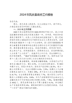 2024年凤庆县政府工作报告各位代表:现在,我代表县人民政府,向大会报告工作,请予审议,并请县政协委员和列席人员提出意见。一、2023年工作回顾2023年是全面贯彻党的XXX精神的开局之年,是三年新冠疫情防控转段后经济恢复发展的一年。在市委、市政府和县委的正确领导下,在县人大和县政协的监督支持下,县人民政府始终坚持以XXX新时代中国特色社会主义思想为指导,全面贯彻党的XXX和二十届二中全会精神,深入落实XXXXXX考察云南重要讲话精神和给沧源县边境村老支书们的重要回信精神,高质量统筹发展与安全,抓经济稳增长、抓项目扩投资、抓主体壮产业、抓衔接促振兴、抓绿美优生态、抓创新增动能,大力发展三大经济,实施系列三年行动,民生保障有力,经济稳进提质,3815发展战略迈出稳健一步,较好完成了县第十八届人民代表大会第二次会议确定的目标任务。(一)着力稳增长,综合实力持续增强。全县地区生产总值完成186.45亿元、增长4.2%,在全省排名第44位、较2022年提升1位、实现4年连升;固定资产投资增长21.3%,地方一般公共预算收入、支出分别增长4.4%、2.9%;规模以上工业增加值完成16.9亿元、负增长10%,其中县内工业企业增加值同比减7%;社会消费品零售总额增长7.7%,城乡居民人均可支配收入分别增长4.5%、8.4%,市外产业招商到位资金60.4亿元,金融机构本外币存贷款余额分别增长9.1%、7.3%,城镇新增就业4902人,居民消费价格总水平累计涨幅为0.1%,单位地区生产总值能耗降低4%。高效推进第五次全国经济普查。完成十四五规划中期评估和调度。(二)着力扩投资,发展基础持续稳固。全面落实高质量做好项目工作的指导意见,促进投资总量不断增长,结构有所优化。认真组织开展重大项目集中开(竣)工月调度工作,纳入市级集中开工项目83个、总投资31.77亿元,纳入省级重大产业项目15个、总投资3.68亿元。积极谋划储备重大产业项目,完成产业投资47.27亿元、增长19.3%,占全部投资的52.1%。能源以外工业投资增长51.9%,旅游、交通投资增速均居全市第1位。中和机场正式通航,郭大寨水库、天生桥水库实现竣工验收,干口光伏项目实现全容量并网。巍凤高速、犀牛大桥、澜沧江(凤庆段)航运基础设施项目扎实推进。凤永高速、云保铁路、江北国防公路、迎春水库等前期工作有序推进。争取到光伏发电项目建设指标38万千瓦,争取到国债资金2.43亿元支持大摆田水库、清水河灌区建设。完成30户以上自然村通硬化路411公里、农村公路危桥改造5座、安防建设220公里。(三)着力强链条,产业发展提质增速。以链长制推进重点产业发展,加快产业强县建设。核桃产业链式发展。培育核桃龙头企业24户,实现综合产值48.5亿元。核桃标准化加工率达95%以上。冷链物流仓储暨托管交易中心、核桃基配油生产加工、中国云南核桃产业云等项目启动试运营。云南木本油料(核桃)全产业链创新研究院入选云南省新型研发机构培育对象(初创型)。5个品牌入选云南省绿色云品品牌目录。第四届国家核桃油及核桃加工产业创新战略联盟年会在凤庆举办。滇红茶产业组织化推进。培育省级以上龙头企业4户,推进初制所规范化建设,精制茶占比提高8.27个百分点,实现综合产值77.74亿元。创建成为全省首个茶叶类全国绿色食品原料标准化生产基地,荣获大叶种滇红茶黄金产区称号,凤庆滇红茶产业联盟等入选国家现代农业全产业链标准化示范基地创建名单,三宁茶业申报国家级农业龙头企业有序推进。陈升红茶业总部基地建成投运。成立滇红茶文化研究会,有力推进滇红茶产业品牌重塑,12个品牌入选文可居文库——海量学习资料,手机电脑均可下载www.wenkeju.com云南省绿色云品品牌目录。举办了2023红茶大会暨天下茶尊·红茶之都云南临沧(凤庆)红茶节。中药材产业持续发展。完成中药材种植8800亩,组建中药材产业发展农民专业合作社50个。累计建成林下经济示范基地65.23万亩,林下经济产值达5.9亿元。畜牧产业加快发展。肉牛养殖规模持续壮大,滇西生猪交易中心平台建设稳步推进。畜牧业产值达35.19亿元。数字经济有序推进。建成4G基站1339个、5G基站693个。有序推进市政基础设施智慧指挥中心及滇红大道智慧化建设,建成智慧小区10个,完成城市公园智慧化改造10个,建成互联网智慧医疗平台。农村集体三资综合管理平台建设有序推进。文旅康养稳步发展。大兴温泉度假村部分项目投入运营,澜沧江航道旅游项目稳步推进。以鲁史为中心全域旅游规划建设有序推进。安石村被认定为2023年云南省最美乡愁旅游地,滇红茗茶寻根之旅列入文旅部2023年第二期乡村四时好风光全国乡村旅游精品线路。3200红茶文化苑成为省