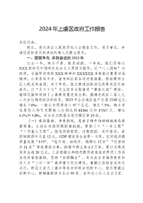 2024年上虞区政府工作报告各位代表:现在,我代表区人民政府向大会报告工作,请予审议,并请区政协委员和其他列席人员提出意见。一、图强争先 奔跑奋进的2023年过去一年,殊为不易、极具挑战。一年来,我们坚持以XXX新时代中国特色社会主义思想为指导,以八八战略为统领,全面贯彻党的XXX精神和XXXXXX考察浙江重要讲话精神,认真落实中央、省市和区委各项决策部署,团结带领全区人民克难奋进、实干争先,强力推进创新深化改革攻坚开放提升,以五个十大为主抓手全面推进青春之城建设,继续巩固和保持了上虞高质量发展态势,圆满完成区二届人大二次会议确定的目标任务。2023年全区地区生产总值1318亿元、增长7.6%;一般公共预算收入97.7亿元、增长7.3%;城乡常住居民人均可支配收入分别达到81366元和47567元、增长4.5%和5.8%,综合实力跃居全国百强区第29位。 (一)承压奋进、争先创优,交出了稳中向好的经济高质量答卷。主动应对超预期困难挑战,聚焦三个一号工程十项重大工程,强化预期管理、过程把控、闭环落实,省级晾晒获评五星12次,GDP增速居全省第一方阵。打好经济高质量发展1+9、抢开局、拼经济、稳增长12条民营经济31条等政策组合拳,新增市场主体1.5万家,累计兑现政策资金超20亿元,工业稳增长和稳进提质政策落实两项工作获省政府督查激励。坚持四链融合,率先在全省推进教育科技人才三位一体高质量示范区建设,曹娥江实验室实体化运行,新设立浙大上虞半导体材料联合创新中心、复旦曹娥江创新中心,新增高新技术企业99家、省科技小巨人企业2家、省级以上研发机构16家,承担省级以上重大科技研发项目4个,获省科技奖6项、全市第1,蝉联省科技创新鼎。深入实施先进制造业1215专项行动,新材料、高端装备制造两大产业规上工业产值分别突破1000亿元、600亿元,精细化工、集成电路产业分别入选省级特色产业集群核心区、协同区,新增国家级专精特新小巨人企业5家、销售超亿元企业15家,入选全省首批雄鹰企业3家,获省政府质量管理创新奖,获评全市唯一的省小微企业三年成长计划优秀县(市、区),夺取首批浙江制造天工鼎。谋划启动2+X+N未来产业社区建设,百官、东关、小越、崧厦、永和等镇街率先破题开局,引进2000万元以上项目13个,有效拓展镇街产业发展空间。与省证监局、财通证券开展战略合作,全方位支持企业上市,新增上市1家、过会2家,全市第1,累计上市(过会)22家、全省第7。举办百团千企拓市场抢订单汽车家电畅购等系列活动,累计拉动消费9亿元,列入省首批国际营销体系创新试点,获评省夜间经济特色城市、省数字贸易示范区。严格落实耕地保护制度,省粮食安全责任制考核优秀实现十连冠,粮食产量连续15年保持全省前2,列入国家农业现代化示范区创建名单。坚持稳预期、稳地价、稳房价不动摇,出台房地产7+2政策及20条新政,商品房销售面积增速全市前列,建筑业总产值超1300亿元。持续推动人才加速集聚,创新推出零元入住青春公寓980套,实现码上申请、智能择房、拎包入住,新增市级以上领军人才125名、就业大学生2.6万名,高分通过全国青年发展型县域试点中期评估。持续推进政务服务增值化改革,拿地即开工结顶预验收惠及一大批企业,探索一般工业项目审批瘦身,启用全省首家有外国人签证权限的县级移民事务服务中心,率先在全市实体化运作企业综合服务中心,新材料中试项目管理、新市民乐居乐业增值改革入选省营商环境优化提升最佳实践案例。(二)项目为王、拼搏实干,交出了蓄势聚能的项目高质文可居文库——海量学习资料,手机电脑均可下载www.wenkeju.com量答卷。坚持一切围着项目转、一切盯着项目干,六个一批双百双千重大项目年度投资完成率108%,实现全区固定资产投资362亿元、增长20%、全市第1。深化双月赛马晾晒等项目推进八大机制,累计评选红旗项目275个、黄旗项目51个、蜗牛项目24个,省千项万亿、省重大产业、省集中开工、省市县长、省重点开工等项目开工入库率提前实现5个100%,获全省投资赛马激励。瞄准北上广深等城市,主攻新材料、高端装备制造等主导产业,大力推进驻点招商、节会招商、上门招商,引进10亿元以上项目14个,其中100亿元以上2个、单年招引落地数历史最多,实到外资2.7亿美元、全市第1,获全省招大引强十强县(市、区)。深入开展爱企行动、五创图强、四进争先大走访大调研大服务、政企服务直通车等系列活动,区四套班子领导带队深入一线、现场办公,协调解决各类问题217个,晶盛半导体和时光新能源两个百亿级项目实现当年招引、当年落地、当年开工,总投资183亿元的卧龙