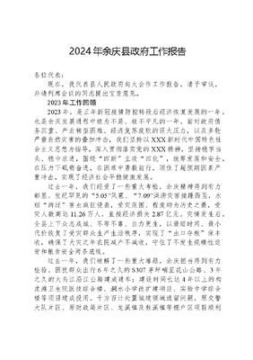 2024年余庆县政府工作报告各位代表:现在,我代表县人民政府向大会作工作报告,请予审议,并请列席会议的同志提出宝贵意见。2023年工作回顾2023年,是三年新冠疫情防控转段后经济恢复发展的一年,也是余庆发展进程中极为不易、极不平凡的一年。面对政府债务沉重、产业转型困难、经济复苏疲软的巨大压力,以及多轮严重自然灾害的叠加冲击,我们坚持以XXX新时代中国特色社会主义思想为指导,深入贯彻落实党的XXX精神,坚持稳字当头、稳中求进,围绕四新主攻四化,统筹发展和安全,在压力下砥砺奋进,在困难中勇毅前行,顶住了超预期因素严重冲击,实现了经济社会平稳健康发展。过去一年,我们经受了一些重大考验,余庆精神得到有力彰显。世纪罕见的5.05风雹、7.09洪涝灾害接踵而至,水稻两迁害虫疯狂侵袭,受灾范围、程度均为历史之最,受灾人数高达11.26万人,直接经济损失2.87亿元。灾情发生后,全县上下众志成城、不等不靠、自力更生,以最短时间、最小代价恢复了受灾群众生产生活秩序,实现了虫口夺粮保丰收,确保了大灾之年农民减产不减收,守住了不发生规模性返贫和粮食安全两条底线。过去一年,我们破解了一些重大难题,余庆担当得到有力检验。困扰群众出行6年之久的S307茅坪哨至花山公路、3年之久的大乌江沿江公路建成通车;建设时间长达4年以上的构皮滩卫生院医技综合楼、洞水小学改扩建项目、实验中学综合楼等项目建成投用。千方百计处置城建领域遗留问题,原交警大队片区、原财政局片区、龙溪镇及敖溪镇等棚户区项目顺利交房,标志着历时7年之久的3337户棚户区和危旧房屋改造任务全面完成。全力破解要素保障难题,小乌江水库通过下闸蓄水验收,全省最大的团结水库除险加固工程顺利推进。过去一年,我们取得了一些重大成就,余庆形象得到有力提升。先后获评全国自然资源节约集约示范县全国农业现代化示范区全国茶叶百强县等一批国字号荣誉。生态环境保护、土地处置等工作获省政府表扬激励。作为贵州2个县(市)之一在生态文明贵阳国际论坛上分享余庆经验。首次承接中央党校中青班开展红色教育培训,高质量筹办全省红十字会基层组织建设现场会。全县各级各部门共获得国家级荣誉7项,获市级以上通报表扬、表彰奖励43次,创建工作试点县、示范单位、示范基地12个,获市级以上经验推广4项。过去一年,我们主要做了以下工作:一、统筹兼顾稳增长,经济大盘稳中有进。面对严峻复杂的经济形势和超预期的因素影响,我们迎难而上、知难而进,保持战略定力,锚定目标发力,尽锐出战打好经济增长主动仗,实现经济运行整体好转、步伐加快、质效提升。全年完成地区生产总值101.22亿元,增长5.8%;一般公共预算收入2.74亿元,增长15.4%;规模工业增加值下降32.3%;500万元以上固定资产投资下降0.7%;社会消费品零售总额22.84亿元,增长9%;城乡居民人均可支配收入39607元、17662元,分别增长4.3%、8.3%。二、提质增效促转型,产业发展稳步提升。现代农业稳健推进。茶叶、红粱、生猪、肉牛等特色优势产业持续发展,实现农业总产值48.74亿元、增长4.3%。围绕五个一票否决指标,严守耕地保护红线,稳定粮食播种面积56.41万亩、产量16.64万吨,提前完成十四五新增储备粮任务。新建茶园3000亩,余庆苦丁茶被认定为贵州特色农产品。收购烤烟11.5万担,完成烟叶特产税4406万元。建成城镇保供蔬菜基地8000亩。出栏生猪28.44万头、牛羊2.2万头。新增市级以文可居文库——海量学习资料,手机电脑均可下载www.wenkeju.com上龙头企业、合作示范社、家庭农场11个,农产品加工转化率达62%,贵州印之谷农业有限公司荣获国家级生态农场称号。余庆剔骨鸭入选黔菜师傅工程菜品。余庆县农业农村局、松烟镇获评遵义市农业现代化先进单位。工业经济承压前行。齐力抓好工业经济止滑回稳工作,新增规模工业企业3家,酱香白酒、烟花爆竹、茶叶精深加工等优势产业加速聚集,完成工业投资7.54亿元,工业总产值42.1亿元。成功引进太子参加工企业3家,酒及酒配套项目3个。完成《烟花爆竹产业发展集聚区规划》编制,建成投产烟花爆竹项目3个,大合、黔雄等9家烟花爆竹企业完成技改并投产,与市供销社、市物资集团组建遵义烟花爆竹产业集团。实现一绿两新主导产业总产值5.97亿元,增长18.07%。全域旅游强劲回暖。提质改造飞龙寨景区游览环境和配套设施。做优红渡、玉河等余庆坊民宿品牌,累计创建、改造、提升民宿床位2500余张。旅游+烟花+融合发展,焰遇飞龙湖、烟花漫游等文旅营销活动精彩纷呈,多彩贵州自行车联赛、美丽乡村篮球赛等体育赛事丰富多彩,本地游、周边游持续走热,全年接待国内过夜游客45.52万人次、增长4