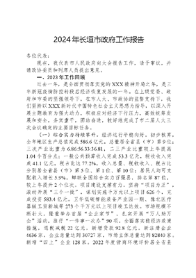 2024年长垣市政府工作报告各位代表:现在,我代表市人民政府向大会报告工作,请予审议,并请政协委员和列席人员提出意见。一、2023年工作回顾过去一年,是全面贯彻落实党的XXX精神开局之年,是三年新冠疫情防控转段后经济恢复发展的一年。在上级党委、政府和市委的坚强领导下,在市人大、市政协的监督支持下,我们坚持以XXX新时代中国特色社会主义思想为指导,以深入开展主题教育为强大动力,积极应对经济下行压力,高效统筹发展和安全,务实重干,团结奋进,较好地完成了市二届人大三次会议确定的主要目标任务。(一)综合实力持续攀升。经济运行平稳向好。初步核算,全年地区生产总值完成586.6亿元,总量居全省县(市)第9位;三次产业比重为6.86:56.33:36.81,二三产业比重较上年提高1.04个百分点;一般公共预算收入完成53.3亿元,税收收入完成41.1亿元,税占比达77.2%,收入总量、税收收入、税占比分别居全省县(市)第5位、第1位、第10位;居民人均可支配收入增长5.9%。蝉联全国综合实力百强县,排名第87位,较上年提升2个位次。项目建设支撑有力。坚持项目为王,滚动开展三个一批,谋划实施千万元以上项目626个,完成投资583.4亿元。卫华低碳智能装备产业园一期、豫北医疗器械工贸新城等273个千万元以上项目竣工达效。市场规模不断壮大。隆重举办首届企业家节,扎实开展万人助万企活动,推行一件事一次办90项。全面落实稳经济政策措施,退税减税22亿元,新增贷款92.8亿元。新注册企业4636家,企业总量达到30727家,市场主体总量达到82840家。新增四上企业128家。2022年度营商环境评价居全省县(市)第6位。强化四项对接激发民营经济发展新动能典型经验做法获省政府通报表扬。(二)产业发展提质增效。主导产业链式增长。实施技术改造项目223个,完成投资199.5亿元。与红谷科技、上海大学、中晶环境等92家院所机构开展产学研合作创新,新增省级以上创新型平台15家、省瞪羚企业7家、省制造业头雁企业5家、省单项冠军企业6家、省专精特新企业17家,高新技术产业增加值占规上工业增加值的比重达90.7%。引进高层次人才86人。研发投入强度达3.45%,规上工业企业研发覆盖率达86.9%,成功入选国家创新型县(市)建设名单。卫华集团荣获全省唯一全国工商联科技创新民营企业荣誉称号。新乡市政府表彰功勋企业家6位,入选2023年度新乡市优秀企业25家,分别占新乡市的30%、16%。新兴未来产业抢滩布局。实施投资30亿元的铝基新材料产业示范基地、投资5亿元的领创超硬材料生产基地等新兴产业、未来产业项目21个,完成投资63.5亿元。战略性新兴产业增加值占规上工业增加值比重达14.2%。现代农业质效提升。粮食总产15.6亿斤。新培育农民专业合作社、家庭农场30家。新认证绿色农产品7个。建成全国绿色食品原料(小麦、玉米)标准化生产基地22万亩。省级现代农业产业园(蔬菜)通过验收。入选中央财政资金支持供销社开展农业社会化服务试点县、新一轮院县共建现代农业科技综合示范县。服务业加力发展。现代食品产业园启动建设。新建村级物流综合服务站61个。君子文化产业园等文旅融合项目加快建设,打造精品乡村旅游线路8条,成功创建省级旅游标准化示范市,孟岗镇伯玉村入选全省第二批康养旅游示范村创建单位。(三)改革开放持续发力。重点改革走深走实。持续规范农村宅基地和村民自建住房管理,农业农村部农村宅基地制度改革试点交流会在我市召开,被评为全省农村宅基地两项试点工作先进单位。盘活利用低效闲置土地5295亩,入选全国自然文可居文库——海量学习资料,手机电脑均可下载www.wenkeju.com资源节约集约示范县。深入推进五医联动,县域就诊率达96%。集团化办学经验获全省推广。规范整合经开区、专业园区和乡镇创业园,构建一区三片九组团空间格局,经开区成功获批国家级专利导航服务基地、国家级中小企业特色产业集群,入选2023年全国省级开发区高质量发展百强。城乡投资有限公司获评AA信用评级。开放招商硕果累累。深度参与县域治理三起来创新发展高峰论坛系列活动,成功举办首届中原碳材料产业国际研讨会、粤港澳大湾区长垣推介会等活动,签约落地亿元以上项目135个。中越医疗器械产业平台启动建设,货物贸易进出口总额增长13%。长封一体化完成投资12.2亿元,总投资40亿元的长封协同发展产业示范基地项目加快推进。(四)城乡面貌日新月异。城市能级持续提升。坚持中等城市标准,实施城市更新项目91个。完成老旧小区改造19个、棚户区改造3个。打通匡城路等断头路20条,建成市政道路11千米。新建停车场6个,新增充电桩400余个,新划补划停车位10750个。铺设供水管网25