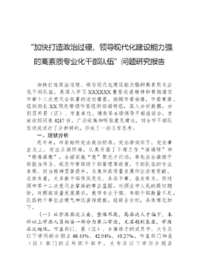 加快打造政治过硬、领导现代化建设能力强的高素质专业化干部队伍问题研究报告加快打造政治过硬、领导现代化建设能力强的高素质专业化干部队伍,是深入学习XXXXXX重要论述精神和贯彻落实市第十二次党代会部署的迫切需要。按照市委安排,市委常委、组织部长XX同志带领市委组织部调研组,深入分析数据,分别召开县(区)、市直单位、镇街等6场领导干部座谈会,发放收回问卷4217份,广泛收集和听取意见建议,对全市干部队伍状况进行了分析研判,形成了一些工作思考。一、现状分析近年来,市委始终突出政治标准,突出崇尚实干,突出事业为上,突出五湖四海,认真开展了干部工作深调研和精准画像,全面实施惠聚优才行动,率先出台激励干部担当作为、规范市管职级干部管理等政策,干部队伍的专业素质、担当精神显著提升,为惠州高质量发展作出应有贡献。总体来看,大多数干部作风优良、务实干事、奋发有为。但对照市第十二次党代会擘画的事业蓝图,对照全市人民的殷切期盼,对照高质量发展要求,我市专业干部、年轻干部数量不足,队伍的干事创业精气神还亟待提振。经综合分析,具体情况如下。(一)从学历层次上看,整体不高,高层次人才偏少,本科以上学历人员相当一部分为第二学历,尤其越到基层,学历层次越低。市直部门、县(区)、乡镇班子的成员中,大专及以下学历的分别占48.45%、42.94%、43.27%。市直部门和县(区)部门的正科职干部中,大专及以下学历分别占52.93%、60.7%。从另外一个视角看,全市副处级干部,全日制研究生以上比例高于正科级干部;大专及以下学历比例又明显低于正科级干部,干部队伍学历层次整体上有较大提升空间,高学历、高素质干部培养储备需尽早谋划、从源头抓起。(二)从熟悉专业领域上看,具有与我市2+1支柱产业密切相关的石油化工、网络和电子信息、科技、招商引资等专业学科背景的市管干部、科级干部不多。如熟悉能源和石油化工专业领域的市管干部仅X人。市直机关、事业单位(不含教育、卫生系统)X名正科级领导干部,仅X名干部熟悉招商引资等相关专业,仅X人熟悉科技领域专业。这充分表明我市干部熟悉专业领域的构成不够科学,熟悉2+1现代产业相关领域的干部尤其紧缺,专业构成亟待优化。(三)从专业匹配度上看,学非所用用非所学学用脱节现象突出,专业匹配度普遍不高。仅从市直部门看,一方面喊缺专业干部,一方面大量专业干部不注重培养使用。(四)从工作经历上看,领导干部大多经历多岗锻炼、经历丰富,但正科职干部普遍工作经历单一。以市某局21名正科职干部为例,具有市级机关和县镇工作经历的仅占14.3%;以市某局22名正科职干部为例,在单一部门工作经历的高达68.2%。分析发现,正科职干部工作经历相对单一,多岗位培养锻炼干部,提升干部队伍综合素质还亟待加强。(五)从年轻干部数量上看,近5年我市年轻干部选配使用取得明显成效,但年轻干部总量不足的问题依然突出。目前,全市市管干部40岁以下的仅占总数的3.5%。全市正科级干部35岁以下的仅占正科级干部总数的1.8%,储备总量偏少。综合座谈会上的意见,大多数人认为素质过硬、有培养潜质的成熟苗子不多。以某县为例,全县三分之二以上的科级干部已超45岁。文可居文库——海量学习资料,手机电脑均可下载www.wenkeju.com二、问题与成因受主客观因素影响,建设高素质专业化干部队伍仍然面临一些困难和考验。(一)年轻干部入口关未把好。目前,我市通过定期招录和选调干部、连续两年实施惠聚优才行动、招聘国企经理人等方式,新招录了一大批干部人才,但对标我市重点产业、重点项目发展的需求,年轻干部特别是部分急需紧缺专业的干部招录不足,以至于造成断层问题。从选调招录公务员和事业单位人员看,有些单位选人用人缺乏计划性,未能进行更加科学精准的岗位需求和人岗匹配分析,自行增员的方式随意性较大、人选质量不高、与事业发展结合不够紧密。从干部人才引进来看,一些县(市)、部门反映,因条件与人才期望存在差距,高素质专业化干部根本不愿意来,来了也要走。如,20XX年至20XX年6月,某县引进高层次人才159人,目前流失已达22%;20XX年,某县委办和县府办引进4名双一流高层次人才,目前已离职过半。(二)专业学习进修动力不足。座谈中有反映,一些干部思想上存在学得多、干得多、累得多的错误思想,弱化了学习、淡化了进步,老办法不管用、新办法不会用,压缩了自我提升、自我完善的空间。如,近年来,领导干部尤其是年轻干部参加不同专业背景在职教育的意愿不强,一些干部工作上习惯于吃老本,不调查、不研究,按传统办事、想当然办事,用过去的老经验解决现在的新问题,要么事倍功半、要么忙中添乱。一些领导干部对部门专业不熟悉,一知半解,习惯于拍脑决策,对专业化问题和工作往往只