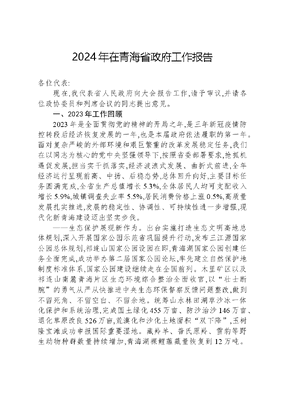 2024年在青海省政府工作报告各位代表:现在,我代表省人民政府向大会报告工作,请予审议,并请各位政协委员和列席会议的同志提出意见。一、2023年工作回顾2023年是全面贯彻党的精神的开局之年,是三年新冠疫情防控转段后经济恢复发展的一年,也是本届政府依法履职的第一年。面对复杂严峻的外部环境和艰巨繁重的改革发展稳定任务,我们在以同志为核心的党中央坚强领导下,按照省委部署要求,抢抓机遇促发展,担当实干抓落实,经济波浪式发展、曲折式前进,全年经济运行呈现前高、中扬、后稳态势,总体回升向好,主要目标任务圆满完成,全省生产总值增长5.3%,全体居民人均可支配收入增长5.9%,城镇调查失业率5.5%,居民消费价格上涨0.5%,高质量发展扎实推进,发展的稳定性、协调性、可持续性进一步增强,现代化新青海建设迈出坚实步伐。——生态保护展现新作为。出台实施打造生态文明高地总体规划,深入开展国家公园示范省巩固提升行动,发布三江源国家公园总体规划,祁连山国家公园设园在即,青海湖国家公园创建任务全面完成,成功举办第二届国家公园论坛,率先建立自然保护地制度标准体系,国家公园建设继续走在全国前列。木里矿区以及祁连山南麓青海片区生态环境综合整治全面收官,以壮士断腕的勇气从严从快推进中央生态环保督察反馈问题整改,做到不留死角、不留空白、不留余地。统筹山水林田湖草沙冰一体化保护和系统治理,完成国土绿化455万亩、防沙治沙146万亩、退化草原改良526万亩,荒漠化和沙化土地面积双下降,玉树隆宝滩成功申报国际重要湿地。藏羚羊、普氏原羚、雪豹等野生动物种群数量持续增加,青海湖裸鲤蕴藏量恢复到12万吨。空气质量优良天数比例96.6%,长江、黄河干流、澜沧江出省境断面水质保持在Ⅱ类及以上,地表水国考断面水质优良比例持续保持100%,土壤环境清洁稳定,党中央国务院考核我省污染防治攻坚战成效结果为优秀。稳步实施碳达峰十大行动,构建金融支持碳账户体系,一批技术先进、绿色低碳企业入驻零碳产业园区,智慧双碳大数据中心挂牌成立,建成首个绿电溯源感知平台,新能源公交车占比过半。果洛州、西宁市城西区、乌兰县入选全国生态文明建设示范区,玉树市、同德县成为全国绿水青山就是金山银山实践创新基地,中华水塔更加坚固丰沛,绿水青山成色更足,高原大地处处呈现人与自然和谐共生美好图景。——经济运行呈现新气象。以助企暖企春风行动开局,开展抢抓机遇促发展1+9系列活动,打出系列政策组合拳,37名省领导联点领衔、1300多家机关单位广泛参与、1万余名助企联络员一对一帮扶,协调解决各类企业反馈问题5000余项,社会预期持续改善,市场信心不断增强。农牧业量质齐升、再获丰收,一产增加值增长4.7%。工业新动能加快成长,规模以上工业增加值增长5.6%,装备制造业、高技术制造业增加值分别增长45.3%和62.2%、占规模以上工业增加值比重均超26%,建成全球单体最大高性能碳纤维生产基地。服务业全面恢复向好,金融机构存贷款余额分别增长3.6%、7.2%,客运量、货运量分别增长1.4倍、16.7%,电信、快递业务量、规模以上服务业营业收入均增长20%以上。财税金融支撑有力,地方一般公共预算收入增长15.9%,一般公共预算支出增长10.8%,绿色金融发展呈现一高一优一先一新态势,绿色信贷覆盖率全国领先。市场需求恢复扩大,实施投资攻坚行动,制造业、电力投资分别增长26.4%和7.4%。西宁机场三期航站楼主体完工,兰新客专恢复达速运行,复兴号动车驶上青藏铁路,新改建普通省道和农村公路3600公里,提前两年实现高速和一级公路里程突破5000公里规划目标。引大济湟工程全线通水,蓄集峡、西纳川等一批水库建成蓄水。开展消费恢复提振行动,社会消费品零售总额增长17.3%,网络购物交易额532.2亿元、增长11.8%,限额以上批零住餐零售额增长20%以上。数字经济加快发展,以全国最快速度建成国家级互联网骨干直联点并开通运行,京东青海数字经济产业园开园运营,在全国率先发布绿色算力地方标准,数字经济产业规模超过1100亿元、核心产业增加值增长20%。全省经济在风浪中强健了体魄、壮实了筋骨,发展韧性和后劲显著增强。——产业四地释放新动能。世界级盐湖产业基地加快建设,逐步形成钾、钠、镁、锂、氯五大产业集群,全年生产钾肥706万吨、占全国总产量的77%以上,碳酸锂11万吨、增长49.4%,卤水提锂技术国际领先,成功攻克氯化镁脱水这一世界性难题。国家清洁能源产业高地建设势头强劲,新增清洁能源装机980万千瓦、总装机规模突破5100万千瓦,三批大型风电光伏基地加速建设,李家峡电站扩机工程投运,玛尔挡水电站下闸蓄水,哇让、同德、南山口抽水蓄能电站开工,世界最大液态空气储能示范项目落地,首个绿电制氢项目投产,昆仑