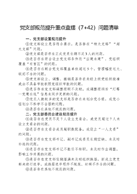 党支部规范提升重点查摆(7+42)问题清单一、党支部设置规范提升①党支部设立是否符合要求,是否存在特大支部超大支部问题。②党支部是否存在正式党员长期不足3人的问题。③是否存在符合设立党支部条件而应建未建,党组织覆盖有盲区的问题。④是否存在联合党支部覆盖单位超过5个,管理幅度过大、联而不合的问题。⑤党支部设立、调整、撤销是否存在未经上级党组织批准或由不具备审批权限党组织审批的问题。⑥是否存在党支部调整理顺不及时,或调整理顺后灯塔—党建在线信息未同步更新的问题。⑦党员人数较多的党支部是否存在未划分党小组,或党小组划分不科学不合理的问题。⑧是否存在其他不规范的问题。二、党支部委员会建设规范提升①是否存在党员不足7人设立支委会,或党员超过7人未设立支委会的问题。②是否存在支委会成员超职数配备,或设立一人支委的问题。③是否存在党支部书记、副书记或委员长期空缺、未及时补选的问题。④是否存在党支部书记不胜任不称职,未及时作出调整,影响工作开展的问题。⑤是否存在党支部任期届满未及时组织换届,新成立党支部未进行选举,或换届选举程序不规范、材料不齐全的问题。⑥是否存在其他不规范的问题。三、发展党员规范提升①在确定入党积极分子、发展对象等环节是否存在论资排辈、以票取人,党支部研究把关不够,降低标准和质量问题。②是否存在申请入党不满半年确定为入党积极分子或入党积极分子培育不足一年确定为发展对象、发展对象自行办理函调或外调等政审手续、未及时组织入党宣誓、预备党员逾期未转正等履行程序不规范不到位问题。③是否存在发展党员网上全程纪实、执纪执法部门联审、组织员谈话、基层党组织负责人近亲属入党审查等制度执行不到位的问题。④是否存在发展党员弄虚作假,带病入党、借壳入党、近亲属违规发展入党等违规违纪问题。⑤党支部对发展党员、培养入党积极分子等工作是否定期研究,有计划地推进,是否按要求培养储备入党积极分子、发展党员问题。⑥党员发展档案是否及时整理归档、资料规范完整,是否存在对新发展党员未建立电子档案问题。⑦是否存在其他不规范的问题。四、党员教育管理规范提升①是否存在党支部书记轮训、党员集中培训未达到规定要求的问题。②是否存在党员组织关系排查理顺不到位,仍有失联空挂口袋隐形党员的问题。③是否存在对党员组织关系无故拒接拒转、人为设置障碍导致党员进不来出不去的问题。④是否存在对流动党员底数不清、去向不明,教育管理服务不到位,造成党员游离于党支部之外的问题。⑤是否存在党员信仰宗教、参与邪教,党支部未发现或发现后不教育不管理、对情节严重的不纠正不处理的问题。⑥是否存在党员交纳党费不及时不足额的问题。⑦是否存在未推行党员量化积分管理、设岗定责等制度,党员作用发挥不到位的问题。⑧是否存在其他不规范的问题。五、党支部工作运行规范提升①是否建立支部党员大会、支部委员会、党小组会及其会议工作制度,是否存在不按时召开或流于形式的问题。②是否严格落实主题党日制度,并依托主题党日开展三会一课、组织生活会、谈心谈话、民主评议党员等组织生活。③是否存在党支部开展活动过度留痕,材料照抄照搬甚至造假的问题。④是否存在重大事项不提交党支部党员大会或党支部委员会议事讨论、决定,而由党支部书记等少数人说了算的问题。⑤是否存在党小组形同虚设,平时不组织党员学习,不积极主动完成党支部安排的任务的问题。⑥是否存在其他不规范的问题。六、党支部工作保障规范提升①是否存在党务工作者未按标准配备、配备力量不足、业务素质能力不强的问题。②是否存在党支部活动场所建设管理不到位,未达到六有要求,不能有效满足党员活动需求的问题。③是否存在财政列支的机关党组织活动经费落实不到位的问题。④是否存在其他不规范的问题。七、行动支部规范提升①是否按照要求建立行动支部工作运行机制,是否存在功能虚化、责任弱化,不发挥作用的问题。②是否按时开展组织生活,落实党内有关制度规定,加强党员教育管理。③是否结合项目建设制定行动计划、任务清单,将任务落实到党小组和党员,真正发挥行动支部战斗堡垒作用和党员先锋模范作用。