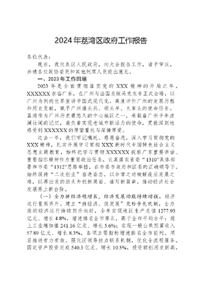 2024年荔湾区政府工作报告各位代表:现在,我代表区人民政府,向大会报告工作,请予审议,并请各位政协委员和其他列席人员提出意见。一、2023年工作回顾2023年是全面贯彻落实党的XXX精神的开局之年,XXXXXX亲临广东,在广州与法国总统马克龙非正式会晤,以广州为例向世界宣讲中国式现代化,高度评价广州的发展历程和历史贡献,赋予广州排头兵、领头羊、火车头的使命任务。荔湾作为广州历史最悠久的中心城区之一,承载着广州千年波澜壮阔的记忆,肩负着实现老城市新活力的使命,更能深刻地感受到XXXXXX的厚望重托与深情厚爱。过去一年,我们牢记嘱托、感恩奋进,深入学习贯彻党的XXX精神,扎实开展学习贯彻XXX新时代中国特色社会主义思想主题教育,始终把学习贯彻XXXXXX视察广东重要讲话、重要指示精神作为重要政治任务,认真落实省委1310具体部署和市委1312思路举措,在市委市政府和区委的正确领导下,始终保持二次创业奋进姿态,以非常之功破解疫后发展之难,以再出发的劲头开创新局面、谱写新篇章,推动经济社会发展再上新台阶。(一)全力拼经济稳增长,经济发展动能持续增强。经济运行量质齐升。建立拼经济、促发展竞标争先机制,全力推动经济运行持续回升向好,全年实现地区生产总值1277.93亿元、增长4.8%,增速排名全市第五,高于全市平均水平;规上工业增加值241.16亿元、增长5.6%;实现一般公共预算收入57.89亿元、增长8.3%,各项主要指标增速排名全市前列。项目推进有力有效。强化区领导挂点联系机制,优化全流程服务,固定资产投资完成540.3亿元、增长10.5%,投资额创历史新高,增速排名全市第四;区牵头的56个市攻城拔寨项目完成投资203.1亿元,完成率达130%。成功引进威高集团等产业项目,注册项目242个,协议达产值超800亿元。大力推进土地收储出让三年行动计划,完成地块出让10宗,释放建设空间117万平方米。现代化产业体系加快构建。大力发展以现代都市工业为重点、生产性服务业和现代商贸业共同发展的实体经济。出台现代都市工业1+9政策体系,深入实施七个一行动,东沙现代都市工业产业园等一批园区载体加快建设,国企投资的18万平方米标准工业厂房顺利开工,推动荔湾产业园申报省级产业园;老旧物业改造取得新突破,出台系列工作方案、指引和激励政策,推动广州发电厂首开区、广弘交易中心等6个产业园超11万平方米老旧物业提质增效,其中1906科技园建成开业,奥宝汇科创园基本完工;工控集团上榜世界500强,全区世界500强企业数量占全市1/3。现代商贸业提质扩容,大西关岭南特色商圈活力更足,白鹅潭世界级地标商圈提速建设,发放政府消费券1000万元,撬动消费近2亿元,带动社会消费品零售总额增长9.9%,增速排名全市第二。生产性服务业提质增效,全区规上生产性服务业企业1114家,营收3065亿元、增长6.4%,软件和信息技术服务业营收增长15.4%,增速排名全市第二。(二)纵深推进粤港澳大湾区建设,开放创新迸发活力。开放合作水平大幅提升。落细落实《南沙方案》区级行动方案,荔湾粤港澳大湾区医药健康综合试验区建设深入推进,举办首届中药产业高质量发展论坛,敬修堂获首届粤港澳大湾区(广东)高价值商标品牌培育大赛金奖,医疗服务跨境融合加速。持续完善广佛合作与联动机制,建设荔湾—南海人才高质量发展合作区,深化政务服务跨城通办。粤港澳青年创新创业服务体系不断完善,培育建设5个创新创业孵化示范基地,中科创英汇获评工信部中小企业志愿者服务工作站和省级示范基地。新缔结6对穗港澳姊妹学校。科创活力进一步激发。创新文可居文库——海量学习资料,手机电脑下载www.wenkeju.com培育能力有效提升,年度R&D投入增长9%,全区高新企业305家、增长7.4%,创历年新高;科技型中小企业认定入库667家、增长40.4%,入库完成率排名全市第三;色界美妆、未来一手、汉潮中药分别上榜独角兽未来独角兽种子独角兽榜单;省建筑设计研究院获省科技进步奖二等奖。创新主体地位愈发突出,省级专精特新企业数量增长48.1%,创新型企业数量增长43.5%;互联网和软信规上企业数量增长32%,裕申电子项目先后获评国家工信部和省工信厅试点示范;广药白云山获评中国医药研发产品线最佳工业企业。创新载体体量不断增大,新增立白综合科技园、羊创东楠汇等科创载体超30万平方米。创新人才不断涌现,评选享受区政府特殊津贴人员72人、高层次人才125人、高技能人才17人。国家知识产权强县建设试点工作加快推进,新增专利授权2756件、增长49.8%,增速排名全市第一。助力16家企业获得知识产权质押融资11.07亿元,知识产权工作入选2023年度广东商标品牌建设优秀案例。营商环境持续