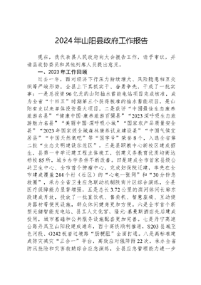 2024年山阳县政府工作报告现在,我代表县人民政府向大会报告工作,请予审议,并请县政协委员和其他列席人员提出意见。一、2023年工作回顾过去一年,面对经济下行压力持续增大、风险隐患相互交织等严峻形势,全县上下真抓实干、奋勇争先,干成了一批实事:一是总投资96亿元的山阳抽水蓄能电站项目完成核准,成为全省十四五时期第三个获得核准的抽水蓄能项目,是山阳有史以来单体投资最大项目。二是获评中国最佳生态康养旅游名县健康中国·康养旅游百强县2023深呼吸生态旅游魅力名县美丽中国·深呼吸小城国家农产品质量安全县2023年国家级全域森林康养试点建设县中国气候宜居县中国天然氧吧等国字号荣誉8个,入选全省第二批生态文明建设示范区。三是县职教中心新校区建成招生,县第一中学迁建工程主体竣工,创建义务教育优质均衡达标校85所,城乡办学条件不断改善。四是建成全市首家县级公共卫生中心、全市首个肿瘤中心,完成妇保院迁建,率先在全市建成覆盖244个村(社区)的心电一张网和30分钟急救圈,承办全省卫生应急联动机制陕南片区综合演练,全县医疗保障能力显著增强。五是总长3.72公里的滨河休闲长廊东段建成开放,投放了一批直饮机、售卖机、智慧座椅、互动健身器材等便民设施,群众休闲健身更加方便。六是全市首个新型光储智能充电站、县工人文化宫、隆元·基曼斯酒店先后建成投用,城市基础和公共服务设施配套更加完善。七是丹宁高速公路丹凤至山阳段建成通车,西十高铁顺利推进,S203县城至色河段、G242板岩过境路肠梗阻全面打通。八是高标准建成防灾减灾三合一平台,高效应对强降雨22次,承办全省防汛抢险和灾害救助综合应急演练,全县应急管理能力进一步提升。九是承办全国夏季村晚展演,并通过陕西公共文化云平台线上直播,吸引观众16万人,得到了一致好评。十是城镇和农村常住居民人均可支配收入分别增长5.8%、8.8%,高于全省平均水平,群众的获得感不断增强。一年来,我们坚持以XXX新时代中国特色社会主义思想为指导,全面学习贯彻党的XXX和二十届二中全会精神,贯通落实XXXXXX历次来陕考察重要讲话重要指示,以开展三个年活动为抓手,全力以赴稳增长、促改革、调结构、惠民生、防风险、保稳定,高质量发展取得了新成效。一是承压奋进、攻坚克难,经济运行保持平稳。落实减税降费1.8亿元,争取中省一般预算资金26.14亿元,申报获批特别国债项目7个、下达资金1.7亿元。65个重点项目建成投产普阳时代电源制造等两个项目代表商洛接受全省视频观摩,全市重点项目观摩半年第二、年度第三。制定《招商引资优惠奖励办法》,建立常务会定期研究招商工作机制和热力图备忘录制度,招引智能办公设备制造等项目60个、引资223.33亿元,到位资金增长16.21%。实事求是去虚高、挤水分,全年生产总值增长5%,规模以上工业总产值增长18%,固定资产投资增长7.1%,地方一般公共预算收入增长13.77%。二是突出优势、挖潜增效,三次产业扩量提质。制定《粮食生产扶持办法》,筹措3000万元对粮食生产进行奖补,粮食产量增长1.1%,全市2023年中国农民丰收节活动在我县举行。持续壮大菌果药畜茶等特色产业基地,认定市级龙头企业2个、市级现代农业产业园区4个,获评省级家庭农场示范县。机器人和复合材料等24个工业项目建成投产,新纳规上工业企业6家。发展建筑施工总承包和专业承包企业9家,获评全省建筑业强县。新培育外贸进出口获权企业2家、供港澳蔬菜种植基地1个,新纳限上单位22家,获评全省促进外贸稳定和创新发展成效明显地区省级商业建设行动县。成功举办全市精品(特色)民宿授牌、西安康养地产暨生态旅文可居文库——海量学习资料,手机电脑下载www.wenkeju.com游推介等系列活动,打造特色民宿25家,创建中国森林康养人家2家,游客人数、旅游综合收入分别增长125.2%、106.5%。三是严守底线、抓点示范,巩固衔接稳步推进。动态排查整改一收入两不愁三保障和饮水安全问题,新纳监测对象107户412人,累计消除风险1102户3967人,顺利通过省第三方评估和衔接资金绩效评价。深入推进两改两转三促进行动①,完成村庄规划编制38个,改造农村户厕12458座、土坯(石板)房1869户,新修产业路56公里,实施农网改造47公里,新建5G基站129个,5条乡村振兴整流域示范带、2个示范镇、10个示范村见效成势,新增村集体经济收入50万元以上村6个,全市两改和农村改厕2个现场会在我县召开,四抓四带联农带农机制②有效做法代表陕西在全国交流推广。四是建管并重、协同推进,城乡品质提档升级。大力实施城市更新一揽子工程,完成道路改造提升10.9公里,铺设人行道10