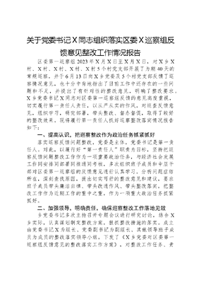 关于党委书记X同志组织落实区委X巡察组反馈意见整改工作情况报告区委第一巡察组2023年X月X日至X月X日,对X乡X村、X村、X村、X村、X村5个村党支部开展了为期40天的常规巡察,并于6月13日向X乡党委及5个村党支部反馈了巡察情况意见,也十分中肯地指出了目前工作中还存在的一些问题和不足,并提出了有针对性的整改意见,明确了整改要求。X乡党委书记X同志对区委第一巡察组反馈的意见高度重视,切实履行第一责任人责任,以从严从实的作风,对巡查反馈意见,组织学习,研究部署,带头整改、督办督促,取得了较好的整改效果。现将履行第一责任人抓好巡察整改落实情况报告如下:一、提高认识,把巡察整改作为政治任务抓紧抓好落实巡察反馈问题整改,党委是主体,党委书记是第一责任人。对此,以履行好第一责任人职责为目标,坚持把巡察反馈问题整改工作作为一项重要政治任务,与经济社会发展工作同安排同部署同推进同考核,多次组织班子成员和中层干部对区委第一巡察组的反馈意见进行认真学习,分析问题症结所在,深刻查找原因,提出切实可行的整改意见和建议,要求班子成员带头廉洁自律、带头改进作风、带头整改落实,把整改工作作为近期工作的重中之重,作为一项重大政治任务抓紧抓好。二、加强领导,明确责任,确保巡察整改工作落地见效乡党委书记多次主持召开专题会议进行研究讨论,结合X乡实际,认真谋划制定整改方案,狠抓整改措施的落实。成立由党委书记X为组长、党委副书记为副组长、其他领导班子成员为成员的整改落实领导小组,下发了《X乡党委对区委第一巡察组反馈意见的整改落实工作方案》,对整改工作任务、责任、时限进行了明确要求,同时建立整改台账,细化分解整改事项,落实整改责任,严格问责制度。在整改过程中,坚持将整改工作与推动全乡各项工作有机结合,将整改工作贯穿全乡经济社会发展的全过程。期间,先后3次召开班子会议听取整改工作汇报,对巡察反馈意见指出的问题,坚持一查到底,实行销号制度,逐条逐项抓落实,保证了整改事项事事有着落、件件有回音,促进整改迅速扎实有效展开。三、直面反馈问题,从严从实抓整改始终坚持问题导向,立行立改。把巡察情况反馈意见指出的30问题、书记点人点人点事和书记交办重要问题,作为整改工作的重点,以重点突破带动全面从严治党。在整改的同时,组织深入开展自查自纠,对重要事项、关键环节和难点问题,要求班子成员分工负责,开展专项调查,不查清楚不放手。坚持零容忍,查办巡察组指出的问题和移交的线索,具体到人具体到事,一经查实,谁的问题就处理谁,毫不含糊,绝不手软,决不大事化小、小事化了。坚持一案双查,从严追究直接责任和领导责任,坚持实事求是、依法依规依纪,力求事实清楚、定性有据,确保每个问题的查处都经得起检验。现将区委巡察组反馈的具体问题意见,完成整改情况汇报如下:巡察反馈X乡党委30个问题,已整改完成29项,剩余1项问题正在整改,整改到位率96.7%;巡察移交问题线索3件,已办结3件,办结率100%;其中党纪政务处分1人、组织处理3人。巡察交办信访事项12件,已办结12件,办结率100%。书记点人点人点事1件,已整改1件,整改率100%;书记交办重要问题2件,已整改2件,整改率100%。巡察组反馈5个村党支部115个问题,已整改到位111个问题,整改到位率96.5%。开展专项治理7次;共挽回经济损失43936元;建章立制29项265条。其中:巡察组反馈X村党支部25个问题,已整改到位24个问题,完成整改率96%。开展专项问题治理1次,建章立制5项48条;巡察组反馈X村党支文可居文库——海量学习资料,手机电脑均可下载www.wenkeju.com部23个问题,已整改到位22个问题,完成整改率95.7%,开展专项治理1次,共挽回经济损失12269元,建章立制6项23条;巡察组反馈X村村党支部22个问题,已整改到位21个问题,完成整改率95.5%,开展专项治理1次,共挽回经济损失8867元;建章立制6项46条;巡察组反馈X村党支部24条问题,已整改到位23条问题,完成整改率95.8%,开展专项治理2次,建章立制8项113条,共挽回经济损失2400元;巡察组反馈X村党支部21条问题,已整改到位21条问题,完成整改率100%,开展专项治理2次,建章立制2项12条。挽回经济损失20400元。四、及时总结,建章立制,确保整改成果长效久远X乡党委高度重视巡察工作,认真开展巡察整改,取得较好成效。我们的主要做法是:(一)领导高度重视。乡党委书记切实履行第一责任人责任,亲自主持召开党委扩大会3次,针对反馈的3个方面17类30项问题,开展集中研判分析,逐条把关讨论,研究制定切实可行的整改措施,明确责任领导、牵头单位、责任单位、责任人和完成时限,建立整改台账,制定整改方案,推进整改工作扎实开展,取得实效。(二)健