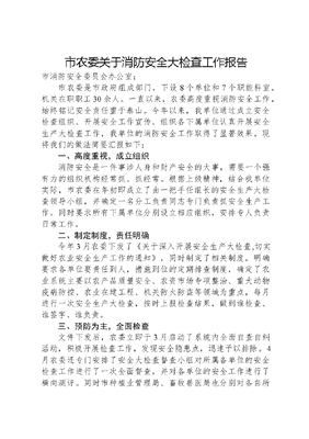市农委关于消防安全大检查工作报告市消防安全委员会办公室:市农委是市政府组成部门,下设8个单位和7个职能科室,机关在职职工30余人。一直以来,农委高度重视消防安全工作,始终铭记安全责任重于泰山。今年以来,我单位通过成立安全检查组织、开展安全工作宣传、组织各下属单位认真开展安全生产大检查工作,我单位的消防安全工作取得了显著效果。现将我们的做法简要汇报如下:一、高度重视,成立组织消防安全是一件事涉人身和财产安全的大事,需要一个强有力的组织机构经常抓、抓经常。根据上级精神,结合我单位实际,市农委在年初即成立了由一把手任组长的安全生产大检查领导小组,并确定一名分工负责同志专门负责抓安全生产工作。同时要求所有下属单位分别设立相应组织,安排专人负责日常工作。二、制定制度,责任明确今年3月农委下发了《关于深入开展安全生产大检查,切实做好农业安全生产工作的通知》,同时制定了相关制度,明确要求各单位要责任到人,措施到位的定期排查制度,确定了农业系统主要以农产品质量安全、农资市场专项整治、重大动物疫病防控、农业在建工程、机关防火防盗等领域为重点,每月进行一次安全生产大检查,按时上报检查结果,做到谁检查、谁签字、谁负责。三、预防为主,全面检查文件下发后,农委立即于3月启动了系统内全面自查自纠活动,积极开展检查工作,发现安全隐患点,迅速予以排除。4月农委还专门安排了安全大检查督查小组对所属各单位的安全检查工作进行了一次全面督查,并对各单位的安全工作进行了横向测评。同时市种植业管理局、畜牧兽医局也分别对各自所属的乡镇基层站所的安全工作进行了检查。四、存在的问题经过一段时间的宣传和检查,农委系统的安全隐患得到了排除,安全系数有一定的提升,但也还存在着一些问题。一是农委办公楼建于十余年前,当时资金困难,对消防安全的要求也不高,造成现在办公楼内消防安全设施缺乏,也没有设立消防安全通道等问题。二是职工的消防安全意识还有待加强,对消防设施的使用知识还较为匮乏。五、下一步打算一是继续开展定期检查,以预防为主将各种隐患消泯于萌芽状态。二是争取资金,增加消防安全设施。三是开展一次全体职工消防安全意识培训,学习消防安全知识,掌握消防设备的使用方法。文可居文库——海量学习资料,手机电脑均可下载www.wenkeju.com