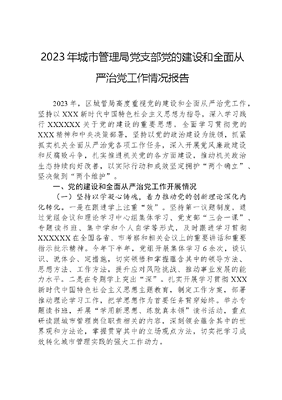 2023年城市管理局党支部党的建设和全面从严治党工作情况报告2023年,区城管局高度重视党的建设和全面从严治党工作,坚持以XXX新时代中国特色社会主义思想为指导,深入学习践行XXXXXX关于党的建设的重要思想,全面学习贯彻党的XXX精神和中央决策部署,坚持以党的政治建设为统领,抓紧抓实机关全面从严治党各项工作任务,深入开展党风廉政建设和反腐败斗争,扎实推进机关党的各方面建设,推动机关政治生态持续向好改善,以实际行动和成效坚定拥护两个确立、坚决做到两个维护。一、党的建设和全面从严治党工作开展情况(一)坚持以学凝心铸魂,着力推动党的创新理论深化内化转化。一是在跟进学上注重效。坚持第一议题制度,通过党组会议和理论学习中心组集体学习、党支部三会一课、专题读书班、集中学和个人自学等形式,及时跟进学习贯彻XXXXXX在全国各省、市考察和相关会议上的重要讲话和重要指示批示精神。今年下半年,党组开展集体学习6余次,谈认识、说体会、定措施,切实领悟和掌握蕴含其中的领导方法、思想方法、工作方法,提升应对风险挑战、推动事业发展的能力水平。二是在专题学上突出深。扎实开展学习贯彻XXX新时代中国特色社会主义思想主题教育,制定工作方案,部署推动理论学习工作,把学思想作为首要任务贯穿始终。举办专题读书班,开展学用新思想、练就真本领读书活动,重点研读跟城市管理岗位职责相关的内容,深刻领会蕴含其中的世界观和方法论,掌握贯穿其中的立场观点方法,切实把学习成效转化城市管理实践的强大工作动力。(二)夯实管党治党责任,不断提高机关党的建设质量。一是加强谋划部署推动。认真贯彻落实二十届中央纪委二次全会精神,召开廉政工作会议,党组书记与班子成员开展集体履职谈话和廉政谈话,进一步推动忠诚履职、干净担当。二是筑牢安全保密防线。深入学习贯彻XXXXXX对国家安全工作的重要指示批示精神,加强国家安全教育培训,开展系列宣传活动,组织排查风险点,严格落实意识形态工作责任制,加强机关意识形态阵地建设管理,跟进转载关于XXXXXX的新闻报道和党中央、国务院重大部署,不断壮大主流舆论。三是全面抓实基层党建。加强对党支部工作指导督促,推动做好党组织关系转接和党费收缴管理使用,认真落实三会一课、主题党日、组织生活会等制度,认真落实双重组织生活制度,以普通党员身份参加所在支部组织生活会。建好工会之家、青年之家、妇女之家,大力开展丰富多彩的党建、工建、妇建活动,开展健步走、乒乓球赛、羽毛球赛、篮球赛等系列活动,增强机关活力和凝聚力。(三)加强干部选育管用,打造忠诚干净担当的高素质专业化干部队伍。一是坚持正确选人用人导向。加强对机关干部队伍建设的统筹谋划,组织开展干部工作专题调研,全面精准了解干部情况。坚持事业为上、以事择人,优先提拔使用政治素质好、实绩突出、确有发展潜力的干部特别是年轻干部。二是严格日常教育管理监督。认真学习贯彻中央八项规定及其实施细则精神,常态化开展廉洁从政教育,举办警示教育月活动,举办廉政专题讲座,组织观看违纪违法案件警示教育片和警示录,督促筑牢拒腐防变思想防线,干干净净做事、清清白白做人,通过召开座谈会、一对一谈话等方式,推动机关年轻干部系好人生第一粒扣子。二、党的建设和全面从严治党工作存在问题文可居文库——海量学习资料,手机电脑均可下载www.wenkeju.com(一)组织建设方面。虽然党的基层组织建设得到了加强,但仍存在部分党组织覆盖不全、党员活动参与度不高等问题。(二)教育宣传方面。虽然开展了党的思想教育和政治教育,但教育内容和方法有时过于传统,缺乏创新,难以引起党员的共鸣。此外,部分党员的政治意识、组织意识、纪律意识和服务意识还有待提高。(三)纪律建设方面。虽然党的纪律建设取得了一定成效,但对党员管理不够严格的问题仍然存在,一些党员未能严格遵守党的纪律和规定按时参加各项党内活动。三、党的建设和全面从严治党工作下一步工作计划(一)以党建引领强廉,夯实政治根基。始终坚持把讲政治作为第一要求,筑牢政治忠诚。把新时代党对城市管理工作的新要求贯穿全过程各方面。把坚持第一议题制度作为夯实城管干部政治思想根基的第一堂课,坚持不懈用XXX新时代中国特色社会主义思想凝心铸魂,深刻领会XXXXXX关于党的自我革命战略思想,关于全面从严治党、党风廉政建设和反腐败斗争系列重要论述,夯实党员干部政治根基,坚定政治方向,自觉在思想上政治上行动上同以XXX同志为核心的党中央保持高度一致。(二)以主题教育固廉,坚守理想信念。把学习贯彻XXX新时代中国特色社会主义思想主题教育作为常态化工作开展,牢牢把握学思想、强党性、重实践、建新功的总要求,持续强化党性教育,锤炼坚强品格,深化党风廉政建设,教育广大党员干部坚守理想信念,修好对党忠诚的大德、修好