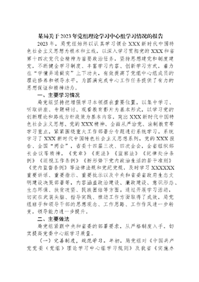 某局关于2023年党组理论学习中心组学习情况的报告2023年,局党组始终以认真学习领会XXX新时代中国特色社会主义思想为根本和主线,以深入学习贯彻党的XXX和省第十四次党代会精神为首要政治任务,坚持思想建党和制度建党,不断健全学习制度、丰富学习内容、创新学习方式,着力在学懂弄通做实上下功夫,有效提高了党组中心组成员的理论修养和领导水平,为圆满完成中心工作任务提供了有力的思想保证和精神动力。一、主要学习情况局党组坚持把增强学习本领摆在重要位置,以集中学习、听取讲座、专题研讨、观看教育影片为基本形式,以学习党的创新理论和路线方针政策为基本内容,突出XXX新时代中国特色社会主义思想、党的XXX精神、全面从严治党、法制教育等学习重点,紧紧围绕重大工作部署分专题进行系统学习。系统学习了XXX新时代中国特色社会主义思想系列,党的XXX报告、全国两会,省委十四届三次、四次全会,全省组织部长会议等精神,《党章》《宪法》《监察法》《纪律处分条例》《巡视工作条例》《新形势下党内政治生活的若干准则》《党内监督条例》等法律法规和党纪党规,及时学习XXXXXX重要讲话、重要指示、重要批示以及中央和省委省政府生态文明建设决策部署等,内容涵盖政治建设、廉政建设、意识形态、生态环保、扶贫攻坚、民族团结等方面。通过开展学习活动,切实在武装头脑、指导实践、推动工作方面取得了成效,局党组班子和领导干部的思想观念、工作思路、工作作风进一步转变,领导能力进一步提升。二、主要做法局党组紧跟中央和省委的部署要求,从严格制度入手,切实提高党委中心组学习质量。(一)完善制度,规范学习。年初,局党组对《中国共产党党委(党组)理论学习中心组学习规则》及我省《实施办法》进行了专题学习,并结合工作实际,修订了《党组理论学习中心组学习制度》,对学习考勤、内容、次数、人员、时间、方式进行细化和规范,使中心组的学习制度体系更加完备。印发了《2023年党组中心组理论中心组专题学习重点内容学习安排》,将全年的学习内容落实到每月,确保理论学习扎实有效开展。(二)以上率下,示范引领。局党组书记积极履行第一责任人职责,发挥示范带动作用,对年度学习计划、课题选定、讨论思考题的设置,亲自审查把关。对中央、省委的重要会议、文件以及需要中心组学习研讨的内容,第一时间做出批示,安排在中心组学习会上传达学习。今年以来,党组书记在各类主题中心组学习中先后做了X次重点发言,并作专题辅导。中心组其他成员也都能够以身作则,严格参加集中学习研讨、认真开展个人自学等学习活动,做到带头学习、带头发言、带头辅导和带头调研。同时,对重点内容以学习扩大会的形式将参学人员范围扩大至机关全体党员干部,发挥了示范引领作用。(三)重点突出,学用结合。局党组中心组紧跟形势任务需要和安排部署,突出XXXXXX关于生态文明建设思想,使中心组学习更好地体现时代性。一是坚持把学习党的XXX精神作为深化理论武装工作的首要政治任务,通过研讨交流、视频观看、邀请专家辅导等方式组织开展学习活动X次。特别是在X月中旬,邀请专家举办了《XXX》专题讲座。二是突出推进改革发展。先后X次安排局领导、机关相关处室负责人就、湿地保护管理、野生动植物保护等重点工作进行专题讲座,自觉贯彻落实党的XXX关于生态文明建设的重大决策部署贯穿于工作的各个方面。三是突出学习成果转化。党组中心组围绕生态保护和修复的难点热点等内容,强化政策研究和工作调研,不断提升工作的针对性、实效性。2023年,党组成员深入基层单位和服务对象调研,围绕从严治党、精准扶贫、生态文明、乡村振兴、业务工作等方面,撰写了X篇高质量的政研成果。文可居文库——海量学习资料,手机电脑均可下载www.wenkeju.com三、存在的问题局党组中心组理论学习取得了一定成效,但在系统化学习实践应用上还有差距。四、下一步打算一是进一步完善学习制度。认真贯彻落实《中国共产党党委(党组)理论学习中心组学习规则》和《XX省贯彻<中国共产党党委(党组)理论学习中心组学习规则>》,进一步完善局中心组学习制度,加强学习制度执行的刚性,健全和落实学习计划,提高学习质量。特别是要重点抓好学习次数和参学率落实,抓好各类学习档案的建立和管理。二是进一步优化学习内容。紧紧围绕中央和省委重大工作部署,突出重点,把认真学习XXX新时代中国特色社会主义思想、贯彻落实党的XXX和省委XX次党代会及历次全会精神作为中心组学习的重中之重抓紧抓好。继续抓好《党章》《宪法》《监察法》《新形势下党内政治生活的若干准则》等学习,丰富学习内容,在学懂弄通做实上下大力气,自觉武装头脑、指导实践、推动工作。三是进一步创新学习方式。结合党史学习主题教育常态化制度化要求,聚焦改革与发展,进一步加强学习的深度和广度,积极探索新形势下中心组学习的新途径、新方