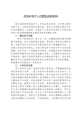 2024年个人党性分析材料通过近段时间系统学习,反思自身在思想、工作等方面存在的不足,认真剖析原因自我反省,深刻认识到党性修养对于党员的重要性。在新的一年我对个人党性状况进行了全面分析,争取以更好地精神面貌发挥党员的先锋模范作用。一、理论学习方面一是学习的深度和广度不足。对一些重要的理论概念的理解不够透彻,往往只是停留在表面,没有深入探究其内涵和本质。导致在实际工作中对这些理论的运用不够准确和灵活。二是缺乏系统性和连贯性。在进行理论学习时存在学习内容比较零散,没有形成一个完整的知识体系,导致解决实际问题时难以将所学的理论知识进行有效整合运用。三是理论与实际结合不够紧密。虽然已经意识到理论对实践的指导意义,但在实际操作中往往不能很好地将理论转化为具体的工作方法和措施,导致理论与实践存在一定的脱节。二、工作作风方面在工作作风方面,我始终保持认真负责、严谨细致的态度但仍存在提升空间。一是工作效率方面容易过于关注细节,处理任务时没有合理分配时间和精力,缺乏有效工作方法和技巧,从而导致整体进度受到影响。通过重视工作的计划性和条理性,合理安排工作时间,同时也要学习并运用一些时间管理和任务分配的方法,提高自己的工作效率,避免过度纠结于细节。二是对自己要求不够高,缺乏克服困难的信心和勇气,导致在面对工作中的困难和挑战时容易缺乏足够的耐心和毅力。通过近段时间学习与自我总结,在今后工作中我将不断提高个人心理素质和抗压能力,培养自己坚韧品格,在面对困难时会积极寻求解决问题的方法和途径,不轻易放弃。三是团队协作和沟通方面不够积极。在以后工作中我会积极与同事合作来提高个人协调能力,共同解决问题,分享工作经验和理论知识,同时也会加强与上级和下属沟通,及时反馈工作进展和问题,不断提高工作效率和质量。三、服务群众方面在服务群众方面,我始终将为人民群众服务作为宗旨,但在实际工作中仍存在一些不足。一是在沟通方面缺乏耐心和专注,与群众沟通交流时未能很好地倾听他们的需求和意见,或没有正确理解他们的诉求,没有给予群众充分的表达机会。二是在关心群众的生活和工作方面不够主动,对群众的需求了解不够深入,或者对服务的重要性认识不足,未能及时了解群众困难和需求,服务意识还需要进一步提高。三是在解决群众问题时对实际效果重视程度不够深,未做到切实为群众排忧解难。在为群众服务方面不仅要关注问题的解决过程,更要关注解决方案的实际可行性和可持续性。不但要深入地了解群众的实际情况,充分考虑各种因素,制定更加切实可行的解决方案。同时也要做到及时跟踪和反馈解决方案的实施效果,根据实际情况进行调整和优化。在以后工作中我会积极参与各种服务群众的活动和项目,通过实践不断提高自己的服务能力和水平。同时也要主动与其他同事交流合作,共同探讨更好的服务群众的方法和经验。四、下一步整改措施针对以上存在的问题,我将采取以下整改措施:一是加强理论学习:制定详细的学习计划,包括阅读相关书籍、参加培训课程和参与学习小组等。深入学习党的重要理论,不仅仅是停留于表面,更要理解其深层次的内涵和实践意义。通过不断学习,提高自己的理论水平和政治素养,为实际工作提供坚实的理论支持。二是改进工作作风:学习时间管理和任务分配技巧,合理规划工作时间,避免拖延和浪费时间。积极与同事沟通协作,文可居文库——海量学习资料,手机电脑均可下载www.wenkeju.com分享经验和知识,共同解决工作中的问题。通过有效的沟通和协作,提高工作效率和质量,提升团队整体水平。三是增强服务群众意识:主动参与社区活动或志愿者服务与群众建立更紧密的联系。通过与群众的直接接触来实际需求和困难,积极为群众提供帮助和支持。同时,定期组织与群众的座谈会或调研活动,主动倾听群众意见和建议,并将其纳入工作改进的范畴。四是加强自我约束和自我监督:严格遵守党的纪律和规矩自觉抵制各种诱惑和不良行为。定期进行自我反思和总结,发现自己可能存在的问题并及时纠正。同时积极参与党内监督和群众监督,接受他人的批评和建议,不断完善自己。通过这次党性分析,我深刻认识到自己的不足和问题所在在今后的工作和学习中,我将不断努力,加强党性修养,提高自身素质,为党和群众的事业做出更大的贡献。文可居文库——海量学习资料,手机电脑均可下载www.wenkeju.com