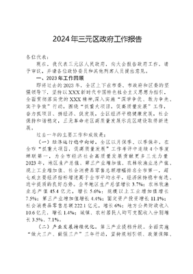 2024年三元区政府工作报告各位代表:现在,我代表三元区人民政府,向大会报告政府工作,请予审议,并请各位政协委员和其他列席人员提出意见。一、2023年工作回顾即将过去的2023年,全区上下在市委、市政府和区委的坚强领导下,坚持以XXX新时代中国特色社会主义思想为指引,全面贯彻落实党的XXX精神,深入实施深学争优、敢为争先、实干争效行动,围绕抓重大项目,促高质量发展工作,奋力抓项目、拼经济、促发展,全区经济平稳健康发展,社会保持和谐稳定,三元革命老区高质量发展示范区建设取得新进展。过去一年的主要工作和成效是:(一)经济运行稳中向好。全区以月保季、以季保年,在全市抓重大项目,促高质量发展工作考评中连续4个季度蝉联第一,为全市经济社会高质量发展贡献更多三元力量2023年,地区生产总值、第三产业增加值、农林牧渔业总产值、规上工业增加值、社会消费品零售总额增幅排名全市第一,超七成主要经济指标增速高于全市平均水平,经济保持稳中有进、进中提质的良好态势。全年地区生产总值增长3.7%;农林牧渔业总产值45.4亿元,增长5.6%;规模以上工业增加值增长7.5%;第三产业增加值增长4.4%;固定资产投资增长11.1%;社会消费品零售总额222.1亿元,增长6%;地方公共财政收入10.6亿元,增长1.4%;城镇、农村居民人均可支配收入分别增长3.5%、7.1%。(二)产业发展持续优化。第三产业提档升级。全面实施做大三产、做强三产三年行动,坚持规划引领、政策保障、重点扶持和专班推动,11个三产主要支撑指标中,零售业销售额、交通客货运周转量等5个指标增长率居全市前五。第三产业占三次产业比重首次超过50%,较上年同期提高5.8个百分点。实施三产重点项目101个,当年完成投资近18亿元,其中三明爱琴海购物中心、希尔顿欢朋酒店、万达璀璨·元城明悦等53个项目建成运营。闽光云商、福建海丝数字科技等4家企业入选省数字经济领域独角兽瞪羚企业名单。成功举办专业大型营业性演出,集聚六路商圈人气,拉动周末消费近亿元,成为全省第四个承办大型营业性演出的城市。今年培育新增限上商贸业企业85家、规上服务业企业21家,培育数量为全市最多,在库规上、限上企业家数约占全市四分之一。第二产业稳步提质。出台区工业稳定运行系列政策措施,完成工业投资100亿元,30个千万元重点投资项目建成投产,规上工业增加值增速保持全市领先。新入库战略性新兴产业企业13家,汇天生物等4家企业新认定为专精特新企业。今年新增规上工业企业19家,占全市15.6%。出台推动建筑业高质量发展17条措施,获得省住建厅同意参照建筑之乡管理,闽晟、宇煌等7家建筑业企业资质实现升级。农业基础不断夯实。坚决落实耕地进出平衡,流入耕地1629亩任务。完成建设高标准农田7000亩,撂荒地复垦复种3927亩,粮食播种面积达4.6万亩,牢牢守住粮食安全底线。投入资金近2亿元,建成投产一批现代农业重点项目。忠山村、沙阳村、米洋村等6个村获批省级一村一品专业村。(三)项目建设提速增效。精准谋划项目。制定《项目策划生成工作方案》,谋划储备亿元以上重大项目92个、总投资近350亿元,获批预算内投资项目10个补助资金7321万元,争取地方政府专项债项目5个2.7亿元、一般债项目10个0.8亿元,获得第一批特别国债项目4个1.1亿元。大力推进项目。强化项目全生命周期管理,落实重点项目协调工作机制,113个区重点项目完成投资超121亿元,三明盈科产业园等32个项目文可居文库——海量学习资料,手机电脑均可下载www.wenkeju.com开工,总投资103亿元,润祥氟新材料等44个项目投产,完成投资近160亿元,为经济高质量发展打下坚实基础。服务园区发展。成立园区服务领导小组,实行园区分片挂包责任制,定期召开园区共建合作联席会,推进园区基础设施建设项目38个,完成投资3.6亿元。黄砂新材料循环经济产业园安全整治提升顺利通过应急管理部复核评估(达到C级)。(四)改革开放走深走实。国企改革纵深推进。整合农林水、交通、矿产、文旅等资源,新组建农林投资发展集团,国企规模持续壮大。进一步优化国有资产结构,国有总资产达102.6亿元。开展企业效益提升年活动,强化运营考核,完善薪酬激励、工程管理等制度,国企总营收达7.3亿元,实现税利6000多万元。加强银行业机构服务区属国企发展考评,国企投融资能力有效提高。区属国企在经济社会发展中的重要支撑和保障作用不断增强。营商环境不断优化。深入开展我为企业解难题工作,定期召开企业家座谈会,动态收集解决问题340个,赢得企业主广泛好评。出台《三元区进一步深化放管服改革优化营商环境的指导意见》,办不成事专窗反映的12项事项全部解决。全面落实营商环境数字