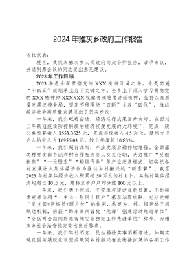 2024年雅灰乡政府工作报告各位代表:现在,我代表雅灰乡人民政府向大会作报告,请予审议,并请列席会议的同志提出意见建议。2023年工作回顾2023年是全面贯彻党的XXX精神开局之年,也是实施十四五规划承上启下关键之年。全乡上下深入学习贯彻党的XXX精神和XXXXXX视察贵州重要讲话精神,坚持以高质量发展统揽全局,坚定不移围绕四新主攻四化,推动经济社会高质量发展迈出了坚实步伐!一年来,我们砥砺奋进,经济运行成果回升向好。在面对三年新冠疫情防控转段后经济恢复发展的大环境下,完成一般公共预算收入1553.3625元,完成非税收入4.5万元。建档立卡户人均收入为16956.03元,较上年增长10.83%。一年来,我们超前谋划,产业发展后劲持续增强。全面落实村党支部书记和村合作社负责人交叉任职,大力推广反租倒包一元股东赊销代养等产业发展模式,切实把各村发展壮大集体经济作为推动乡村振兴的新引擎。截至2023年村集体经济收入积累超50万元的村1个,其他村集体经济均超过10万元,建档立卡户户均分红100元以上。一年来,我们勇于担当,平安雅灰建设成效显著。不断探索完善活用一中心一张网十联户基层治理机制,充分发挥党支部+网格员+联户长的作用,构建乡、村、组网格三级联动机制,荣获黔东南州首批无毒创建活动先进单位全国两会期间黔东南州安全稳定工作先进单位称号,为雅灰乡社会治安稳定交出良好答卷。一年来,我们笃行不怠,民生福祉实事不断增进。如期实现巩固拓展脱贫攻坚成果同乡村振兴有效衔接扩展的各项工作预期,乡村基础设施建设、教育、医疗等民生保障持续加强,群众获得感、幸福感、安全感进一步提升!回顾过去这一年,我们主要抓了以下几个方面工作:(一)持续围绕富的目标,全力抓产业、谋发展,经济运行持续好转。特色农业持续壮大。坚决扛稳粮食安全政治责任,坚守耕地保护红线,完成粮食种植0.732万亩,恢复耕地面积116.32亩。打造以茶叶、蓝莓、中药材、吊瓜等为主体的特色产业,2023年茶叶产量13吨,累计销售金额1049.47万元;吊瓜采收11.3万公斤,累计销售金额310.2万元;采收蓝莓4.389万公斤,累计销售金额46.93万元。林下家禽存栏16440羽,累计出栏82222羽,经济收入稳步增长。项目建设提速增效。扎实开展遍访服务工业企业行动,全力化解企业复工复产难题。坚持把项目建设作为推动高质量发展的强引擎,整合村集体经济项目,实施财政专项资金项目11个,累计投资339.183万元,为扎实稳住经济提供有力支撑、蓄积强劲动能。(二)持续激发拼的动能,着力夯基础、防返贫,乡村振兴稳步推进。持续巩固脱贫攻坚成果。严格按照四不摘工作要求,加强防返贫动态监测和政策扶持,监测对象101户350人,帮助7户申请脱贫救助帮困基金4.4万元,牢牢守住了不发生规模性返贫底线。持续拓宽群众增收渠道。申报产业到户项目1个涉及304户,投入资金43万元。通过以奖代补形式发放15.902万元帮助2023年增收任务重群体增收。抓好脱贫人口稳岗就业,开发公益性岗位(含万达扶贫、护林员等公益性岗位)240个,为322人发放跨省务工交通补助18.25万元。积极争取项目破解发展瓶颈。投资109.2万元开展2023年茶叶基地建设项目,实施农业产业配套设施建设项目,盘活翁帮村黑毛猪养殖场项目,破解了产业发展的瓶颈。(三)持续突出优的保障,倾力惠民生、办实事,社会事业全面进步。民生保障有序有度。深入推进民生保障体系建设,全面落实基本医疗保险、养老保险、社会救助等社会保文可居文库——海量学习资料,手机电脑均可下载www.wenkeju.com障政策。精准救助社会困难群体,累计发放各类低保资金3.076万元、农低保资金163.5683万元。发放特困供养散养户资金40.875万元;对全乡80岁以上老人每月共发放高龄补贴资金17.34万元;发放临时救助金8556元。及时为困难弱势群体开展救助,发放冬春救助资金24.8915万元。公共服务有为有效。2023年城乡居民医疗保险完成参保5386人,参保率为98.2%。累计完成乡村振兴监测对象签约服务569户2028人,按要求对四类慢性病对象208人开展随访服务工作851次,65岁以上老年人一般体检634人,共有321人享受先诊疗后付费政策有效减轻脱贫患者就医负担。基础教育不断夯实。对符合送教上门条件的1名适龄儿童做好送教上门服务工作。持续开展控辍保学,建立辍学学生一生一档材料和疑似辍学学生台账,控辍保学保持动态清零。(四)持续打造靓的名片,致力强建管、提品位,乡村面貌焕然一新。项目建设聚力推进。完成雅灰村新街路面改造、菩萨坳至水碾湾水库道路修复,新建杀高村活动室,实施