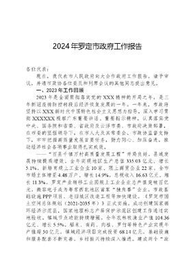 2024年罗定市政府工作报告各位代表:现在,我代表市人民政府向大会作政府工作报告,请予审议,并请市政协各位委员和列席会议的其他同志提出意见。一、2023年工作回顾2023年是全面贯彻落实党的XXX精神的开局之年,是三年新冠疫情防控转段后经济恢复发展的一年。一年来,市政府坚持以XXX新时代中国特色社会主义思想为指导,深入学习贯彻XXXXXX视察广东重要讲话、重要指示精神,认真落实党中央、国务院和省委、省政府及云浮市委、市政府决策部署,在市委的坚强领导下,在市人大及其常委会、市政协监督支持下,牢牢把握高质量发展首要任务,勠力同心、加压奋进,推动经济社会各项事业取得扎实成效。——百县千镇万村高质量发展工程开局良好。县域发展持续提质增效。全年实现地区生产总值335.03亿元、增长5.1%。新培育规上工业企业10家、限上商贸企业22家。全市市场主体增至4.48万户、增长14.9%。总税收入16.63亿元、增长11.3%。罗定产业转移工业园规上工业企业总产值突破百亿元。微容电子成为粤东西北地区首家独角兽企业。市政基础设施PPP项目、老旧城区改造工程等加快建设。《罗定市国土空间总体规划(2021-2035年)》正式实施。成功创建国家循环经济示范县,国家地理标志产品保护示范区创建工作通过实地验收。镇域节点功能持续增强。全年农林牧渔业产值104.36亿元、增长5.5%。稻米、南药、肉桂、罗竹等特色产业实现年产值超50亿元。镇域经济项目完成投资68.14亿元,基础设施和服务配套不断完善。乡村振兴持续深入推进。建成两个政银企村共建养殖小区,336个行政村(社区)集体经营性收入均达15万元以上。初步建成两条乡村振兴示范带精品段27.6公里。完成农村公路提档升级54公里。农村集中供水三同五化改造提升工程稳步推进。——土地收储、招商引资、项目建设三大会战成效明显。完成土地收储2346亩,其中收储产业用地1780亩。处置批而未供、闲置土地挣取用地指标1172亩。引进招商合同项目60个,计划投资100.09亿元,其中超亿元项目26个。46个省市重点项目超额完成年度投资计划。深南高铁罗定段动工建设。佛肇云高速、环北部湾广东水资源配置工程、天然气管网县县通工程罗定段建设加快推进。恒安纸业一期等重大项目建成投产。——绿美生态建设扎实推进。完成森林质量精准提升5.03万亩,全市森林覆盖率提高到64.85%。创建省级森林城镇1个、绿美广东生态建设示范点1个、森林乡村6个。新启用3个镇级污水处理厂,完成农村生活污水治理提升改造示范村项目26个。完成22宗小型水库除险加固工程。市考水功能区水质断面达标率100%。全年空气质量优良率98.1%。——营商环境持续优化。政务服务大厅服务事项进驻率达100%。跨域通办事项增至2829项。不动产登记、企业开办、工程建设项目审批等事项全流程实现一网通办、一窗通取。推行局长进窗口、帮办代办等服务,实行重点项目+服务专员+上门服务机制。发放政银企合作助企贷款180多亿元。全市新增高新技术企业10家、科技型中小企业16家、省级专精特新中小企业5家。引进各类高层次人才350人。——民生福祉稳步提升。全年投入民生类支出56.37亿元。高质量完成12件民生实事。新增公办学位4280个。职教幼教中心等项目加快建设。医共体建设达到国家紧密型标准。人民医院新院、中医院二期、第五人民医院、云浮市市级精神卫生文可居文库——海量学习资料,手机电脑均可下载www.wenkeju.com体系升级改造、附城医院等项目加快推进。全年新增就业5490人,年末城镇登记失业率2.92%。居家养老服务中心(站)增至74个。文化馆分馆、图书馆分馆和省二级综合文化站共增至47个。——社会大局平安稳定。常态化推进扫黑除恶斗争,盗销燃油、电信诈骗等违法犯罪打击成效明显。全面完成摩托车电动自行车重点整治工作。创建127个无毒村(居)。全年安全生产事故同比下降17.6%。问题楼盘、劳资纠纷等风险得到妥善处置。有力抗击苏拉三巴等强台风强降雨自然灾害。一年来,我们全面加强政府系统自身建设。扎实开展学习贯彻XXX新时代中国特色社会主义思想主题教育,推动以学铸魂、以学增智、以学正风、以学促干取得扎实成效。自觉接受人大依法监督和政协民主监督,办理市人大代表议案建议111件、市政协提案129件。严格落实行政机关负责人出庭应诉制度。从严抓好政府系统党风廉政建设,认真落实中央八项规定及其实施细则精神,驰而不息纠四风、树新风。坚持政府带头过紧日子,三公经费同比下降18.6%。推进审计监督全覆盖,做好常态化经济体检。加强和完善政府绩效管理,政府治理能力和服务效能稳步提升。同时,民族宗教、国防动员、双拥共建、退役军人服务