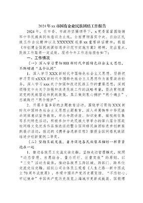 2024年xx市国有企业民族团结工作报告2024年,在市委、市政府坚强领导下,x党委紧紧围绕铸牢中华民族共同体意识为主线,全面贯彻落实中央、自治区民族工作会议精神以及XXXXXX视察xx重要讲话精神,根据《市创建全国民族团结进步示范市实施方案》精神,突出重点,民族工作取得一定成效。现将今年工作总结报告如下:一、工作情况(一)深入学习贯彻XXX新时代中国特色社会主义思想,不断增进五个认同1.深入学习XXX新时代中国特色社会主义思想。坚持把学习贯彻xXXX新时代中国特色社会主义思想作为首要政治任务,深入学习xxx关于加强和改进民族工作的重要思想,深刻领悟党中央关于加强和改进民族工作的战略考量,坚决贯彻落实党的民族理论和民族政策,真正做到衷心拥护两个确立、忠诚践行两个维护。2.开展丰富多彩的主题教育活动。围绕学习贯彻XXX新时代中国特色社会主义思想主题教育,深入开展铸牢中华民族共同体意识宣传教育,举办专题讲座、知识竞赛、微视频征集等系列特色活动,积极参加中央民族大学举办的第六届全国高校网络文化优秀作品推选活动暨全国网络民族团结进步创新案例展示活动,报送的《携手奋进新征程》荣获全国网络民族团结进步创新案例二等奖。(二)坚持互嵌发展,着力促进各民族像石榴籽一样紧紧抱在一起1.推动各族员工交流交往交融。坚持走动管理模式,按照动态管理、自愿结合、量力而行、注重实效的原则,以三交