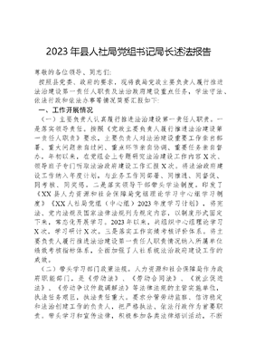 2023年县人社局党组书记局长述法报告尊敬的各位领导、同志们:按照县党委、政府的要求,现将我局党政主要负责人履行推进法治建设第一责任人职责及法治政府建设重点任务,学法守法、依法行政和依法办事等情况简要汇报如下:一、工作开展情况(一)主要负责人认真履行推进法治建设第一责任人职责。一是落实领导责任。按照《党政主要负责人履行推进法治建设第一责任人职责》要求,主要负责人对法治建设重要工作亲自部署、重大问题亲自过问、重点环节亲自协调、重要任务亲自督办,年初以来,在党组会上专题研究法治建设工作内容X次、领导班子专门听取法治政府建设工作汇报X次。将法治政府建设工作纳入年度计划,与业务工作同部署、同推进、同督促、同考核、同奖惩。二是落实领导干部带头学法制度。印发了《XX县人力资源和社会保障局党组理论学习中心组学习制度》《XX人社局党组(中心组)2023年度学习计划》,将宪法、党内法规及国家法律法规列为规定内容,以制度形式固定下来,常态化开展学习。2023年以来,共组织中心组理论学习X次,学习研讨X次。三是落实工作实绩考核评价体系。将主要负责人履行推进法治建设第一责任人职责情况纳入所属单位绩效考核指标体系,全面加强了人社系统法治政府建设工作的成效。(二)带头学习部门政策法规。人力资源和社会保障局作为政府职能部门,是《劳动法》、《劳动合同法》、《就业促进法》、《劳动争议仲裁调解法》等法律法规的主管实施单位,执法任务艰巨,执法责任重大。要求分管劳动监察、信访稳定和法治创建工作的负责人,把严格执法、依法行政作为首要职责。带头学习和宣传法律,积极参加各类法律培训活动,不断增强法治观念和法律意识;带头落实执法责任制,依法行使职权,加大执法力度,提高执法水平。自觉摆正位置,虚心接受企业和劳动者的监督;及时处置上级部门交办的和其他各类信访案件,及时办理人大、政协提案议案,并通过办理代表建议和人民群众来信来访,更好地改进自身工作。(三)依法行政,营造良好执法氛围。为提高文明执法服务水平,提升工作效能,要求劳动监察大队和劳动争议仲裁院力争做到四坚持:一是坚持以思想教育为核心,提高文明执法的认知度。做到学习教育制度化、经常化,努力打造一支学习型劳动保障行政执法队伍。二是坚持以提升作风效能为根本,贴心服务企业。严格落实制度管理和纪律监督,加强勤政廉政建设,规范执法行为,提升队伍执行劳动保障法律法规的能力和服务水平。坚持以人为本,积极落实热情服务、主动服务、文明服务的工作要求,不断提升执法队伍形象。三是坚持以服务创新为基础,提高文明执法力度。积极探索切实可行的新措施、新方法,建立符合企业和群众需要的服务管理长效机制。四是坚持以主动预防为目标,提高文明执法水平。通过种类咨询活动和送法入企等方式积极宣传劳动保障法律法规宣传活动X场次,发放各类宣传材料XXXX余份,接受群众咨询XXX余人次,提高劳动者的维权意识,同时,在日常巡查和案件查处过程中,遵循教育与处罚相结合的原则,宣传劳动保障法律法规,进一步规范了辖区内企业的劳动用工管理行为。2023年1月-12月,通过全国根治欠薪线索反映平台转交线索XXX条,其中办结XXX条;通过XX根治欠薪线索反映平台转交线索X条,办结X条;通过12345政务反映平台转交线索XXX条,办结XXX条;共立案X件,涉及人数XXX人;协调处理案件XX件,追发劳动者工资待遇XXXX万元,涉及劳动者XXX人,未出现群体性事件、极端事件;移交公安机关X件,涉及金额XXXXXX元;申请法院强制执行X件;接待群众来电来访XXXX人次;共检查用人单位XX户,涉及劳动者X万人。加强劳动人事争议多元处理工作,依法调解劳动人事争议案件。通过坚持抓规范、抓制度、抓培训、抓机制、抓分析,努力提高劳动人事仲裁案件办理质量,案件处理情况,共受理案件XX件,其中案外调解XX件;不予立案XX件;申请人撤诉X件,立案XX件,结案XX件,结案率100%,其中调解成功XX件,调解成功率为85.45%,裁决XX件。涉及金额XXX万元。共受理工伤认定申请共计XXX件,截至目前共工伤认定XXX件(含2022年遗留),不认定工伤X件,不予受理X件,主动撤回申请X件,死亡案件X件,现正办理中X件。行政复议X起(未有结论),行政诉讼有X起,(不予受理案件,现均在高院审查中),确保受伤职工及时得到基本救治和依法获得经济补偿,保障了劳动者合法权益。二、依法办事,帮助企业持续发展结合部门职责和工作职能,开展送法到企业活动,一是开展指导服务。将《劳动合同法》印发成册发至各类企业经办人员手中,使大家熟悉、了解《劳动合同法》的各项条款,促进企业与员工劳动关系的更加融洽,为企业的发展奠定了一定的基础。二是加大管理指导力度。对全县企业的用工管理情况进行了清理、完善,提高了劳动合同的签订率。同时针对存在问