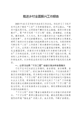 推进乡村全面振兴工作报告2023年12月召开的中央农村工作会议,传达学习了习近平总书记关于做好三农工作的重要指示。总书记指出,推进中国式现代化,必须坚持不懈夯实农业基础,推进乡村全面振兴,要学习运用千万工程经验,因地制宜、分类施策,循序渐进、久久为功,集中力量抓好办成一批群众可感可及的实事。总书记的重要指示,站在党和国家事业全局高度,阐明了推进乡村全面振兴的战略要求和主攻方向,为做好新时代新征程三农工作提供了根本遵循和行动指南。做好三农工作,必须深入贯彻落实总书记重要指示精神,锚定建设农业强国目标,把推进乡村全面振兴作为新时代新征程三农工作的总抓手,以学习运用千万工程经验为引领,找准切入点和突破口,推进乡村全面振兴不断取得实质性进展、阶段性成果,以加快农业农村现代化更好推进中国式现代化建设。一、以学习运用千万工程经验引领乡村全面振兴习近平总书记在浙江工作期间,亲自谋划、亲自部署、亲自推动千万工程,经过20多年持续努力,不仅深刻改变了浙江农村的整体面貌,更为推进乡村全面振兴作出了先行探索和示范引路。千万工程是学习贯彻习近平新时代中国特色社会主义思想、学深悟透习近平总书记关于三农工作的重要论述最生动最鲜活的案例教材。以学习运用千万工程经验为引领,有力有效推进乡村全面振兴,具有深厚的实践支撑和深远的战略意义。千万工程创造了整省全域推进乡村全面振兴的成功样本。千万工程最早从整治农村环境、解决农民群众反映最强烈的环境脏乱差问题入手,由点及面,不断扩容建设。从千村示范、万村整治引领起步,到千村精品、万村美丽深化提升,再到千村引领、万村振兴迭代升级,千万工程的范围不断拓展、内涵不断丰富,已经成为涵盖农村经济、政治、文化、社会、生态文明建设和党的建设在内的一项系统性工程。20多年来,浙江省把千万工程作为三农工作的主抓手、推动山乡巨变的总引擎,持之以恒、久久为功,实现了浙江乡村由脏乱差到农业强、农村美、农民富的精彩蝶变。千万工程经验,生动诠释和回答了建设什么样的乡村、怎样建设乡村这一历史性课题,为推进乡村全面振兴、加快农业农村现代化提供了实践样本。千万工程经验具有普遍的借鉴意义和旺盛的实践活力浙江省在推进千万工程过程中,形成了一套系统成熟、行之有效的发展理念、工作方法和推进机制。比如,坚持一张蓝图绘到底,稳扎稳打、久久为功;坚持以人民为中心,从农民群众期盼中找准工作的出发点和落脚点;坚持系统观念,统筹推进城乡发展和建设;坚持因地制宜、分类施策,培育壮大乡村富民产业;坚持党建引领、大抓基层,不断加强和改进乡村治理;等等。乡村振兴各方面工作都能从中找到相对应的可学可鉴的实践参考。同时也要看到,浙江省推进千万工程经历了不同阶段,不同的市县也有不同的基础和条件,但贯穿其中的理念、思路和方法是相通的。不管是东部还是中西部,不管是发达地区还是相对欠发达地区,都可以借鉴千万工程经验,找到适合自身发展振兴的路子。千万工程经验的灵魂和精髓在于蕴含其中的理念方法学习运用千万工程经验,不是要原封不动照抄照搬浙江某个点上的具体做法,更不能脱离实际搞一窝蜂,关键是学深悟透千万工程经验蕴含的理念方法,因地制宜转化运用到乡村振兴全过程各领域。要把学习运用千万工程经验作为深入贯彻落实习近平总书记关于三农工作的重要论述的实践载体,紧密结合各地发展阶段、发展条件等客观实际,创造性开展工作,从农民群众反映强烈的实际问题出发,进一步明确推进乡村全面振兴抓什么、怎么抓,不断提高工作实绩实效。这也是检验学习运用千万工程经验成效最根本最重要的衡量标准。二、深刻把握推进乡村全面振兴的主攻方向和重点任务贯彻落实习近平总书记关于三农工作的重要论述和重要指示精神,按照中央农村工作会议部署,当前和今后一个时期,推进乡村全面振兴的工作重点,可以概括为两个确保、三个提升、两个强化。粮食安全是国之大者。2023年,我国粮食产量再创历史新高,连续9年保持在1.3万亿斤以上,发挥了安民心、稳大局的压舱石作用。图为2023年10月31日拍摄的广西柳城县古砦仫佬族乡云峰村稻田景色。新华社发黎寒池/摄(一)两个确保:确保国家粮食安全,确保不发生规模性返贫确保国家粮食安全。2023年,在党中央、国务院的坚强领导下,我们战胜了黄淮罕见烂场雨、东北华北局地严重洪涝、西北局部干旱等较为严重的灾害影响,实现了农业丰产丰收。粮食总产量达到13908.2亿斤,再创历史新高,连续9年稳定在1.3万亿斤以上,发挥了安民心、稳大局的压舱石作用。面对今后各种风险挑战和不确定性,必须始终把保障粮食和重要农产品稳定安全供给摆在首要位置,确保14亿多人的饭碗端得更稳更牢。稳定粮食播
