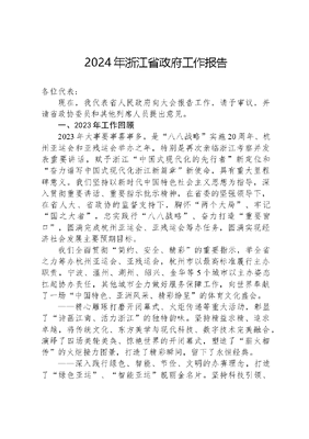 2024年浙江省政府工作报告各位代表:现在,我代表省人民政府向大会报告工作,请予审议,并请省政协委员和其他列席人员提出意见。一、2023年工作回顾2023年大事要事喜事多,是八八战略实施20周年、杭州亚运会和亚残运会举办之年,特别是再次亲临浙江考察并发表重要讲话,赋予浙江中国式现代化的先行者新定位和奋力谱写中国式现代化浙江新篇章新使命,具有重大里程碑意义。我们坚持以新时代中国特色社会主义思想为指导,深入贯彻重要讲话、重要指示批示精神,在省委的坚强领导下,在省人大、省政协的监督支持下,胸怀两个大局、牢记国之大者,忠实践行八八战略、奋力打造重要窗口,圆满完成杭州亚运会、亚残运会筹办任务,圆满实现经济社会发展主要预期目标。我们全面贯彻简约、安全、精彩的重要指示,举全省之力筹办杭州亚运会、亚残运会,杭州市以最高标准履行主办职责,宁波、温州、湖州、绍兴、金华等5个城市以主办姿态扛起协办责任,其他城市全力做好服务保障工作,向世界奉献了一场中国特色、亚洲风采、精彩纷呈的体育文化盛会。——精心雕琢打磨开闭幕式、火炬传递等重大活动,彰显了诗画江南、活力浙江的独特韵味。坚持精益求精、追求卓越,将传统文化、东方美学与现代科技、数字技术完美融合,演绎了四场美轮美奂、惊艳世界的开闭幕式,塑造了薪火相传的火炬接力图景,打造了精彩瞬间,留下了永恒经典。——深入践行绿色、智能、节俭、文明的办赛理念,打造了绿色亚运、智能亚运靓丽金名片。坚持科技引领、绿色优先、节俭办赛,充分发挥我省数字经济先发优势,首创数字火炬手、数字人点火等场景应用,打造了首届碳中和亚运会和首个大型无废赛事。——强化办好一个会、提升一座城,改善了城市环境面貌和人民群众生活品质。坚持以赛兴城、办赛惠民,全省域开展城市品质、城市治理、城市文明三大提升行动,城乡面貌焕然一新,市民素质不断提升,社会治安秩序良好,实现了成功办赛与城市发展双丰收。——用心用情用力保障各项赛事圆满顺畅举行,展现了高效服务、专业办赛的一流水准。坚持严、精、细、实工作标准,扎实做好安全保障、竞赛组织、宾客接待、亚运村管理、交通抵离、餐饮医疗、气象电力等全链条全环节服务,实现了零事故、零纰漏、零延误,得到了各国运动员和宾客的一致好评。——全面用好亚运这一舞台,讲好中国故事、传递中国声音,展示了中国力量。坚持胸怀全局、服务大局,以亚运之窗向世界展示了八八战略指引下浙江发生的精彩蝶变,展示了新时代推进中国式现代化的万千气象,展示了新时代中国特色社会主义思想的实践伟力。——广泛汇聚各方力量,激发了团结协作、昂扬奋进的精气神。坚持全省一盘棋、拧成一股绳,广大干部群众倾情投入,3.76万名志愿者无私奉献,亚运宣传出新出彩,浙江体育健儿夺得了51枚亚运金牌和53枚亚残运金牌,均居全国首位,进一步激发了全省人民顽强拼搏、锐意进取的奋斗干劲。回顾8年筹办历程,无数人为之默默奉献,许多事让人感动至深。在此,我代表省人民政府,向所有为杭州亚运会、亚残运会付出心血、智慧和汗水的参与者,致以崇高的敬意!面对错综复杂的外部环境,面对多重挑战叠加的严峻考验我们坚持把高质量发展作为首要任务,坚持稳中求进工作总基调,完整、准确、全面贯彻新发展理念,积极融入和服务构建新发展格局,坚持问题导向、底线思维,主动应变、精准施策、务实进取,强力推进创新深化改革攻坚开放提升,以三个一号工程为总牵引,启动实施十项重大工程,有力推动经济稳进向好、社会安定有序,充分展示了经济大省勇挑大梁的使命担当。一是经济运行持续回升向好,全面完成全年主要目标任务全省生产总值增长6%;规上工业增加值增长6%,固定资产投资增长6.1%,社会消费品零售总额增长6.8%,出口增长3.9%,实际使用外资增长4.8%,其中制造业使用外资增长85.8%;一般公共预算收入增长7%;城镇和农村居民人均可支配收入分别增长5.2%、7.3%;居民消费价格上涨0.3%,城镇调查失业率为4.6%,均好于预期目标。二是8+4经济政策体系精准高效,有力发挥了引导保障作用。坚持集中财力办大事,通过大力度整合优化提升,构建8+4经济政策体系,安排省级财政资金1006.8亿元,支持经济持续回升向好。为市场经营主体减负3300亿元以上,各项贷款余额增长14.2%,其中制造业中长期贷款余额增长31%。积极争取和用好国家政策,新增地方政府专项债券占全国份额7%;推动351个项目纳入国家用地保障范围,保障重大项目用能指标3793万吨标准煤。三是千项万亿重大项目扎实推进,有力支撑了扩大有效投资。坚持以项目看发展论英雄,启动实施扩大有效投资千项万亿工程,1244个重大项目完成投资12976亿元。嘉兴鱼腥脑航道、白鹤滩输浙特