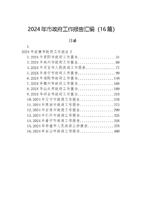 2024年市政府工作报告汇编(16篇)目录1.2024年安康市政府工作报告22.2024年贵阳市政府工作报告.313.2024年林州市政府工作报告.604.2024年灵宝市人民政府工作报告775.2024年南宁市政府工作报告.996.2024年祁阳市政府工作报告1407.2024年衢州市政府工作报告1688.2024年汕头市政府工作报告1899.2024年四会市政府工作报告21810.2024年万宁市政府工作报告..24811.2024年延安市政府工作报告..27312.2024年自贡市政府工作报告..29913.2024年仁怀市政府工作报告..32514.2024年普宁市政府工作报告..34815.2024年华蓥市人民政府工作报告.37816.2024年台山市政府工作报告..4002024年安康市政府工作报告各位代表:现在,我代表市人民政府向大会报告工作,请予审议,并请市政协委员和其他列席人员提出意见。一、过去一年工作回顾2023年是新冠疫情防控转段后经济恢复发展的一年。全市上下坚持稳中求进工作总基调,努力克服经济运行承压、结构调整阵痛、矛盾交织叠加等困难,实现地区生产总值增长1.7%。——我们以高质量项目推进年活动为牵引,夯筑发展基础。突出四个一批关键举措,分类施策掀起建设热潮。前瞻谋做实储备。根据全国全省战略规划、重大政策、投资导向、产业布局谋划包装项目,组织五轮次重点项目征集,在线审批核准备案项目6388个,入库专项债券项目206个,申报增发国债项目397个。强保障高效建设。精心组织重点项目集中开工和季度观摩,西渝高铁等重大项目稳步推进,中央厨房等产业项目建成运营,张石大道等市政项目投入使用。40个省级重点项目、402个市级重点项目均超额完成年度投资计划。加油干稳健提质。项目建设拉动固定资产投资增长0.3%,带动先行指标持续向好,金融机构存贷款余额增长8.1%和11.4%,客货运周转量增长0.6%和3.4%,工业用电量增长6.1%,财政一般公共预算收入增长12.3%。——我们以营商环境突破年活动为载体,凝集发展力量。建立周三亲商助企日制度,落实惠企纾困措施和营商环境保障。拓平台交流合作。成功举办国际茶日等重大活动29场次,对接落实央企国企、帮扶单位合作130项,深化常州安康对口协作50项,深度融入西安都市圈达成7个领域战略互动。全方位招商引资。组建4个区域驻地招商联络处,外派288支招商小分队,千人百城万企招商引进项目650个,归雁经济引育实体1552个。练内功创出亮点。行政审批联合报装综窗项目管家服务等模式在全省推广。安康政务诚信评价全省优秀,非公经济占比全省第一,营商环境满意度全省第一。石泉荣获国务院大督查综合督查激励。——我们以干部作风能力提升年活动为抓手,清除发展梗阻。市政府领导联县(市、区)督帮,县处级领导包企业抓项目,在调结构、稳增长中强本领、转作风。严调度抓纲带目。突出重点抓、抓重点,建立经济运行和污染防治、城市管理、生态旅游等重点工作定期专题调度机制,累计组织一线工作调度88次,整合力量解决堵点难点问题1173个。自加压推动倍增。千方百计壮大产业发展基础,研究部署科技型企业、绿色工业、生态渔业、林业产业、电子商务五大倍增计划,扎实推动产业发展由量变向质变跃升。综合治攻克难题。摸排消除安全生产风险2.17万项;绿色矿山建设整改隐患3174个,整改率99.9%;保交楼11015套,完成率94%;排查整治违规坟墓1.37万座;依法处置9个非法集资问题;治乱拆违2万余平方米,积弊多年的兴安市场消防安全隐患等得到有效整治。一年来,还做了七个方面工作:(一)重点产业融合破局。旅游拉动消费升温。生态旅游三年三千行动稳步实施,毛绒玩具+文旅主题活动引流强劲,旅游接待人数较疫情前水平增长9.9%。电商网络交易额、零售额分别增长18.8%、23.4%。安康壹号海外仓投入运营,全市进出口总额20.2亿元、增长26.5%,社会消费品零售总额增长1.9%。现代物流启动综合枢纽建设规划编制,消费电子围绕智能终端制造全链优化。工业经济结构调整。淘汰落后产能,清理空壳企业,盘活国有资本,进一步夯