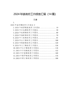 2024年镇政府工作报告汇编(14篇)目录1.2024年岱西镇政府工作报告22.2024年道滘镇度政府工作报告..193.2024年东坑镇政府工作报告.394.2024年杜楼镇政府工作报告.605.2024年临岐镇政府工作报告.706.2024年六祖镇政府工作报告.817.2024年水口镇政府工作报告1008.2024年烟溪镇政府工作报告1209.2024年义门镇政府工作报告13610.2024年长沙镇政府工作报告..14611.2024年中岗镇政府工作报告..15212.2024年中堂镇政府工作报告..16813.2024年敬仲镇政府工作报告..17614.2024年黄江镇政府工作报告..1862024年岱西镇政府工作报告各位代表、同志们:现在,我代表镇人民政府向大会报告工作,请各位代表审议,并请列席会议的同志提出宝贵意见。一、2023年度工作回顾2023年是全面贯彻党的XXX精神的开局之年,是八八战略实施20周年。面对新形势新任务新要求,我们坚持以XXX新时代中国特色社会主义思想为指导,深入学习贯彻XXXXXX考察浙江重要讲话精神,在县委、县政府和镇党委的坚强领导下,在镇人大的监督支持下,紧紧依靠全镇干部群众,牢牢把握高质量发展要求,统筹推进稳增长、促改革、调结构、惠民生、防风险、保稳定各项工作,发扬马上就办、真抓实干的工作作风,经济运行稳进向好,社会大局和谐稳定2023年全镇实现规上工业产值40.7亿元,同比增长43.29%,完成固定资产投资24.2亿元,实现财政总收入3.22亿元,同比增长61.94%,其中地方财政收入2.02亿元,同比增长25.24%。这一年,我们坚持项目带动、优化服务,以改革攻坚积蓄经济发展新势能。围绕全省三个一号工程目标要求,全力以赴抓项目、扩投资,加快推进项目建设,服务保障绿色石化基地和经济开发区,高质量发展根基更加牢固。保障重点项目坚定有力。深入实施项目攻坚年行动,优先保障重大项目用地需求,推动前期政策处理工作加力提速。S201公路岱山浪激咀至双合段改建工程房屋拆迁100%签约,顺利完成前岸、后岸、双合土地征收及青苗补助工作。稳妥协调岱北水厂政策处理,有力保障重大项目无障碍施工。前岸110千伏输变电工程、牛山片区全面完成征地工作,为鱼山绿色石化基地配套设施建设打下坚实基础。主攻招商引资成果丰硕。优化政策机制,出台完善招商引资奖补细则,发挥绍台温和石化产业链招商专班作用,精准开展延链补链强链招商。坚持引进来、走出去,全年组织外出招商19次,接待客商25次,招引市外资金2.7亿元,完成10家企业落地,涵盖石化、新材料、生产性服务业等各领域。优化营商环境细致入微。组建岱西商会,多渠道、全方位深入企业开展助企纾困行动,全年累计走访企业159家次,协调解决华丰船厂近海锚地建设与航道政策处理等制约企业发展的问题136个。全面落实稳企惠企一揽子政策,新增企业减税降费2.8亿元,帮助重点企业争取贷款授信5000万,为项目落地保驾护航。这一年,我们坚持产业牵引、要素驱动,以提质赋能打开转型升级新局面。始终把经济发展的着力点放在实体经济上,盘活存量、培育增量、提升质量,提速新旧动能转换。工业经济提能升级。优质创新资源加快集聚,浙江润和催化一期、佳瑶新材料等一批打破国外技术垄断的先进制造业项目建成投产,高强高模碳纤维、世倍尔催化剂等2个10亿元以上的重大制造业项目落地开工。中科院宁波材料所岱山新材料研究和试验基地正式投用,岱山新材料科创园建设初具规模。依托激光制造应用创新中心,宁兴船舶与航天三江集团合作研发的国内首台套激光大板幅切割生产线成功上线投产。华丰船舶立足行业特点和自身管理特色,着力研发信息化项目,提升科技附加值。全年规上工业企业研究开发费用同比增长92.19%。扎实推进凤凰涅槃和腾笼换鸟攻坚行动,岱源建设等3家企业成功升规,整合提升8家低效企业,工业经济韧性和潜力进一步增强。龙头企业发展势头强劲,鼎盛石化获2023年度岱山县工业行业龙头企业,和泰船舶、宁兴船舶、中裕燃气等3家企业荣获2023年度岱山县人民政府质量奖。农业基础夯实巩固。传统农业转向现代化、规模化、品牌化发展,青黑170亩蔬菜基地农艺农机融合示范项目建成并投入运营。火箭农场7000亩现代农业产业园初