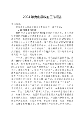 2024年克山县政府工作报告各位代表:我代表县人民政府向大会报告工作,请予审议。一、2023年工作回顾2023年是全面贯彻党的XXX精神的开局之年、是三年新冠疫情防控转段后经济恢复发展的一年。面对政治生态修复、经济下行、旱涝灾害等多重困难挑战,我们坚持以XXX新时代中国特色社会主义思想为指导,深入贯彻落实XXXXXX视察我省期间的重要讲话重要指示精神,在省市和县委的坚强领导下,聚焦落实县委六个新突破,持续解放思想、真抓实干、负压前行,经济社会发展各项工作稳步提升。预计地区生产总值实现75.4亿元,同比增长3%。一年来,我们持之以恒强基础,现代农业迈出新步伐。聚焦11345目标任务,统筹发展四个农业,争当现代农业排头兵。扛牢粮食安全责任。大豆种植面积连续两年保持在195万亩左右,圆满完成稳粮稳豆任务,粮食总产达14.6亿斤、增幅全市第一,实现十六连丰。成功争取全国大豆绿色高产高效行动示范县、全国大豆单产提升整建制示范县,荣获中国大豆之乡称号。农业基础不断夯实。落实黑土地保护示范区122万亩、轮作休耕101万亩,新建高标准农田6.5万亩,实施一喷多促120万亩,农药化肥使用量三连降。打造绿色食品基地235万亩,新增绿色食品标识2个。生产体系规范升级。推进大垄规模经营120万亩、占全县耕地总面积40%,落实垦地共建面积2.7万亩。新增市级示范合作社2家、家庭农场10家。我县顺利完成国家级家庭农场质量提升整县推进试点任务,经验做法全省借鉴。产业振兴加快推进。围绕主导产业发展,落实高标准、专品种马铃薯、大豆、鲜食玉米、汉麻等基地22万亩。协同推进农产品初加工和精深加工,规上农产品加工产值实现6.95亿元。华源食品公司被评为全国农业标准化示范基地。现代农业大基地、大企业、大产业建设迈出坚实步伐。一年来,我们千方百计提质量,产业发展实现新突破。下大决心、花大力气招商引资,县级领导以上率下带队招商,乡镇部门揭榜领旗尽锐出战。成功举办招商推介活动40余次,树立对外品牌形象。全年签约项目13个、金额43.5亿元。实际利用内资、外资总量全市第三,外贸进出口总值增长291%,全市第一。马铃薯产业提速发展。云一农业、北大荒全粉、薯丰公司扩能生产,年加工马铃薯14.9万吨,增长5%,实现产值2.1亿元,吸引众多加工企业意向落户,集聚效应日益凸显。大豆产业持续发力。华源大豆一期项目达产,产值增长74.2%。成功签订3000万美元豆饼粉生产订单、开拓外贸市场。二期项目加快建设,将实现产值2.1亿元。中北晟昊一期项目建成投产,年销售大豆10万吨。鲜食玉米产业蓄力赋能。8家鲜食玉米企业抱团取暖、成立产业联盟,5家鲜食玉米基地被市委确定为2023年预制菜产业示范基地,仁发合作社和新兴立成入选2023年第三批全国名特优新农产品名录。新能源产业加快布局。国电投垃圾发电项目即将投产,日消纳垃圾600吨。国电投200兆瓦风电项目成功落地,总装机规模将达到31.1万千瓦。特色产业初具规模。鸿景公铁海联运物流园项目成功签约。高起点编制包装印刷产业发展规划,B2、C区加快建设,盛润工贸、润彩纸箱入驻投产,形成集纸浆、造纸、纸箱上中下游产业于一体的园内循环发展模式。一年来,我们多措并举促消费,商贸服务培育新动能。把恢复和扩大消费摆在优先位置。坚持月月有活动、季季有热点、全年可持续,累计发放消费券90余万元,撬动社会消费558万元,带动新增限上企业5户、大个体3家,社零额实现11.55亿元,增长10%。县域商业体系建设扎实推进,整合县域电商、快递、商贸业态,升级改造新经济产业园,推动电商、文可居文库——海量学习资料,手机电脑下载www.wenkeju.com物流产业集聚发展。电商品牌加快培育,精选县有好商品7类35种。全年电商企业突破500家,年交易额达2.45亿元,增长14%。一年来,我们蹄疾步稳抓改革,创新驱动迸发新活力。以科技创新引领产业发展,新增高新技术企业1户、省级创新平台1个。数字化转型不断提速,新增上云企业253户。深化国资国企改革,国有企业营收增长39%。城乡交通运输一体化改革经验全省交流,开通公交线路32条,122个行政村全覆盖,票价平均降幅20%以上,被评为全国第三批城乡交通运输一体化示范创建县。产教融合改革迈出扎实步伐,职教中心挂牌成立乡村振兴、食品产业学院,开办华源畜牧定向培训班、职普融通实验班,为企业订单式输送人才。一年来,我们坚定不移优生态,绿色发展筑牢新优势。驰而不息打好三大保卫战。打好蓝天保卫战。严格执行秸秆全面禁烧,疏堵结合推动以用促禁,综合利用率达90%,空气质量优良天数达300天。清洁取暖改造10600户,让群众干净温暖过冬。打好碧水保卫战。严守水资源保护三条红线,集中式饮用水