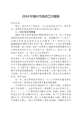 2024年横州市政府工作报告各位代表:现在,我代表市人民政府,向大会报告政府工作,请予审议,并请各位政协委员和列席会议的同志提出意见。一、2023年工作回顾2023年是全面贯彻党的XXX精神开局之年,是三年新冠疫情防控转段后经济恢复发展的一年,也是横州市十四五时期力争跻身全国综合实力百强县(市)的深化之年。XXXXXX时隔两年再次亲临广西、视察南宁,让我们倍感温暖、深受鼓舞、信心倍增,我们一定要把对XXX的崇敬爱戴转化为干事创业的实际行动,以忠诚之志、感恩之心、担当之为,撸起袖子加油干,以一域之光为全局添彩!一年来,全市上下坚持以XXX新时代中国特色社会主义思想为指导,深入贯彻落实XXXXXX对广西重大方略要求,认真贯彻落实自治区和南宁市的部署要求,在市委的正确领导下,以学习贯彻XXX新时代中国特色社会主义思想主题教育为强大动力,以强市梦凝聚人心,充分发挥平陆运河起点城市、南宁东部新城重要组团、世界茉莉花都三城叠加优势,守正创新、苦干实干,推进强市高质量发展,经济社会发展稳中有进、回升向好。这一年,我们聚焦经济建设这一中心工作和高质量发展这一首要任务,续写新时代强市高质量发展新篇章。全市地区生产总值完成356.07亿元、增长4.5%,总量稳居南宁市县域第一、全区县域前列,增速高于自治区和南宁市。其中,一、二、三产增加值分别增长4.7%、3.3%、5.0%。农林牧渔业总产值达183.12亿元、增长4.9%。第三产业增加值超160亿元,创历史新高。规上工业增加值增长5.2%,建筑业总产值增长5.5%,一般公共预算收入增长52.22%,金融机构存贷款余额增长14.02%,居民人均可支配收入名义增长6.1%。六景镇、横州镇上榜2023镇域经济西部50强。横州市正以健步向前的姿态奋进全国综合实力百强县(市)。这一年,我们坚持向海图强、开放发展,在服务和融入新发展格局上展现更大作为。主动融入平陆运河经济带建设,围绕共建西部陆海新通道服务南宁市建设面向东盟开放合作的国际化大都市和中国—东盟跨境产业融合发展合作区,用3个月时间率先在平陆运河沿线完成368户拆迁任务,有力保障平陆运河(横州段)全线开工建设,顺利转入集中安置区统规统建阶段,策划推进55个总投资39.1亿元的平陆运河新城(新福镇)项目。横州大桥运行通车,百万花乡人民期盼已久的大桥梦得圆,开创了在全区由县级财政自主建设公路桥梁的先例。南横高速直通城区,成功改写了城区没有大桥、不通高速的历史,南玉高铁、上横高速、横钦高速等项目加快推进。横州市开放发展动能澎湃、潮头正劲。这一年,我们积极融入南宁一体两翼产业发展格局,以扎实遒劲的步伐迈向千亿工业强市。接续攻坚南宁东部新城六景工业园区开发建设三大会战,土地保障、项目建设、产城融合全面推进。六景工业园区连续两年征地超万亩,规上工业总产值完成146.54亿元、增长7.7%,总量占南宁东部新城60%以上。电池新材料产业园、六景化工园区建设提速,太阳纸业一期技改项目竣工,宸宇富基等强链项目落地开工,新能源、新材料、精细化工等临港产业加速聚集。全市拥有181家规上工业企业,其中产值超亿元企业71家、增长6%。工业增加值增长5.7%,创近十年来新高,工业对GDP增长的贡献率达24.76%。工业投资完成57.62亿元,位居南宁市第二,占全市固定资产投资34.63%,较上年提高2.86个百分点。横州市高质量发展其势已至、其兴可期。这一年,我们发挥世界茉莉花都比较优势,奋力书写花乡文可居文库——海量学习资料,手机电脑均可下载www.wenkeju.com人民美好幸福愿景。按照富民、活企、强市、兴文化、美生态的发展思路,持续壮大茉莉花1+9产业集群。成功引进浙江仙居、深圳新荣阳等7家茉莉花加工行业头部企业,茉莉花加工企业集聚规模不断扩大。茉莉花产业综合总产值达162.9亿元、增长6.7%。茉莉鲜花每斤单价创历史新高。横县茉莉花茶入选全国第二批地理标志助力乡村振兴典型案例。《茉莉花》食品安全地方标准正式发布实施,从源头破解了茉莉花不能作为食品原料的瓶颈。成功举办第五届世界茉莉花大会。中华茉莉园获评国家4A级旅游景区。横州茉莉花(茶)综合品牌价值达222.15亿元、连续五年成为广西最具价值农产品品牌。横州茉莉花正以其独特魅力绽放新时代光彩。莫道君行早,更有早行人。一年来,我们一刻也不敢怠慢不敢停歇,一路耕耘、一路向前,用一处处变化、一处处跨越,努力践行对全市人民的承诺,在服务经济社会发展大局中作出了横州贡献!(一)狠抓实体经济,聚力当好战斗员,发展基础更加坚实优化调度指挥。强化经济指标监测预警,实行日调度、周分析、月报告、季督导,经济运行调度更加精准有效。出台壮大实体经济调研服务方案,解决了一批制约企业发展的问题
