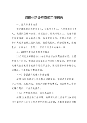 组织生活会党支部工作报告一、党支部基本情况党支部现有正式党员X人,预备党员X人,入党积极分子X人,党员队伍结构合理,素质良好。设党书记X人,支部书记政治觉悟高,政治敏感性强,热爱党的工作,政策水平高。支部广大党员能服从组织决议,热爱党组织,政治觉悟高,爱岗敬业,从政治上、思想上、行动上与党中央保持一致。二、2022年度问题查摆整改情况XX公司党支部根据2022年组织生活会问题查摆情况,主要存在以下问题:党内活动与业务工作关联不够紧密;党支部在党建促业务发展中发挥作用还不充分。通过原因分析和结合实际情况,主要有以下整改措施:(一)全面落实党建工作责任制按照2022年组织生活会整合问题清单,落实好责任明晰、分工明确、纵向到底、横向到边的责任体系,确保党建工作职责履行到位、工作质效提升。(二)树牢理想信念,强化忠诚担当按照XX集团党委工作部署,持续深入的认真学习XXX新时代中国特色社会主义思想和党的XX大精神,不断提高政治领悟力、政治判断力和政治执行力,进一步坚定四个自信,树牢四个意识,坚决做到两个维护,更加自觉地在思想上、政治上、行动上与以XXXXXX为核心的党中央保持高度一致。注重学习实效,采取集中学习、专题研讨、党课带学、主题宣讲等多种形式,提升学习效果,不断用党的最新理论指导实践、推动工作。(三)充分发挥党支部战斗堡垒、党员先锋模范带头作用XX公司党支部持续发挥支部战斗堡垒作用,发挥党员先锋模范带头作用,压实党建促业务发展责任。要求每一名党员要对照党章、党员权利与义务,对照如何帮带非党员,要经常性的开展支部内党员自我批评,促使党员发现问题、解决问题,发挥作用。2023年7月,XX公司党支部围绕集团评优机制和评优标准,在党组织内部公开推优选优,获得两优一先荣誉称号。(四)进一步加强党风廉政建设认真落实党风廉政建设责任制,细化目标,分解责任,严格考核,强化责任追究。加强监督,使每名党员自警、自爱、自强、自省,充分发挥好共产党员的先锋模范作用。(五)组织开展党建联建共建按照食品集团三联三亮三评党建项目载体的工作要求文可居文库——海量学习资料,手机电脑均可下载www.wenkeju.com为进一步实现以高质量党建引领企业高质量发展,XXXXXX公司与XXXXXX公司、XXXXXX公司签订党建共建协议,全面形成开展好党建工作的强大合力。三、对照排查,查摆问题短板根据主题教育专题和集团党委有关文件要求,XX公司党支部通过个别访谈、自我剖析和征求意见等方式,对党建工作情况进行了深入的调研和深刻的剖析。现将党建工作现状、存在的问题及整改措施报告如下:(一)主要问题1、党员队伍人数较少。XX公司党支部于2021年8月份成立,发展至今不足3年时间,现有正式党员X人,存在人数少规模小的问题,虽能确保党建工作的覆盖面,但参与率和贯彻率有所欠缺,不利于各项党建工作的正常开展。2、党内活动与业务工作关联不够紧密。没有充分发挥统一思想指导工作的有效性。将党的理论与思想,融于工作的思想指导当中,明确思路,统一思想,高站位、明要求是对具体工作的有效保障,但在具体经营工作与党建工作的紧密结合度上有待进一步提升。(二)下步工作思路和主要措施1.重视党员队伍建设,推动党组织建设标准化文可居文库——海量学习资料,手机电脑均可下载www.wenkeju.comXX公司以党员队伍标注化为着力点,加强基层党组织的自身建设,增强党组织的凝聚力和吸引力,不断扩充接收入党积极分子。通过自身党组织的建设,XX公司及时把政治觉悟较高、思想素质较好,愿意用优秀共产党员标准要求自己,自觉申请入党的职工,确定为入党积极分子,并采取集中学习、专题研讨、党课带学、主题宣讲等多种形式,提升学习效果,不断用党的最新理论指导实践、推动工作。从2022年至今,XX公司累计接收入党积极分子X人。同时,致力于充分发挥共青团组织的作用,要求团组织经常向党组织推荐优秀共青团员作为党的发展对象,并逐步形成制度。2.强化队伍融合,创新发展形式要持续加强使命引领和责任担当,要立足本支部工作实际党建工作紧密联系业务工作,在践行三个表率、建设模范党支部上下更大功夫,推动党建工作不断迈上新台阶。强化队伍融合,做到党建和业务工作紧密结合,深度融合,相互促进。围绕企业生产经营实际,不断创新丰富党支部活动形式与内容,多组织开展党员乐意接受、职工群众普遍欢迎、企业切实需要的活动。积极与创先争优相结合、与党员先进性教育相结合、与公司中心业务工作相结合、与支部和党员岗位特点相结合,积极发挥群众优势,多吸纳听取群众意见,扩大职工群众参与文可居文库——海量学习资料,手机电脑均可下载www.wenkeju.com党建工作参与度,真正干出有特色亮点的党务工作。文可居文库——海量学