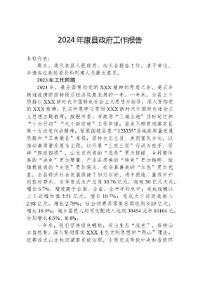 2024年康县政府工作报告各位代表:现在,我代表县人民政府,向大会报告工作,请予审议,并请各位政协委员和列席人员提出意见。2023年工作回顾2023年,是全面贯彻党的XXX精神的开局之年,是三年新冠疫情防控转段后经济恢复发展的一年。一年来,全县上下坚持以XXX新时代中国特色社会主义思想为指导,深入贯彻党的XXX精神,扎实开展学习贯彻XXX新时代中国特色社会主义思想主题教育,按照市委、市政府三城五地目标定位和十大行动九个新突破工作举措,坚定不移贯彻落实县第十五次党代会精神,紧紧围绕县委123335县域高质量发展思路和五美康县布局,坚持生态立县、美丽富民方向,以推动高质量发展为主题,以开展三抓三促行动为抓手,坚持四抓四提,山水自然美的底色更为靓丽、乡村整体美的成色更加厚重、产业品质美的特色更加鲜明、城镇精致美的主色更加突出、社会真善美的本色更加充盈,全县经济社会发展保持了加力向好、进中提速、量质齐升的良好势头。全年完成生产总值30.76亿元,突破30亿元大关,增长6.7%,增速高于全国、全省、全市平均水平;完成规模以上工业增加值2.51亿元,增长10.7%;完成大口径财政收入2.98亿元,增长2.79%;社会消费品零售总额达到9.19亿元,增长10.9%;城乡居民人均可支配收入达到30454元和10104元,分别增长6.5%、8.4%。一年来,我们坚持绿色崛起,突出生态底色,保持山水自然美。深入贯彻落实XXX生态文明思想和两山理论,统筹推进山水林田湖草系统治理,全面完成两轮中央和省级环保督察年度整改任务,办结销号第三轮中央生态环保督察群众举报件3件。坚持四创联动,以高品质生态为高质量发展赋能,成功创建为全省第一批生态文明建设示范区和两山实践创新基地,国家卫生县通过省级初审,康县特邀参加首届气象旅游发展大会,中国天然氧吧创建成功。严格落实河长制和长江十年禁渔要求,持续推进河湖清四乱,建成西汉水水毁维修工程、平洛河河道治理工程及迷坝、碾坝、大南峪等12个村河道治理工程。深入打好污染防治攻坚战,县内各流域断面水质达标率均达到100%,空气质量优良天数高达99%,负氧离子浓度每立方厘米最高达到6万个以上,水质优于Ⅲ类标准,康县被认定为全国第六批节水型社会建设达标县。全省2023年第一季度水利重点工作调度会、全市水土保持重点工程现场观摩会在康县召开。全面推行林长制,完成春季义务植树85万株,建成经济林综合管理示范点31个,建设绿色长廊80公里,持续抓好林业有害生物防治、森林草原防灭火工作,有力保障了森林资源安全。深入开展城乡环境整治行动,引进北控环境公司,规范运营9个垃圾焚烧处理场和15个乡镇污水处理站,完成农村改厕2300座,城市污水处理率达到95%,垃圾无害化处理率达到100%,龙神沟县级野生动物自然保护区入选国家首批陆生野生动物重要栖息地名录,康县再次荣登中国最美县域榜单。生态地灾搬迁有序推进,新建集中安置点6个,793户2911人陆续搬入新居。一年来,我们坚持三个共同,突出治理成色,推动乡村整体美。深入推行陇南民事直说1234工作法,扎实开展整乡推进、整县提升、创新品牌行动,制定下发《关于进一步深化三个共同促振兴机制创建工作的意见》,探索创新共同发展、共同提高、共同致富机制,创新推广微心愿院坝会背包警务等微治理方式,激发了乡村内部活力和群众内生动力,人人参与乡村发展、人人尽力推动发展、人人共享发展成果的生动局面不断形成,崇德向善蔚然成风,乡文可居文库——海量学习资料,手机电脑均可下载www.wenkeju.com村振兴活力加速迸发。扎实开展乡村建设行动,实施农村道路硬化提升、安全生命防护工程、水毁道路修复等各类交通项目120项568公里,提标改造18乡镇39个村的农村饮水安全工程,完成农房抗震改造37户,建成省市级乡村建设示范村12个,长坝花桥村、王坝何家庄村、阳坝油房坝村被认定为省级和美乡村。深入推进万企兴万村行动,康县荣获全省万企兴万村典型示范县称号。2023美丽乡村国际论坛、全国消费帮扶工作现场会观摩调研暨重点企业陇南行活动在康县成功举办,康县的关注度、知名度和影响力持续提升。严格落实四个不摘要求,开展八抓八提升集中行动,推广运用甘肃一键报贫系统,户均落实帮扶措施3.4条以上,防贫保险救助51户126人,落实脱贫人口务工交通补贴538.8万元,输转脱贫劳动力2.78万人,1143户3394人稳定消除返贫致贫风险。严格落实粮食安全和耕地保护党政同责,核实处置耕地和永久基本农田5296亩,实施1.5万亩高标准农田建设和3200亩基本农田建设,完成撂荒地整治1.52万亩,粮食播种面积