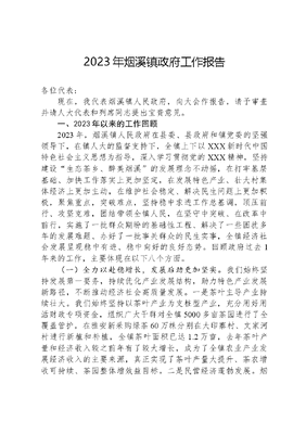 2023年烟溪镇政府工作报告各位代表:现在,我代表烟溪镇人民政府,向大会作报告,请予审查并请人大代表和列席同志提出宝贵意见。一、2023年以来的工作回顾2023年,烟溪镇人民政府在县委、县政府和镇党委的坚强领导下,在镇人大的监督支持下,全镇上下以XXX新时代中国特色社会主义思想为指导,深入学习贯彻党的XXX精神,坚持建设生态茶乡、醉美烟溪的发展理念不动摇,在打牢基层基础、加快工作落实上更加坚定,在发展特色产业、壮大村集体经济上更加主动,在维护社会稳定、解决民生问题上更加积极,聚焦重点,突破难点,坚持稳中求进工作总基调,顶压前行、攻坚克难,团结带领全镇人民,在坚守中突破、在改革中前行,实施了一批群众期盼的基础性工程、解决了一些困扰多年的发展难题、办好了一批事关群众的民生实事,全镇经济社会发展呈现稳中有进、稳中向好的良好态势。回顾政府过去1年来的工作,主要体现在以下八个方面。(一)全力以赴稳增长,发展后劲更加坚实。我们始终坚持发展第一要务,持续优化产业发展结构,助力特色产业发展新路径,不断推动经济社会高质量发展。一是茶叶主导产业持续壮大。我们始终坚持以茶叶产业为支柱型产业,充分用好用活财政专项资金,组织广大干群对全镇5000多亩茶园进行了全覆盖管护,在雅安新采购绿茶60万株分别在大印寨村、文家河村进行新植和补植,全镇茶叶面积已达1.2万亩,去年茶叶产量和经济收入较之前年有了较大增长,成为了全镇农业产业发展经济收入的主要来源,真正实现了茶叶产量大提升、茶农增收可持续、茶园整体增效益目标。二是民营经济蓬勃发展。烟溪村通过2022年招商引资和回引创业引进项目种植蓝莓350亩,均已挂果投产;烟溪村向家坪周德才中药材基地2022-2023年种植天麻300亩,年产值超过280万元;烟溪村群众自主投资兴业发展特色循环养殖项目呈现蓬勃兴旺态势,目前养殖肉牛15头、生猪76头、山羊130余只;白雪垭村通过招商引资,经营业主魏浩在该村发展养殖业,村干部张毅带头发展生猪养殖业,发挥了示范作用;钟凤村积极支持罗村茶业、龙虎山茶业两家知名企业投资兴业,带动村民发展茶产业,解决农民工就近务工的问题,年均实现收入达200余万元;烟溪村村民在巴蜀白茶产业园和芳华农业种植园区就近务工,年均实现务工收入40余万元;全镇共有48家新型农业经营主体落户烟溪投资兴业,带动了群众发展产业增加经济收入。全镇实现了2023年工农业总产值1100万元,同比增长8.7%;农民人均纯收入实现9700元,同比增长15.3%,特色产业发展促进了农民增收,带动了群众脱贫致富。三是集体经济亮点纷呈。大印寨村以开展撂荒地整治为契机,大力发展茶园、大豆、玉米、苦荞、油菜、小麦等特色农产品种植,实现集体经济收入3.5万元;罗张窝村大力发展集体青花椒、茶叶种植近200亩,实施粮经套作种植黄精等中药材300亩,种植小麦200亩,实现村集体经济收入3万元;钟凤村、罗张窝、白雪垭、文家河等村利用财政补助资金分别新建集体肉兔养殖场1200平方米,目前即将投入养殖。钟凤村盘活过去村集体闲置办公阵地,修建茶叶加工厂房800余平方米,购置加工机械30余万元,开展茶叶精深加工,目前已经正式加工营运,预计可实现年均集体经济收入10万元,同时还计划兴办集体酿酒坊1个。其余各村都能依托资源禀赋,因地制宜,发展集体经济主导产业,村村都有集体经济发展途径和项目,1个村集体经济收入超过10万元,2个村集体经济收入超过5万元,其他3村集体经济收入都超过了3万元,经济发展带动了农民致富增收。(二)踔厉奋进谋发展,脱贫成效更加巩固。一年来,我文可居文库——海量学习资料,手机电脑均可下载www.wenkeju.com们始终坚持推进巩固拓展脱贫攻坚成果同乡村振兴的有效衔接,扛牢责任、持续发力,以攻坚的状态、战斗的姿态狠抓工作落实,补齐短板弱项,乡村振兴取得显著成效。一是抓紧抓实防返贫监测和帮扶机制。去年共组织开展两轮防返贫动态监测排查,保质保量完成各类人员的排查和监测户的纳入、消除、管理等工作,并严格按照程序做好后续帮扶,确保了应纳尽纳、应帮尽帮,守住了不发生规模性返贫的底线。二是持续巩固脱贫攻坚成果。严格按照两不愁、三保障和村脱贫摘帽一低五有、户脱贫退出一超六有的脱贫标准,聚焦水、电、路、房、网络和产业发展,开展补短板、强弱项、稳增长行动,因户施策,精准发力,促进脱贫成效得到进一步巩固。三是全面落实各项帮扶政策。精准施策,将医疗卫生、教育、民政等社会保障政策惠及千家万户,确保了全镇贫困人口稳定脱贫不返贫,脱贫成效得到持续巩固。2023年12月上旬,烟溪镇烟溪村顺利接受省级巩固拓展脱贫攻坚成果后评估实地现场考核。(三)强化举措破难题,风险防控更加有力。全镇抢抓建设川陕革命老区振兴发展示范县和乡村振兴战略机遇,