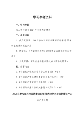 学习参考资料一、学习专题深入学习领会2024年全国两会精神二、参考资料1. 共产党员网:XXX在参加江苏代表团审议时强调 因地制宜发展新质生产力2. 新华社:(两会受权发布)2024年全国两会政府工作报告3. 人民日报:深入实施科教兴国战略(两会近距离) 三、自学内容1.《中国共产党地方委员会工作条例》(略)2.《中国共产党纪律检查委员会工作条例》(略)3.《中国共产党党组工作条例》(略)4.《中国共产党工作机关条例(试行)》(略)XXX在参加江苏代表团审议时强调 因地制宜发展新质生产力共产党员网2024年3月5日中共中央XXX、国家主席、中央军委主席XXX3月5日下午在参加他所在的十四届全国人大二次会议江苏代表团审议时强调,要牢牢把握高质量发展这个首要任务,因地制宜发展新质生产力。面对新一轮科技革命和产业变革,我们必须抢抓机遇,加大创新力度,培育壮大新兴产业,超前布局建设未来产业,完善现代化产业体系。发展新质生产力不是忽视、放弃传统产业,要防止一哄而上、泡沫化,也不要搞一种模式。各地要坚持从实际出发,先立后破、因地制宜、分类指导,根据本地的资源禀赋、产业基础、科研条件等,有选择地推动新产业、新模式、新动能发展,用新技术改造提升传统产业,积极促进产业高端化、智能化、绿色化。江苏代表团审议热烈,气氛活跃。崔铁军、高纪凡、宋燕、吴惠芳、吴新明、孙景南等6位代表分别就实现高水平科技自立自强、推动中国光伏行业高质量发展、加强文化遗产保护传承、建设共同富裕的幸福村、服务长三角一体化发展、弘扬工匠精神等问题发言。XXX不时插话,同大家交流。文可居文库——海量学习资料,手机电脑均可下载www.wenkeju.com在认真听取大家发言后,XXX作了发言。他首先表示赞成政府工作报告,充分肯定江苏经济社会发展取得的新进展新成效,希望江苏坚定信心、鼓足干劲、勇挑大梁,为全国大局作出更大贡献。XXX强调,江苏发展新质生产力具备良好的条件和能力。要突出构建以先进制造业为骨干的现代化产业体系这个重点,以科技创新为引领,统筹推进传统产业升级、新兴产业壮大、未来产业培育,加强科技创新和产业创新深度融合,巩固传统产业领先地位,加快打造具有国际竞争力的战略性新兴产业集群,使江苏成为发展新质生产力的重要阵地。XXX指出,要谋划进一步全面深化改革重大举措,为推动高质量发展、推进中国式现代化持续注入强劲动力。围绕构建高水平社会主义市场经济体制,加快完善产权保护、市场准入、公平竞争、社会信用等市场经济基础制度。完善落实两个毫不动摇的体制机制,支持民营经济和民营企业发展壮大,激发各类经营主体的内生动力和创新活力。深化科技体制、教育体制、人才体制等改革,打通束缚新质生产力发展的堵点卡点。文可居文库——海量学习资料,手机电脑均可下载www.wenkeju.com持续建设市场化、法治化、国际化一流营商环境,塑造更高水平开放型经济新优势。XXX强调,党的十八大以来,我们实施了一系列区域协调发展战略、区域重大战略、主体功能区战略等,为构建新发展格局、推动高质量发展发挥了重要支撑作用。江苏要全面融入和服务长江经济带发展和长三角一体化发展战略,加强同其他区域发展战略和区域重大战略的对接,在更大范围内联动构建创新链、产业链、供应链,更好发挥经济大省对区域乃至全国发展的辐射带动力。XXX指出,要继续巩固和增强经济回升向好态势,提振全社会发展信心,党员干部首先要坚定信心、真抓实干。要巩固拓展主题教育成果,建立长效机制,坚决纠治形式主义、官僚主义,切实为基层减负,激发全党全社会创造活力,提振党员干部干事创业的精气神。要坚持以人民为中心的发展思想,在发展中稳步提升民生保障水平,引导激励广大群众依靠自己的双手创造幸福生活。文可居文库——海量学习资料,手机电脑均可下载www.wenkeju.comXXX最后强调,要抓好安全生产,进一步做好安全隐患排查,强化预警监测,落实应急措施,保障人民群众生命财产安全。两会受权发布|2024年全国两会政府工作报告新华社新华社北京3月12日电政府工作报告——2024年3月5日在第十四届全国人民代表大会第二次会议上国务院总理 李强各位代表:现在,我代表国务院,向大会报告政府工作,请予审议,并请全国政协委员提出意见。一、2023年工作回顾过去一年,是全面贯彻党的XXX精神的开局之年,是本届政府依法履职的第一年。面对异常复杂的国际环境和艰巨繁重文可居文库——海量学习资料,手机电脑均可下载www.wenkeju.com的改革发展稳定任务,以XXX同志为核心的党中央团结带领全国各族人民,顶住外部压力、克服内部困难,付出艰辛努力,新冠疫情防控实现平稳转段、取得重大决定性胜利,全年经济社会发展主要目标任务圆满完成,高质量发展扎实