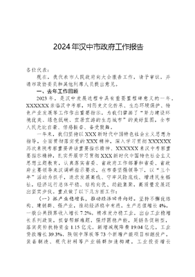 2024年汉中市政府工作报告各位代表:现在,我代表市人民政府向大会报告工作,请予审议,并请市政协委员和其他列席人员提出意见。一、去年工作回顾2023年,是汉中发展进程中具有重要里程碑意义的一年。XXXXXX亲临汉中考察,对历史文化传承、生态环境保护、特色产业发展等工作作出重要指示,为我们擘画了努力建设环境优美、绿色低碳、宜居宜游的生态城市的美好蓝图,全市人民无比自豪、倍感振奋、备受鼓舞。一年来,我们坚持以XXX新时代中国特色社会主义思想为指导,全面贯彻落实党的XXX精神,深入学习贯彻XXXXXX历次来陕考察重要讲话重要指示精神、XXXXXX来汉中考察重要指示精神,扎实开展学习贯彻XXX新时代中国特色社会主义思想主题教育,认真落实省委、省政府工作部署和省委、省政府主要领导来汉调研指示要求,在市委坚强领导下,以三个年活动为抓手,追求发展高线、守牢风险底线、增进民生福祉,经济运行总体平稳、结构向优、动能集聚,高质量发展迈出坚实步伐。重点做了以下几方面工作:(一)抓产业稳增长,推动经济回升向好。坚持不懈优结构、建链群、强产业,推动经济稳中有进,生产总值增长4%,一般公共预算收入增长7.2%。精准发力稳工业,出台工业稳增长系列政策,抓督帮解难题,强纾困稳产能,延链条促转型,落实奖补扶持资金1.15亿元,新增减税降费19.04亿元,工业贷款增长39.3%,陕钢中厚板等73个新增产能项目相继投产,装备制造、现代材料等产业链群加速构建,工业投资增长30%、增速位居全省第二,规上工业增加值增长2.8%,规上工业战略性新兴产业产值增长9.4%,高技术制造业产值增长4.4%。资质等级建筑业总产值增长8.6%,增速位居全省第二。提质增效抓农业,坚守粮食安全底线,找回流出耕地6.7万亩,粮食产量实现二十连丰,油菜制种规模位居全国前列。加快发展五个农业,茶叶、中药材、食用菌、蔬菜产量分别增长5%、27%、15%、5%,建成1794个村级电商网点,洋县、留坝县跻身国家农业绿色发展先行区,西乡县、宁强县、镇巴县入选全国重点产茶县域,南郑区获评国家级水产生态养殖示范区,略阳县被授予全省现代农业全产业链典型县。扩大消费促三产,举办促销活动850余场次,社会消费品零售总额增长6.1%、增速位居全省第三,限上住宿业、餐饮业营业额分别增长24.7%、21.4%。培育直播带货等新业态,网络交易额达441亿元。大力发展文旅产业,创建国家级夜间文旅消费聚集区1处、国家和省级旅游休闲街区2处、省级旅游度假区1处,建成国家级羌族文化生态保护区,汉中藤编、羌绣亮相首届中国非遗年会,新增3个3A级景区,18条旅游线路入选全国全省精品线路,全市累计接待游客4793万人次、实现旅游收入291亿元,我市荣膺文旅融合最佳全域旅游城市和优秀旅居目的地称号,佛坪县入选国家级避暑旅游目的地,宁强县获评全省森林旅游示范县。(二)抓项目强支撑,加速集聚发展势能。坚持不懈抓项目、扩招商、稳投资,不断增强发展后劲。扎实推进项目建设,深入开展高质量项目推进年活动,修正医药健康城等项目加快建设,德容航空智能制造、烟厂技改、陕南医药电商平台等181个项目竣工投产,四〇五项目、2个抽水蓄能电站、汉中750千伏输变电工程等重大项目落地实施,455个市级重点建设项目投资完成率100.1%。稳步提升招商质效,大力开展产业链招商,引进扬子江药业等一批知名企业和延链补链项目,新签约亿元以上项目586个,招商引资到位资金增长22%。持续优文可居文库——海量学习资料,手机电脑均可下载www.wenkeju.com化投资结构,产业投资占62%、民间投资占60%,高技术产业投资增长22.1%,民间投资增长5.9%,固定资产投资增长1.8%、增速位居全省第三。坚持以项目为载体,争取中央和我省各类财政资金466.2亿元、增长9.5%。(三)抓创新促改革,不断激发内生动力。坚持不懈深化改革开放创新,赋能高质量发展。加快创新驱动,建成19个省级科创平台,获得7项省科技奖,认定高新技术企业122家、入库科技型中小企业537家、完成技术合同交易额22亿元,分别增长22%、54.3%、67%,全社会研发投入强度、规上工业企业研发投入强度均位居全省前列。我市创建为国家千兆城市,南郑、镇巴产业园区成功创建省级高新区,航空经开区获评省级军民融合创新示范区。加快重点改革,聚焦投融资、国资国企、行政审批、三资管理等领域创新体制机制,出台市级政府投资项目资金管理办法,汉中金融资产管理公司、汉中农商银行挂牌营运,全市贷款余额增长12.7%、增速位居全省第二。国资在线监管平台建成运行,推出129项一件事一次办改革事项、办理时限压减60%以上,建立市对县(区)转移支付制度,试行自然资源资产所有权委托代理机制,批而未供